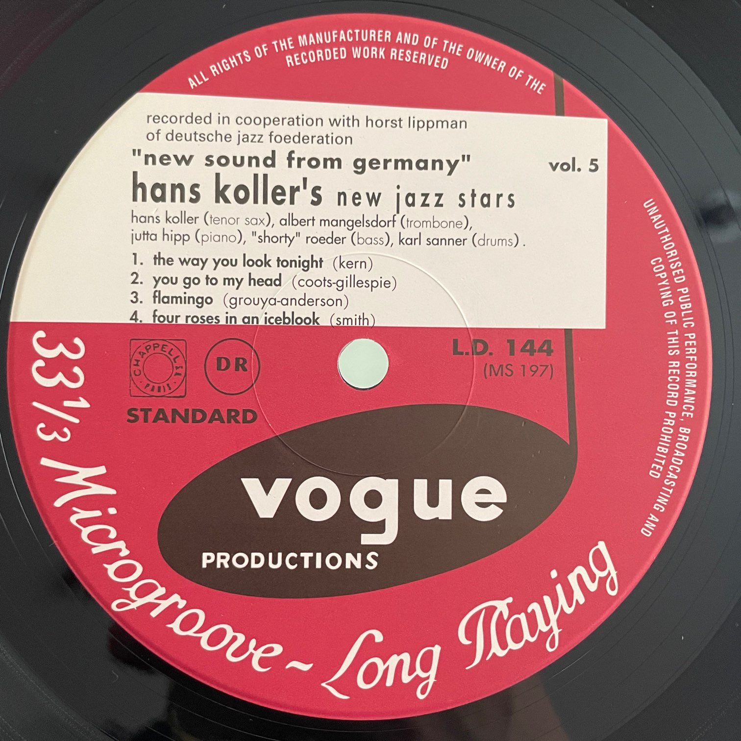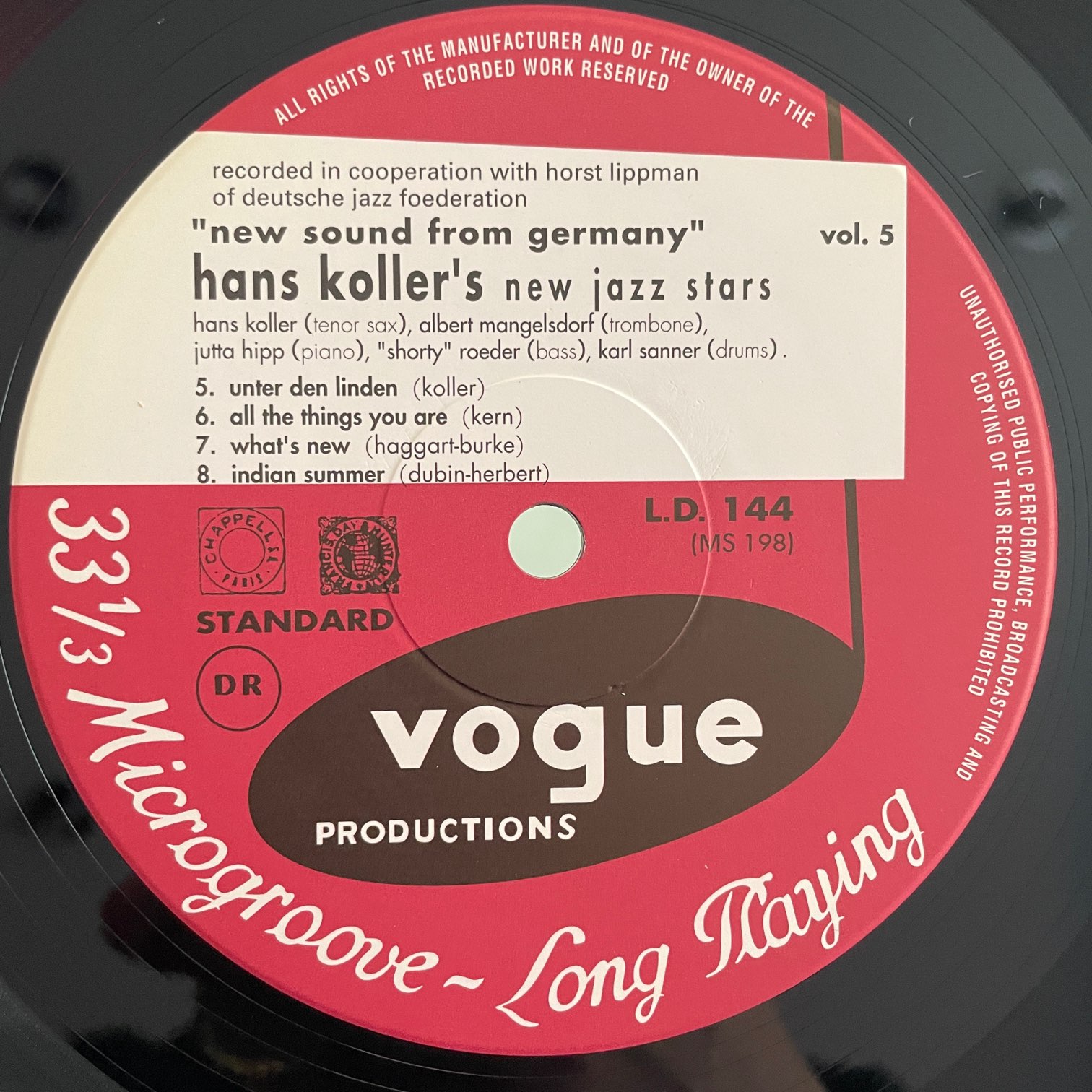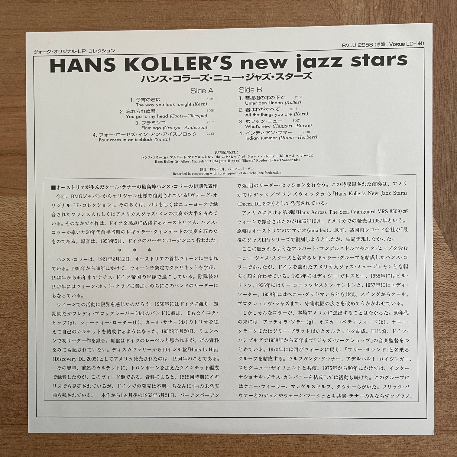 98年vogueからリリースされた日本・再発盤・10インチ。ドイツを拠点に活動しているオーストリアのサックス奏者・ハンス・コラーの初期作品。しかもメンバーが良い。ALBERT MANGELSDORF(TB),JUTTA HIPP(P)が参加していたクインテット時期の録音。