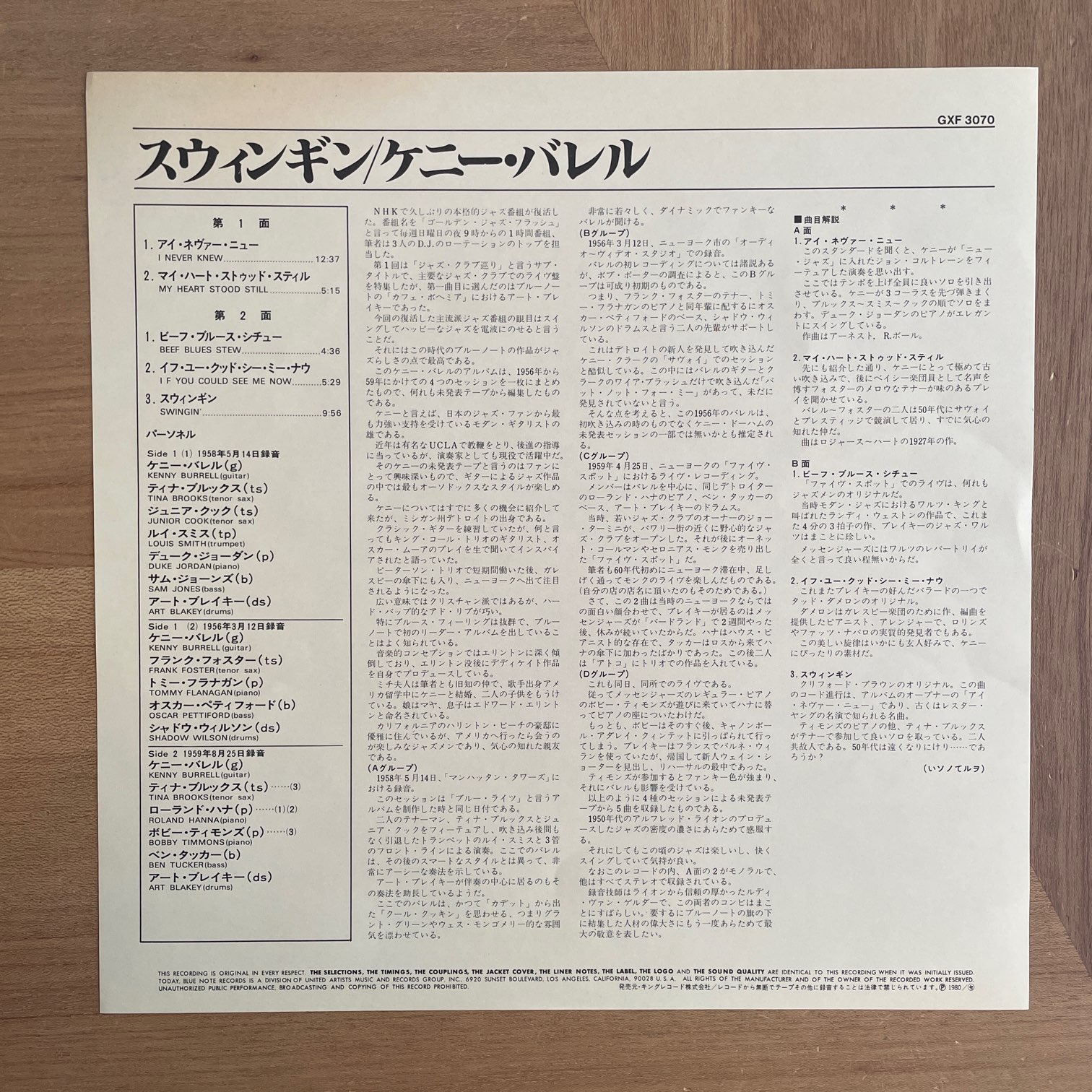 KENNY BURRELL / SWINGIN’ KENNY BURRELL / SWINGIN' / GXF3070 JP ORIG. 80年blue noteからリリースされた日本・オリジナル。未発表シリーズで、当時リリースされたのは日本盤オンリー!!ちなみにA-1は58年、A-2は56年、B面は59年の録音。A-2以外はART BLAKEYがドラムで、流れるようなドラム捌きが気持ちいい。 盤質:A- ジャケット:概ね綺麗です。帯なし。ライナーあり。 試聴 NEVER KNEW https://recordshopgg.com/wp-content/uploads/2025/05/SWINGIN1.m4a MY HEART STOOD STILL https://recordshopgg.com/wp-content/uploads/2025/05/SWINGIN2.m4a (商品コード: 4289) 在庫状態 : 在庫有り ¥5,800(税込) 数量