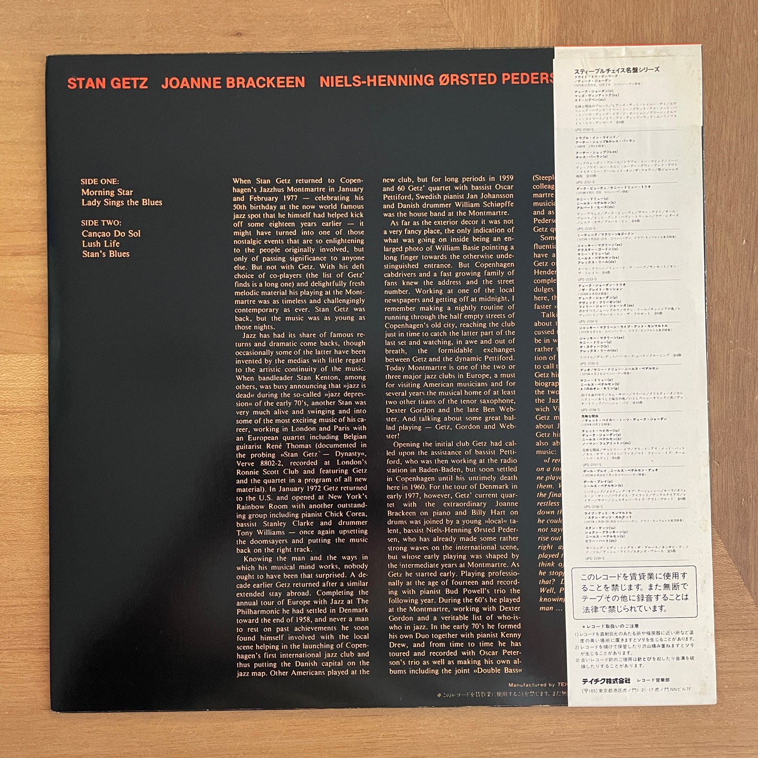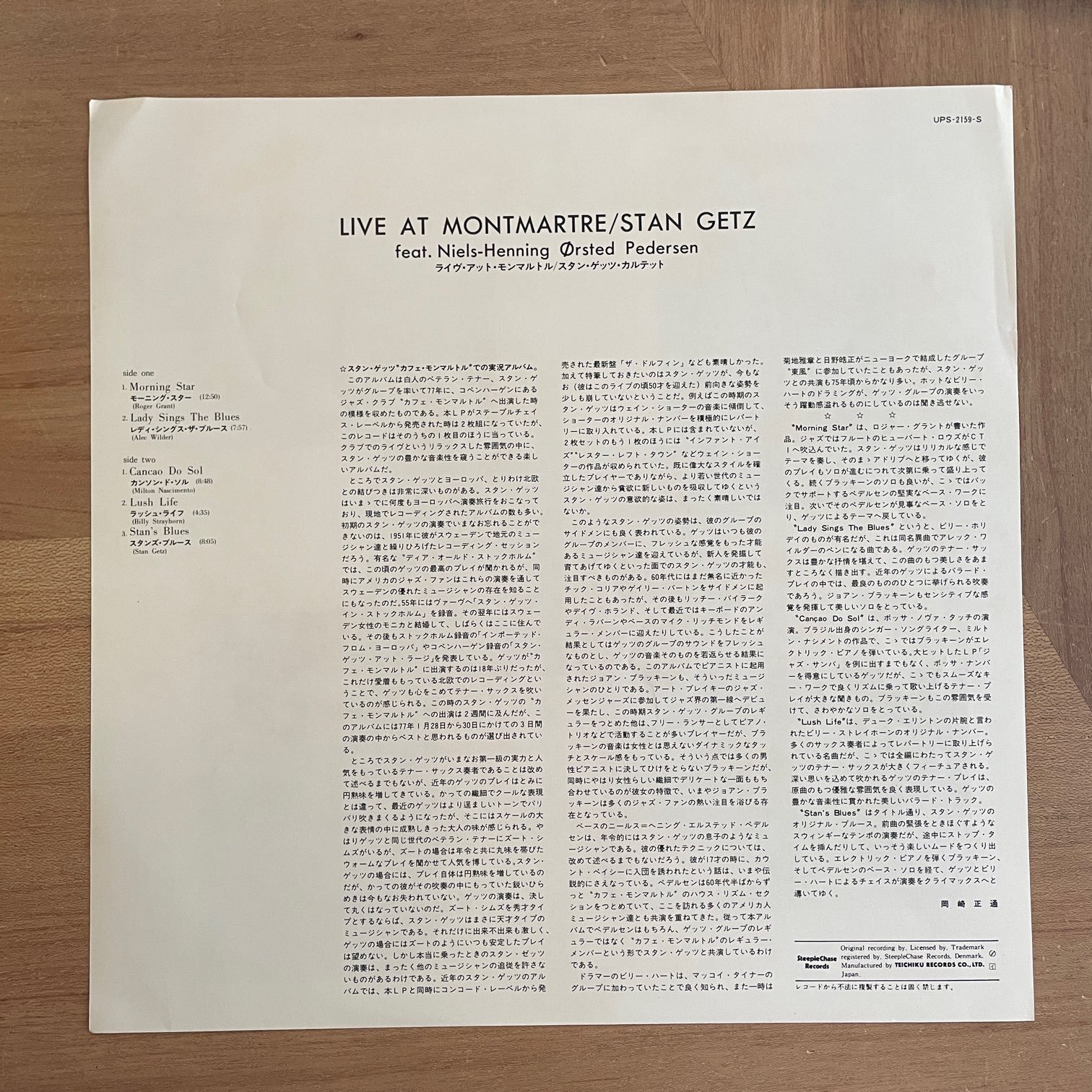 STAN GETZ / LIVE AT MONTMARTRE STAN GETZ / LIVE AT MONTMARTRE / UPS-2159-S JP 77年steeplechaseからリリースされた日本盤。77年コペンハーゲンでのライブ音源。実際は2枚組で日本盤でも2枚組でリリースされてるものもありますが、こちらは2枚組の1枚目の方のみを収録した一枚。JOANNE BRACKEEN,NIELS_H_O_PEDERSEN,BILLY HARTのカルテット。 盤質:A- ジャケット:角軽度スレ、帯裏軽度しみ、ライナーあり。 試聴 CANCAO DO SOL https://recordshopgg.com/wp-content/uploads/2025/10/STAN-GETZ1.m4a STAN’S BLUES https://recordshopgg.com/wp-content/uploads/2025/10/STAN-GETZ2.m4a (商品コード: 4883) 在庫状態 : 在庫有り ¥1,800(税込) 数量