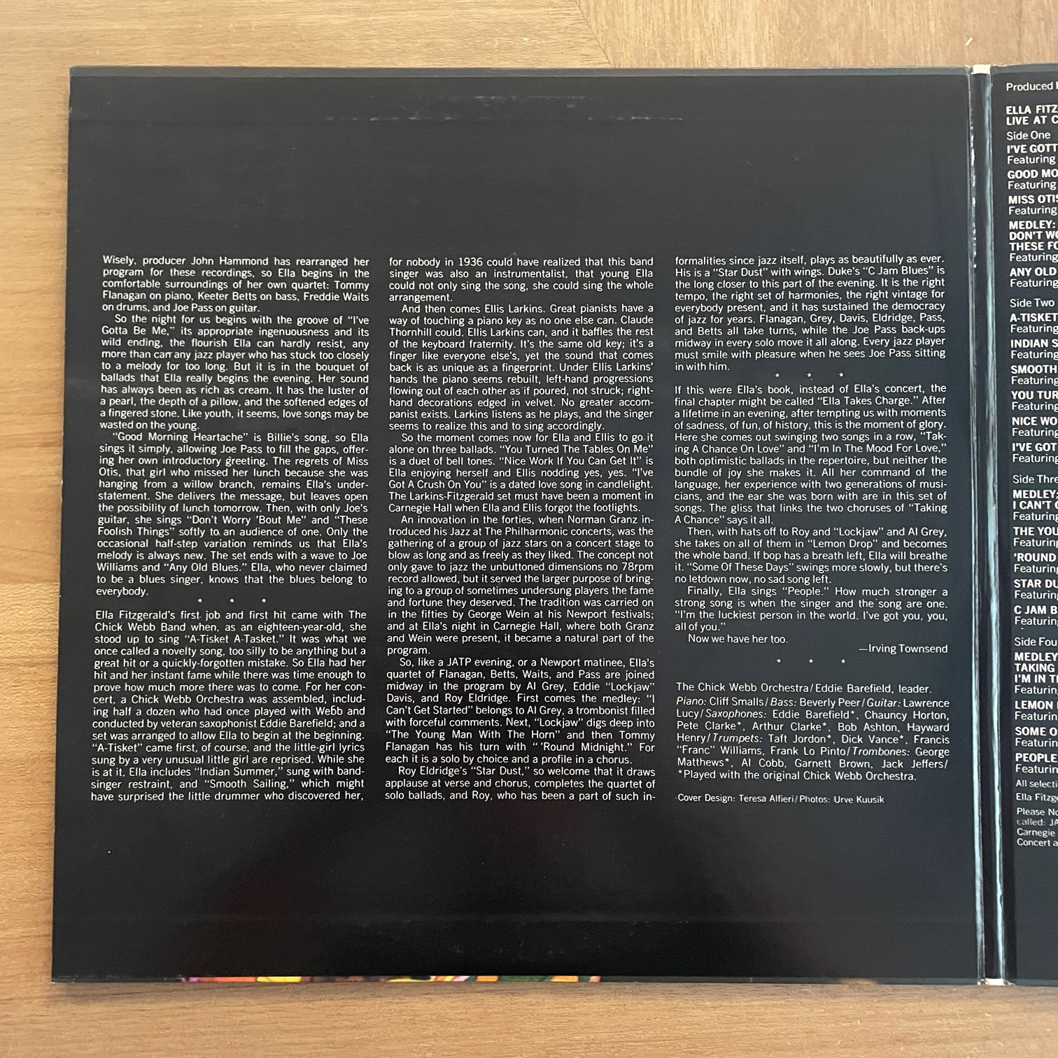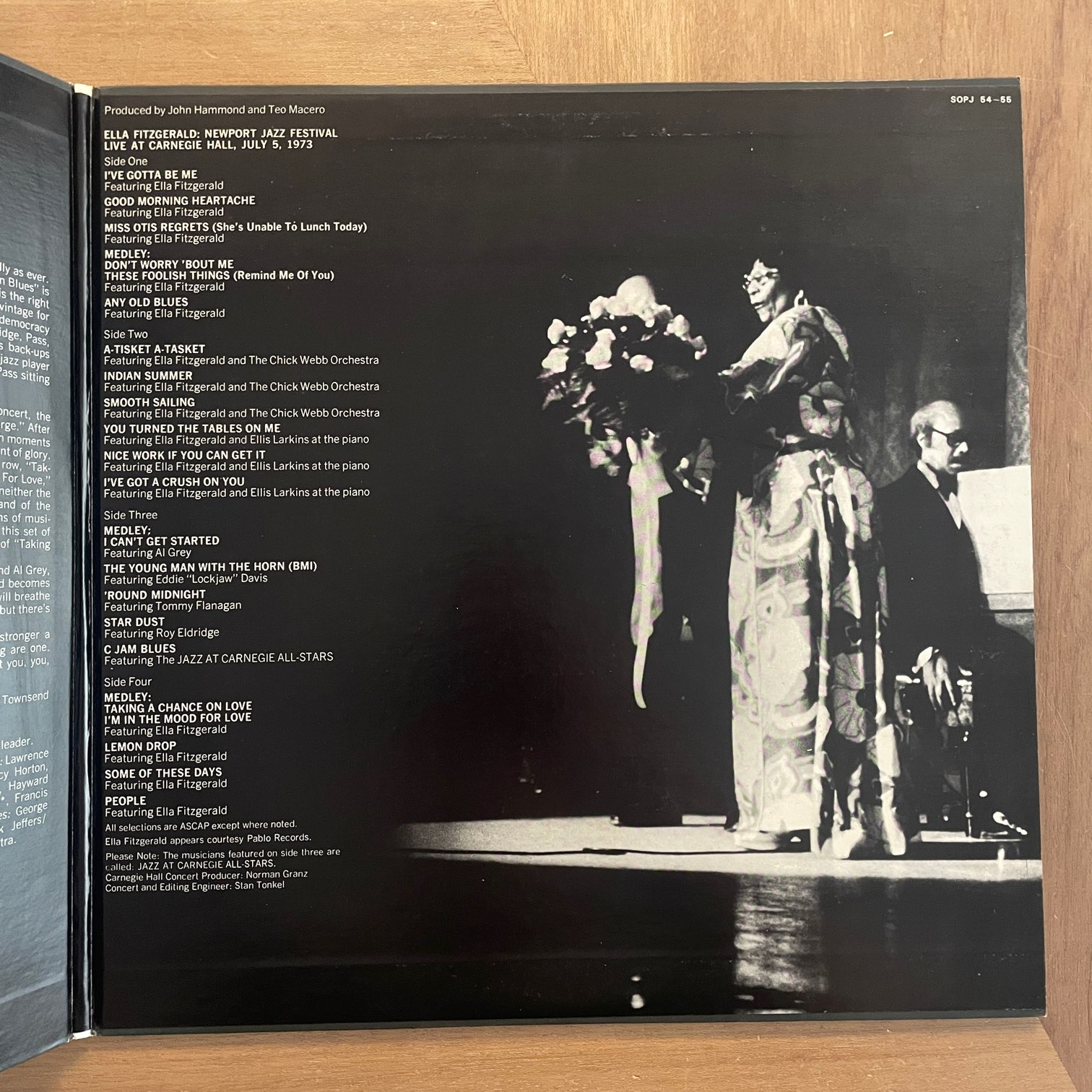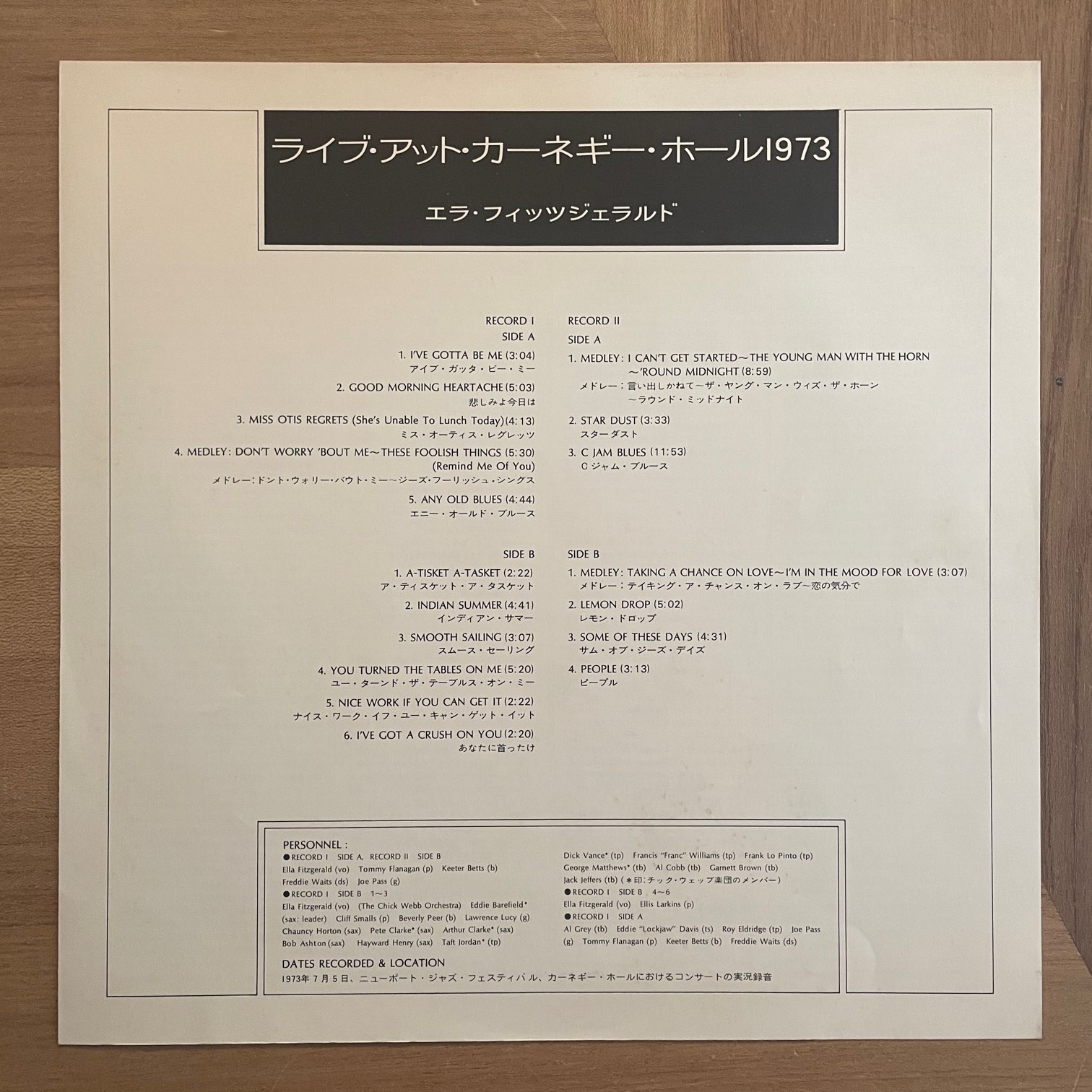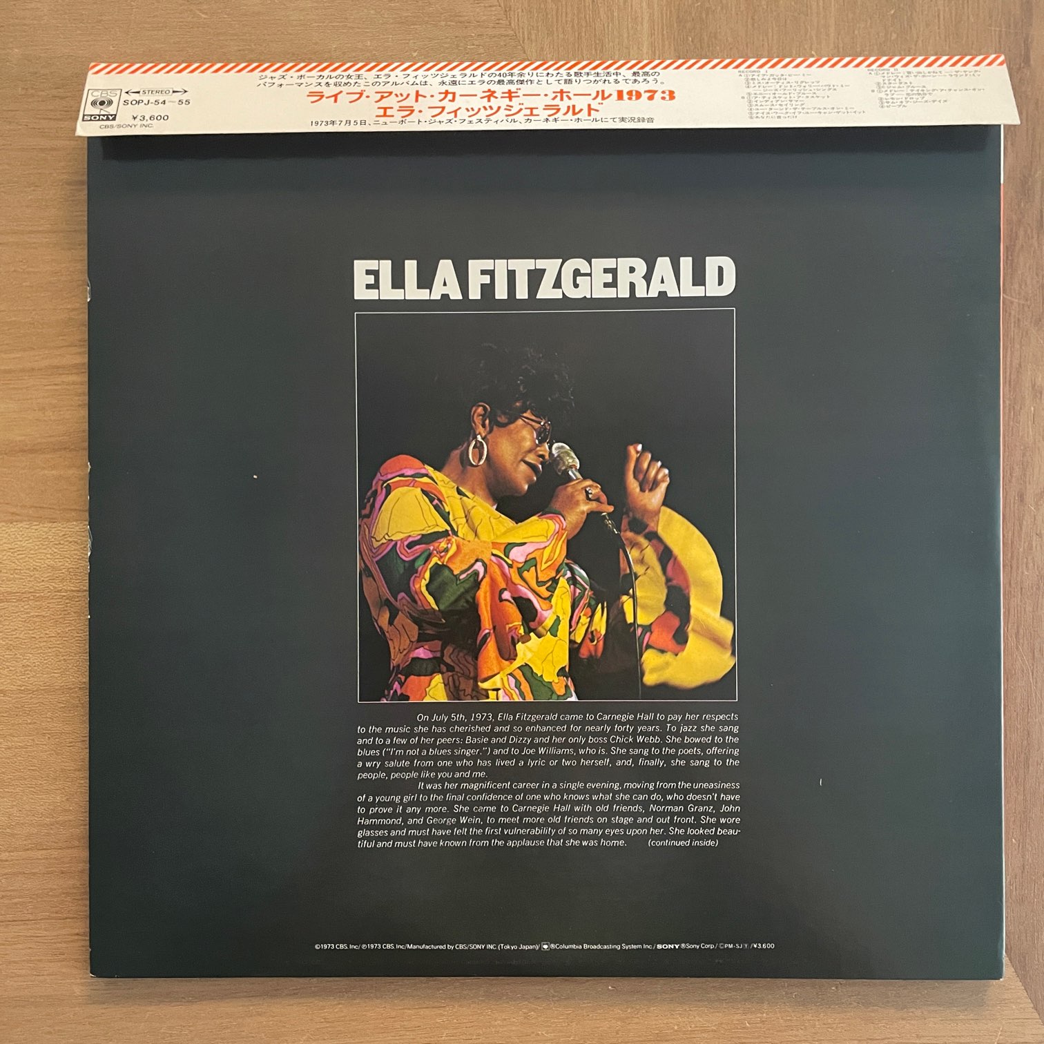 73年cbs/sonyからリリースされた日本盤。73年7月のカーネギー・ホールでのコンサートを2枚組に収録したもので、18曲も収録(2曲はメドレーです)。バックメンバーも曲によって変わったりしてます。TOMMY FLANAGANやELLIS LARKINSがピアノ弾いたり、JOE PASSに変わったり、CHICK WEBB ORCHESTRAがバックについたり。