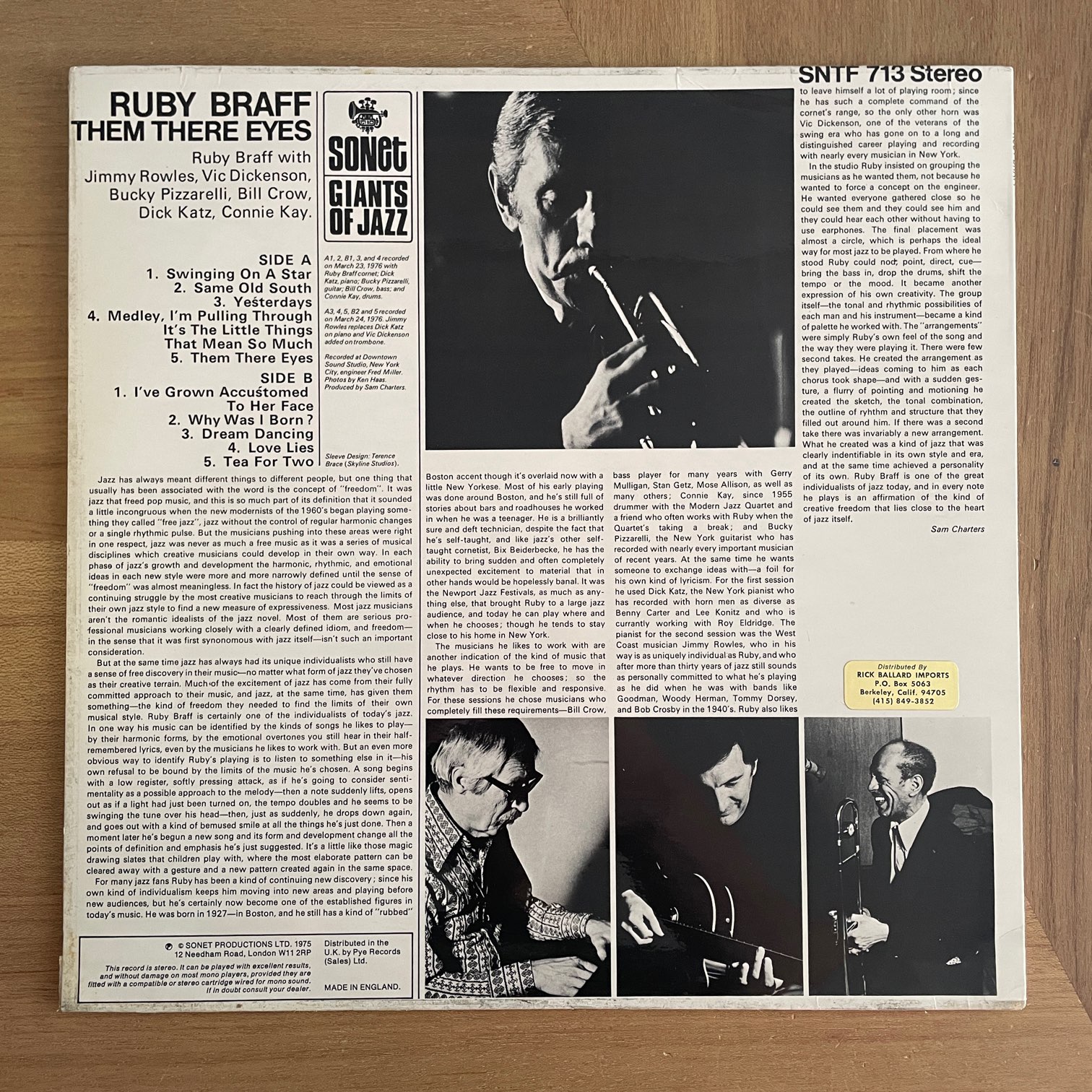 RUBY BRAFF / THEM THERE EYES RUBY BRAFF / THEM THERE EYES / SNTF713 UK ORIG. 76年sonetからリリースされたイギリス・オリジナル。JIMMY ROWLES,BUCKY PIZZARELLI, VIC DICKENSONなどが参加した、ハートウォームなアルバム。 盤質:B+ ジャケット:コーティングジャケ、縁軽度しわ、裏シール。 試聴 SWINING ON A STAR https://recordshopgg.com/wp-content/uploads/2025/10/RUBY-BRAFF1.m4a TEA FOR TWO https://recordshopgg.com/wp-content/uploads/2025/10/RUBY-BRAFF2.m4a (商品コード: 4960) 在庫状態 : 在庫有り ¥1,500(税込) 数量