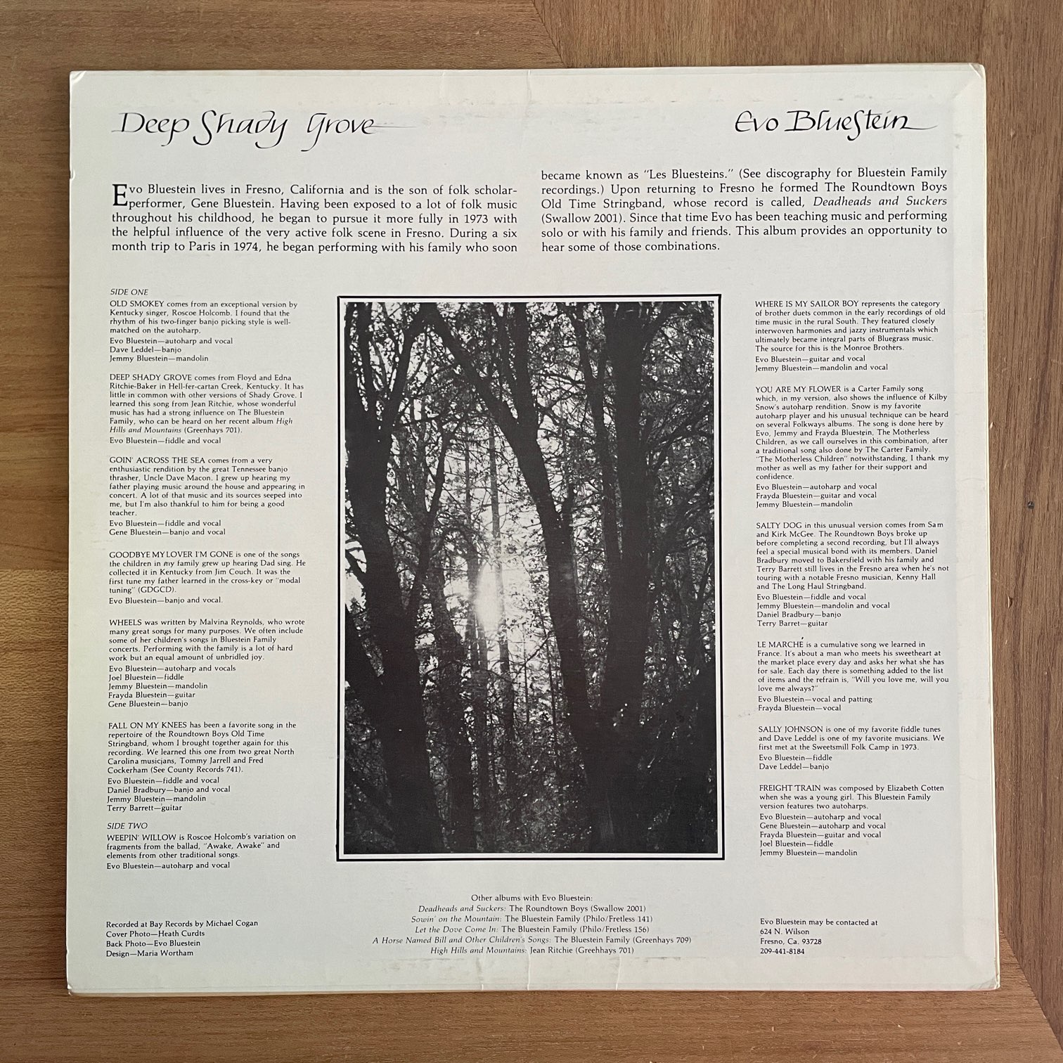 EVO BLUESTEIN / DEEP SHADY GROVE EVO BLUESTEIN / DEEP SHADY GROVE / LP2002 US ORIG. 80年代?swallowからリリースされたアメリカ・オリジナル。カルフォルニアのフォークミュージシャン。フィドルを持ってるジャケットなのでインストかと思いきやほぼボーカル入り。フィドルと同じくらいAUTOHARPを演奏していてそれがとても良いです。他にもバンジョーやギターも演奏してます。 盤質:A- ジャケット:軽度リングウェア、角潰れ。 試聴 WHEELS https://recordshopgg.com/wp-content/uploads/2025/10/EVO-BLUESTEIN1.m4a WEEPIN’ WILLOW https://recordshopgg.com/wp-content/uploads/2025/10/EVO-BLUESTEIN2.m4a (商品コード: 4990) 在庫状態 : 在庫有り ¥2,500(税込) 数量