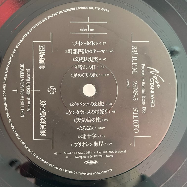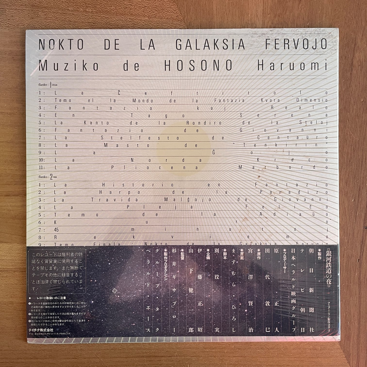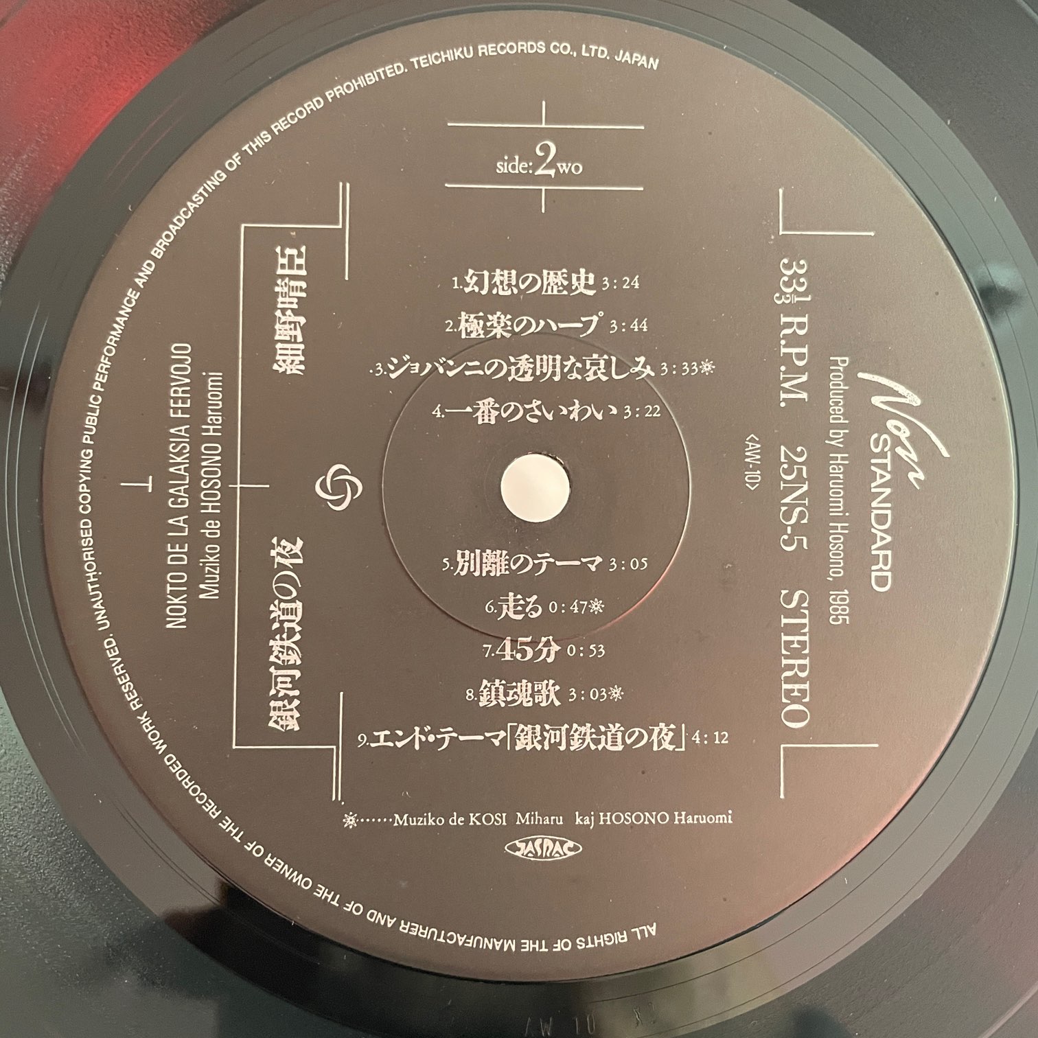 細野晴臣 / 銀河鉄道の夜 細野晴臣 / 銀河鉄道の夜 / 25NS-5 JP ORIG. 85年non standardからリリースされた日本・オリジナル。アニメ映画「銀河鉄道の夜」のサントラ。CDでよく聞いている、聞いてた人もいると思いますが、やっぱりいいです。ジャケットも大きいし、ライナー裏の絵も良い。ポストカードもついてます。 盤質:B+(少しチリつくとこあり) ジャケット:シュリンク付き。天縁・角に軽度スレ。両面少ししみ。ポストカード、ライナー、帯付き。 試聴 ケンタウルスの星祭り https://recordshopgg.com/wp-content/uploads/2025/11/細野晴臣.m4a エンド・テーマ https://recordshopgg.com/wp-content/uploads/2025/11/細野晴臣1.m4a (商品コード: 5072) 在庫状態 : 在庫有り ¥6,800(税込) 数量