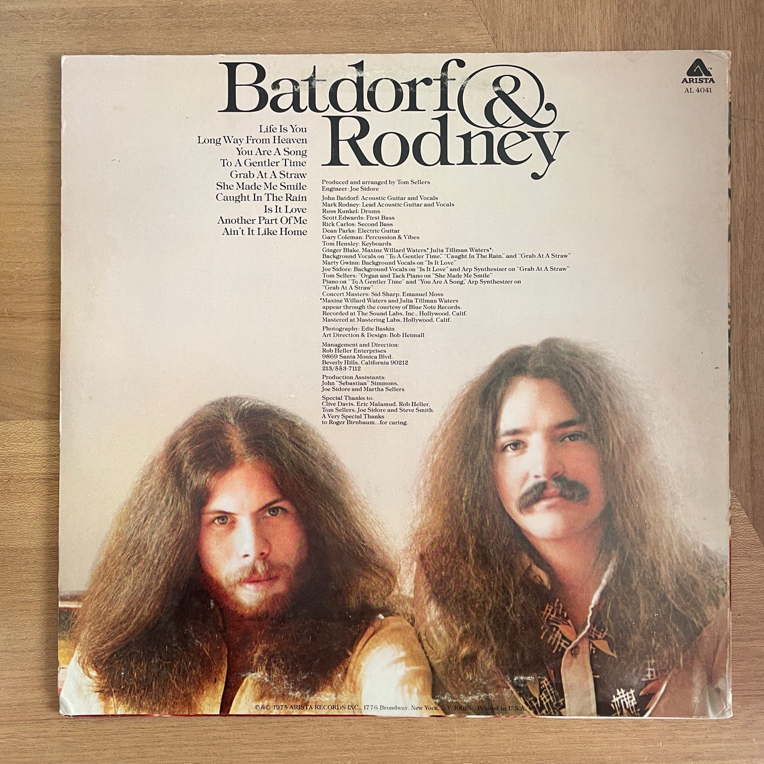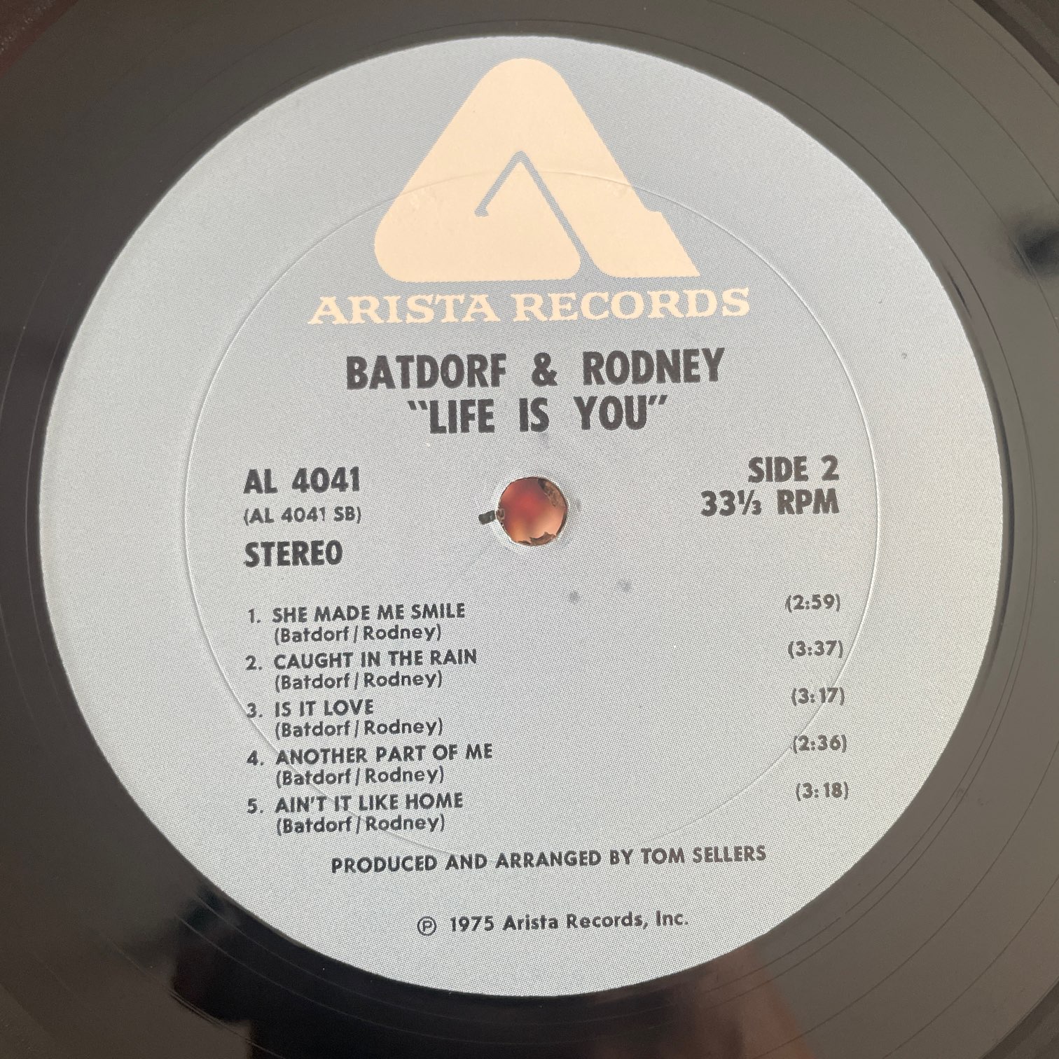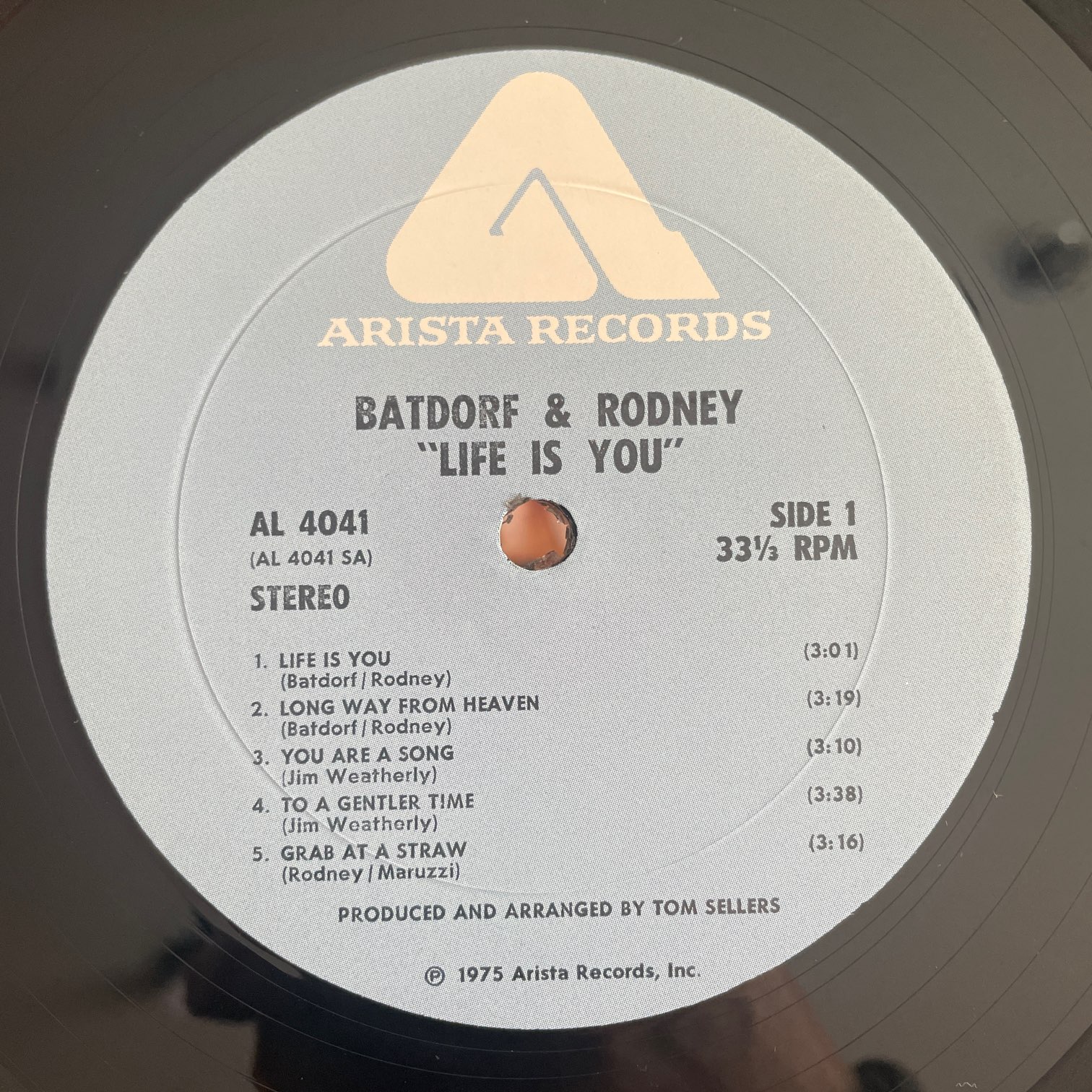BATDORF & RODNEY / LIFE IS YOU BATDORF & RODNEY / LIFE IS YOU / AL4041 US ORIG. 75年aristaからリリースされたアメリカ・オリジナル。西海岸のメロウ・アコースティック・デュオの3枚目でラストのアルバム。ナイスなメロディと気持ちいいハーモニーのプレAOR。 盤質:B+(A面軽度横揺れ) ジャケット:表一部剥がれ、角潰れ、縁軽度スレ、軽度リングウェア。 試聴 LIFE IS YOU https://recordshopgg.com/wp-content/uploads/2025/11/BATDORF-RODNEY1.m4a IS IT LOVE https://recordshopgg.com/wp-content/uploads/2025/11/BATDORF-RODNEY2.m4a (商品コード: 5095) 在庫状態 : 在庫有り ¥1,500(税込) 数量