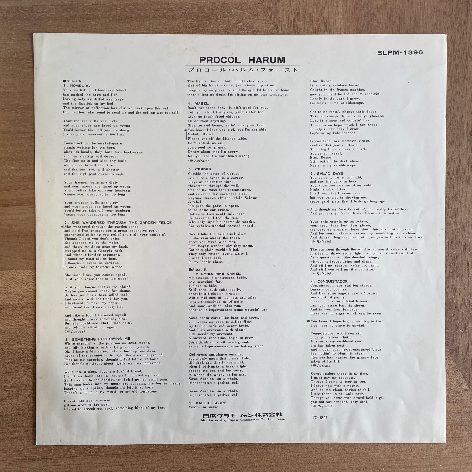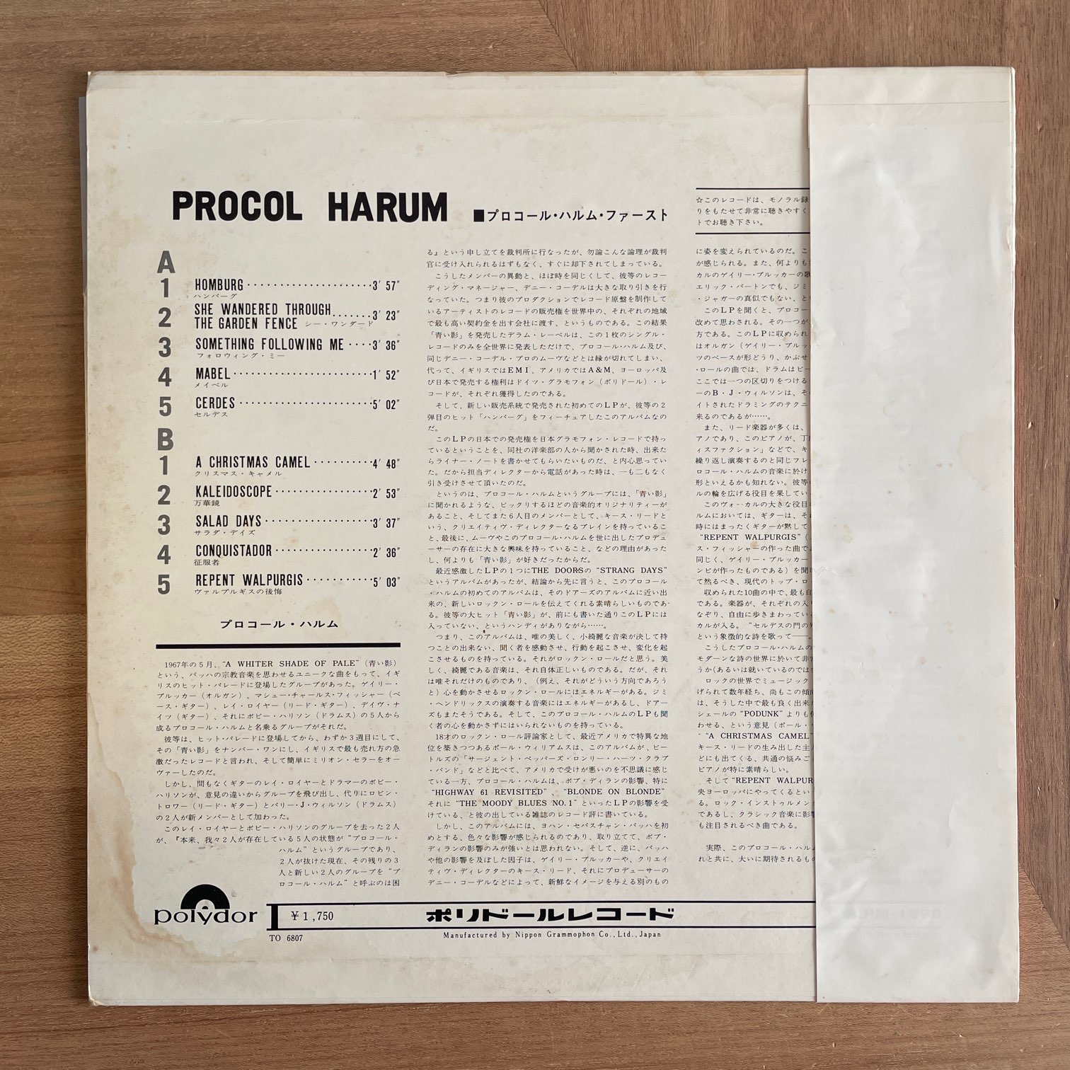 PROCOL HARUM / ファースト PROCOL HARUM / ファースト / SLPM-1396 JP ORIG. 68年polydorからリリースされた日本・初回盤。イギリスのロックバンドの1stアルバムですが、日本独自ジャケットであの有名なジャケットではありません。日本でも再発される際はオリジナルジャケットになります。また、日本初回盤あるあるですが、曲順や曲目が少し変更されてます。 盤質:A- ジャケット:両面の取り出し口下の方に水しみ?、両面しみ、軽度角潰れ、天縁一箇所凹み。帯・歌詞カードしみ。 試聴 HOMEBURG https://recordshopgg.com/wp-content/uploads/2025/12/PROCOL-HARUM-1.m4a A CHRISTMAS CAMEL https://recordshopgg.com/wp-content/uploads/2025/12/PROCOL-HARUM-2.m4a (商品コード: 5167) 在庫状態 : 在庫有り ¥39,800(税込) 数量