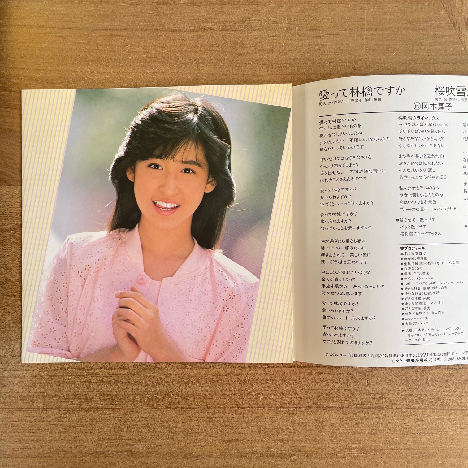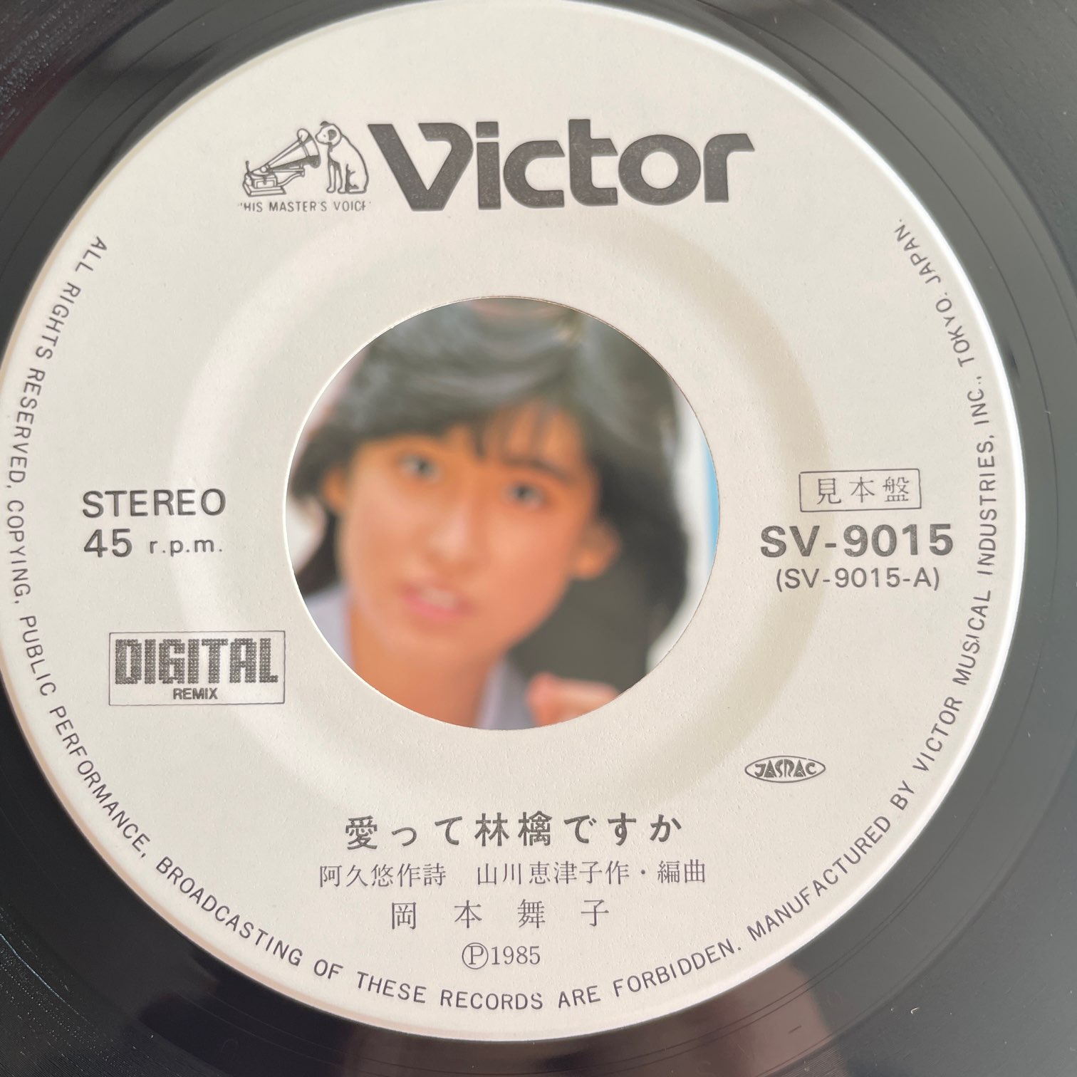 岡本舞子 / 愛って林檎ですか 岡本舞子 / 愛って林檎ですか / SV-9015 JP ORIG. PROMO. 7INC. 85年ビクターからリリースされた日本・オリジナル・見本・白ラベル・7インチ。秀逸なタイトルですよね。みんな違うとわかってるけど、どんな歌詞なんだろう?と思ってしまう。しかも、この顔で言われちゃうと。。。カップリングの「桜吹雪クライマックス」がこれまたナイスなブギーなシティポップ。 盤質:A- ジャケット:軽度日焼け。 試聴 愛って林檎ですか https://recordshopgg.com/wp-content/uploads/2025/12/岡本舞子1.m4a 桜吹雪クライマックス https://recordshopgg.com/wp-content/uploads/2025/12/岡本舞子2.m4a (商品コード: 5236) 在庫状態 : 在庫有り ¥1,500(税込) 数量