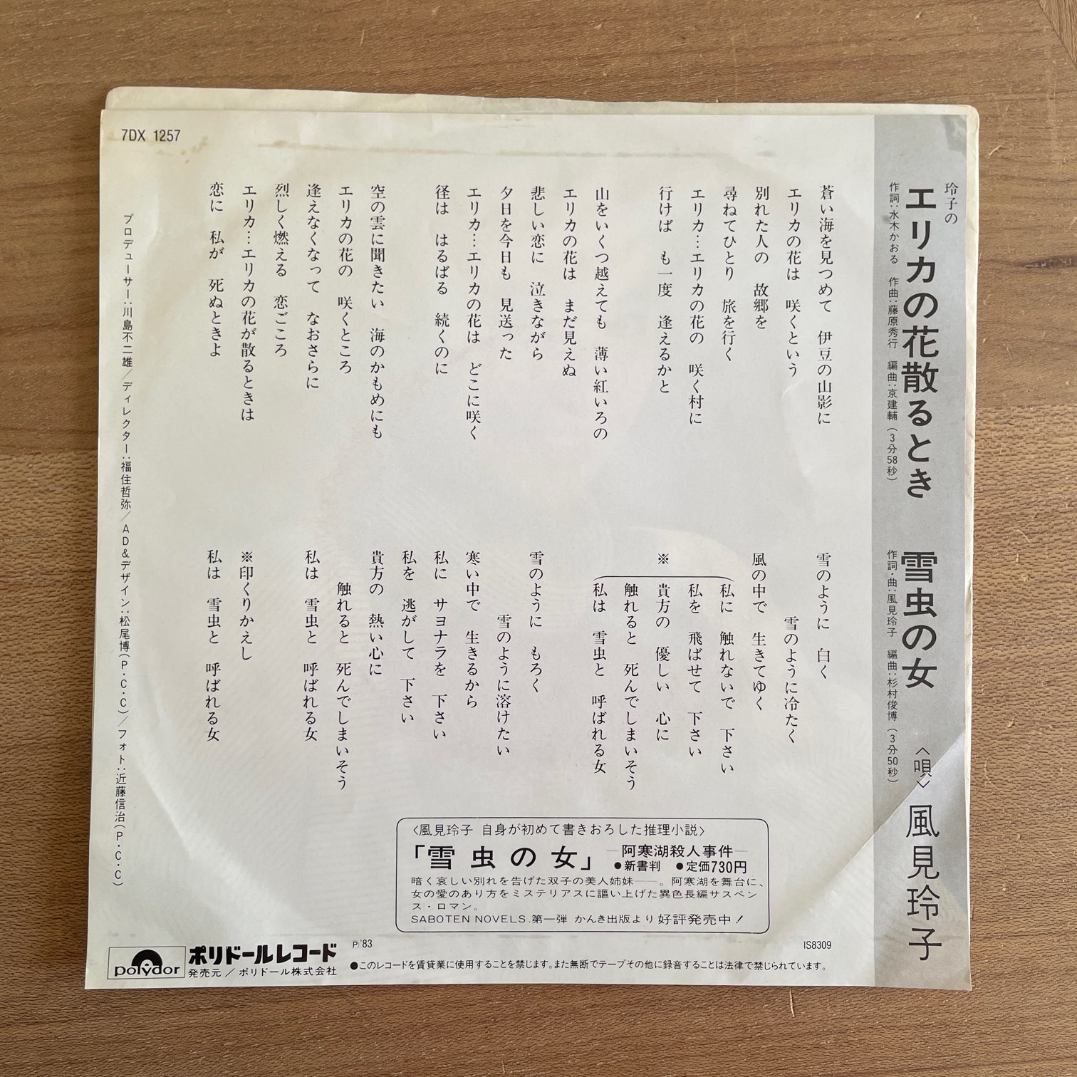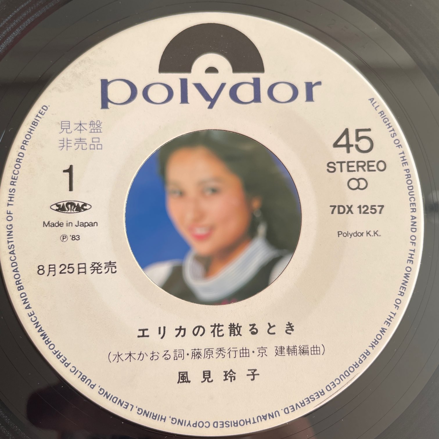 風見玲子 / エリカの花散るとき 風見玲子 / エリカの花散るとき / 7DX1257 JP ORIG. PROMO. 7INC. 83年polydorからリリースされた日本・オリジナル・白ラベル・7インチ。演歌のシングルかと思いきや、B面の「雪虫の女」がドラムが打ってて、グルーヴィ歌謡曲になってます! 盤質:B+(見た目綺麗ですが、試聴のようなチリつきあり) ジャケット:軽度スレ、折れジワ、軽度しみ。 試聴 エリカの花散るとき https://recordshopgg.com/wp-content/uploads/2025/12/風見玲子-1.m4a 雪虫の女 https://recordshopgg.com/wp-content/uploads/2025/12/風見玲子2.m4a (商品コード: 5231) 在庫状態 : 在庫有り ¥800(税込) 数量