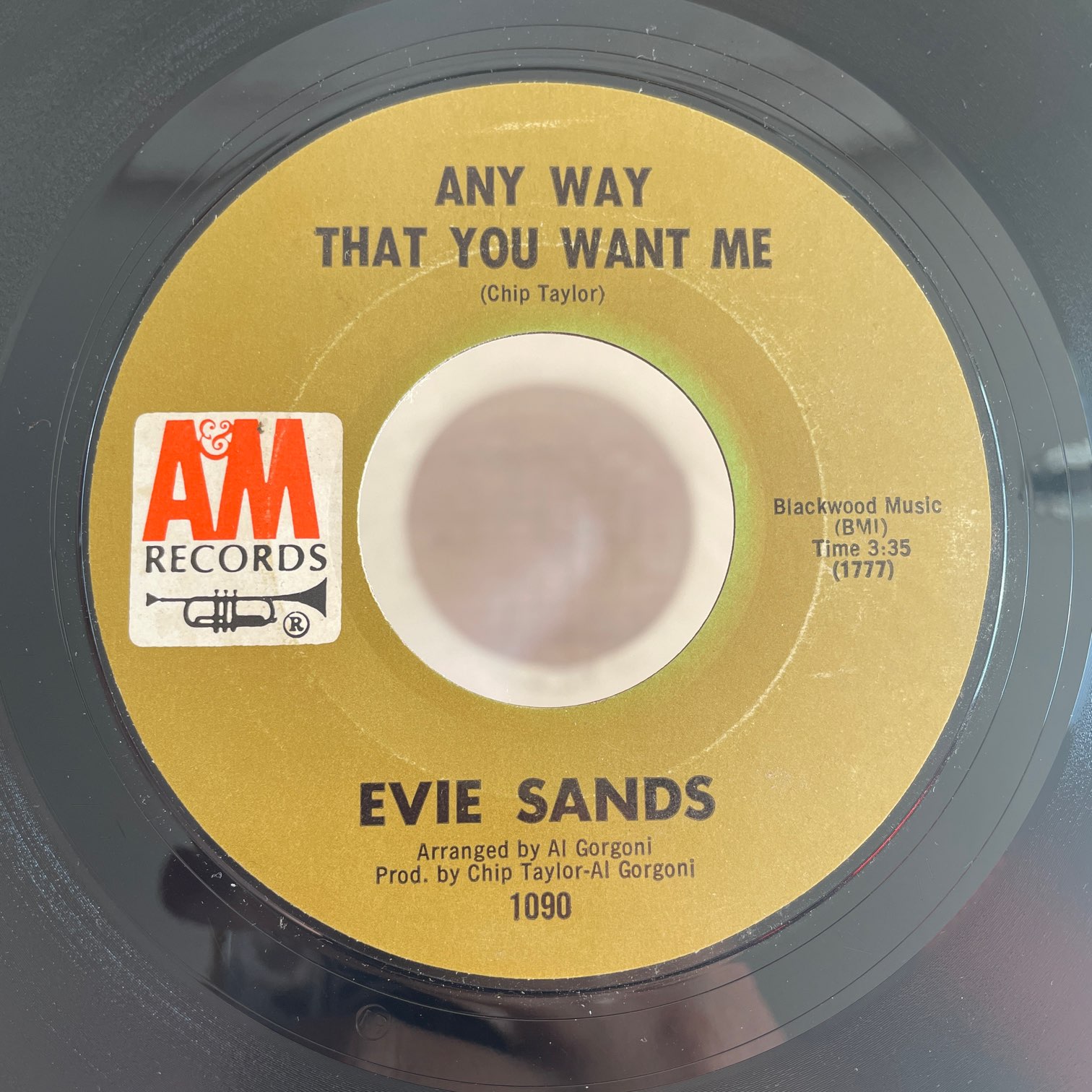 EVIE SANDS / ANY WAY THAT YOU WANT ME EVIE SANDS / ANY WAY THAT YOU WANT ME / 1090 US ORIG. 7INC. 69年A&Mからリリースされたアメリカ・オリジナル・7インチ。70年リリースの自転車ジャケも可愛らしいデビューアルバムのタイトル曲の先行シングル。カップリングは「I’LL NEVER BE ALONE AGAIN」。A&M的なアレンジに少しソウルフルなボーカルが素晴らしい。 盤質:B+ ジャケット:最初からなし。 試聴 ANY WAY THAT YOU WANT ME https://recordshopgg.com/wp-content/uploads/2025/12/EVIE-SANDS2.m4a I’LL NEVER BE ALONE AGAIN https://recordshopgg.com/wp-content/uploads/2025/12/EVIE-SANDS3.m4a (商品コード: 5232) 在庫状態 : 在庫有り ¥2,300(税込) 数量