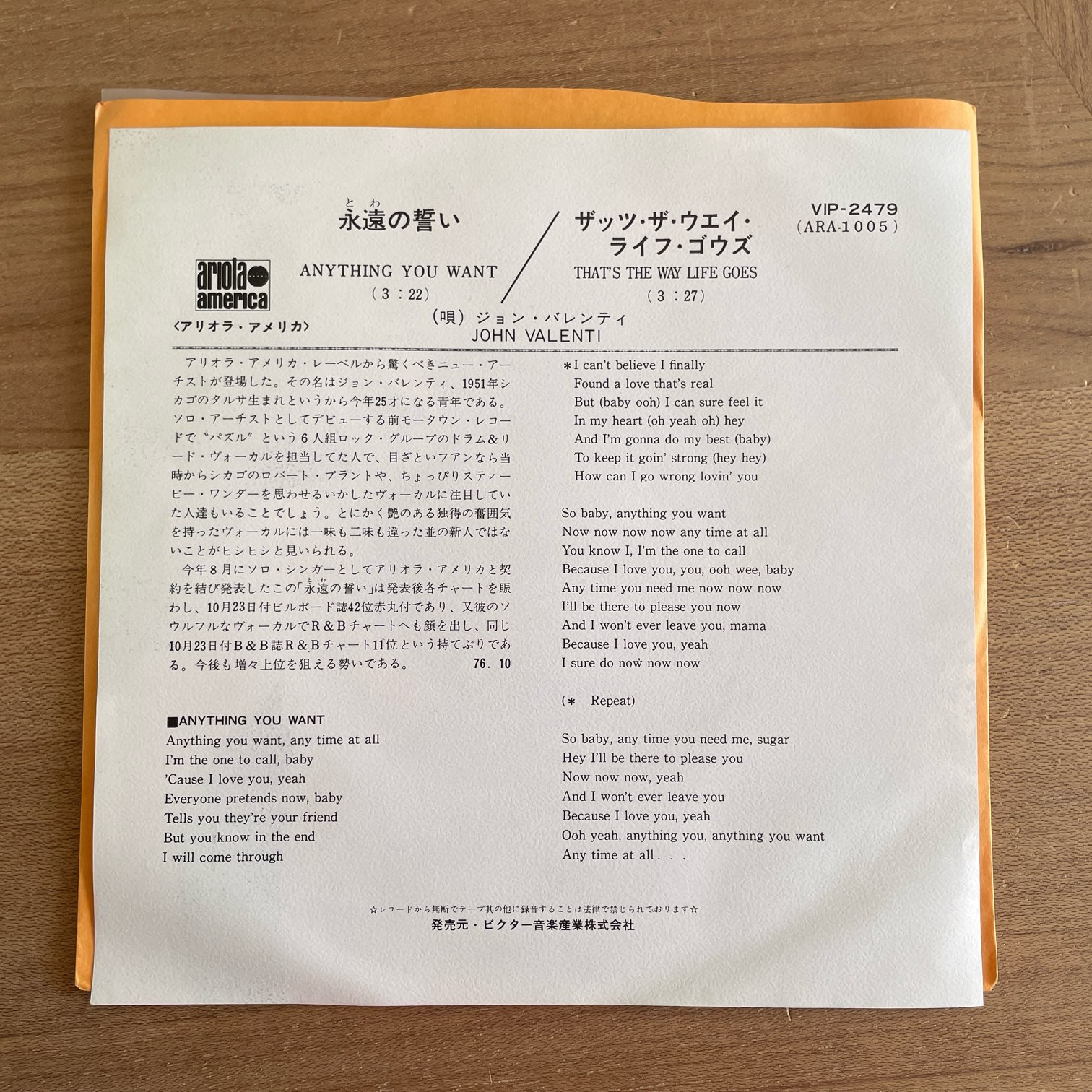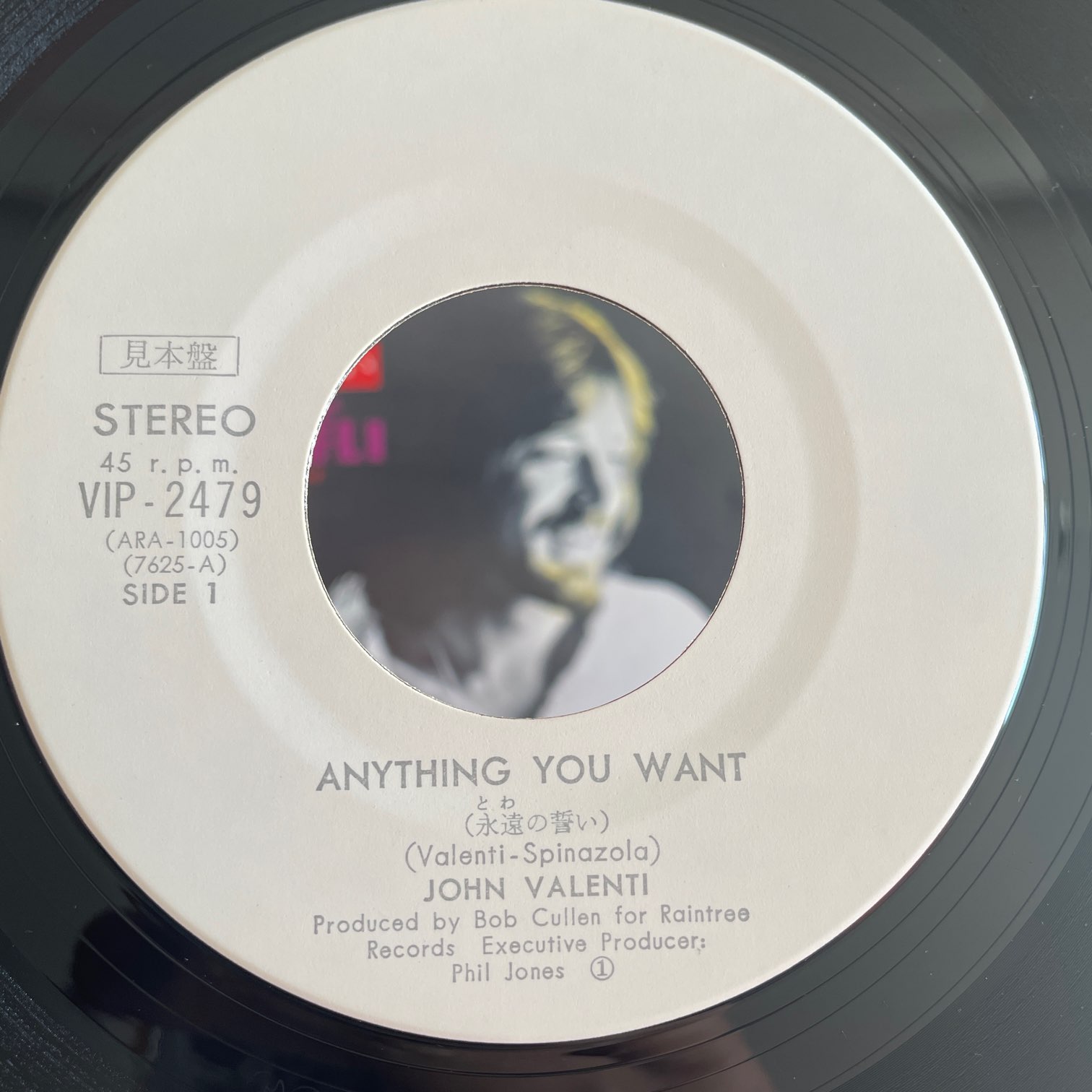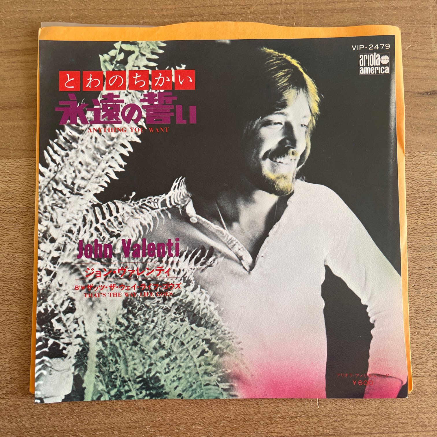 JOHN VALENTI / ANYTHING YOU WANT / 永遠の誓い JOHN VALENTI / ANYTHING YOU WANT / VIP-2479 JP ORIG. PROMO. 7INC 77年ariola americaからリリースされた日本・初回・見本・白ラベル・7インチ・日本独自ジャケ。白いスティーヴィー・ワンダーとの異名をとる、AOR〜ブルーアイドソウルの名盤からのシングル。カップリングには「THAT’S THE WAY LIFE GOES」収録。 盤質:A- ジャケット:概ね綺麗です。 試聴 ANYTHING YOU WANT https://recordshopgg.com/wp-content/uploads/2025/12/JOHN-VALENTI-1.m4a THAT’S THE WAY LIFE GOES https://recordshopgg.com/wp-content/uploads/2025/12/JOHN-VALENTI-2.m4a (商品コード: 5229) 在庫状態 : 在庫有り ¥8,800(税込) 数量