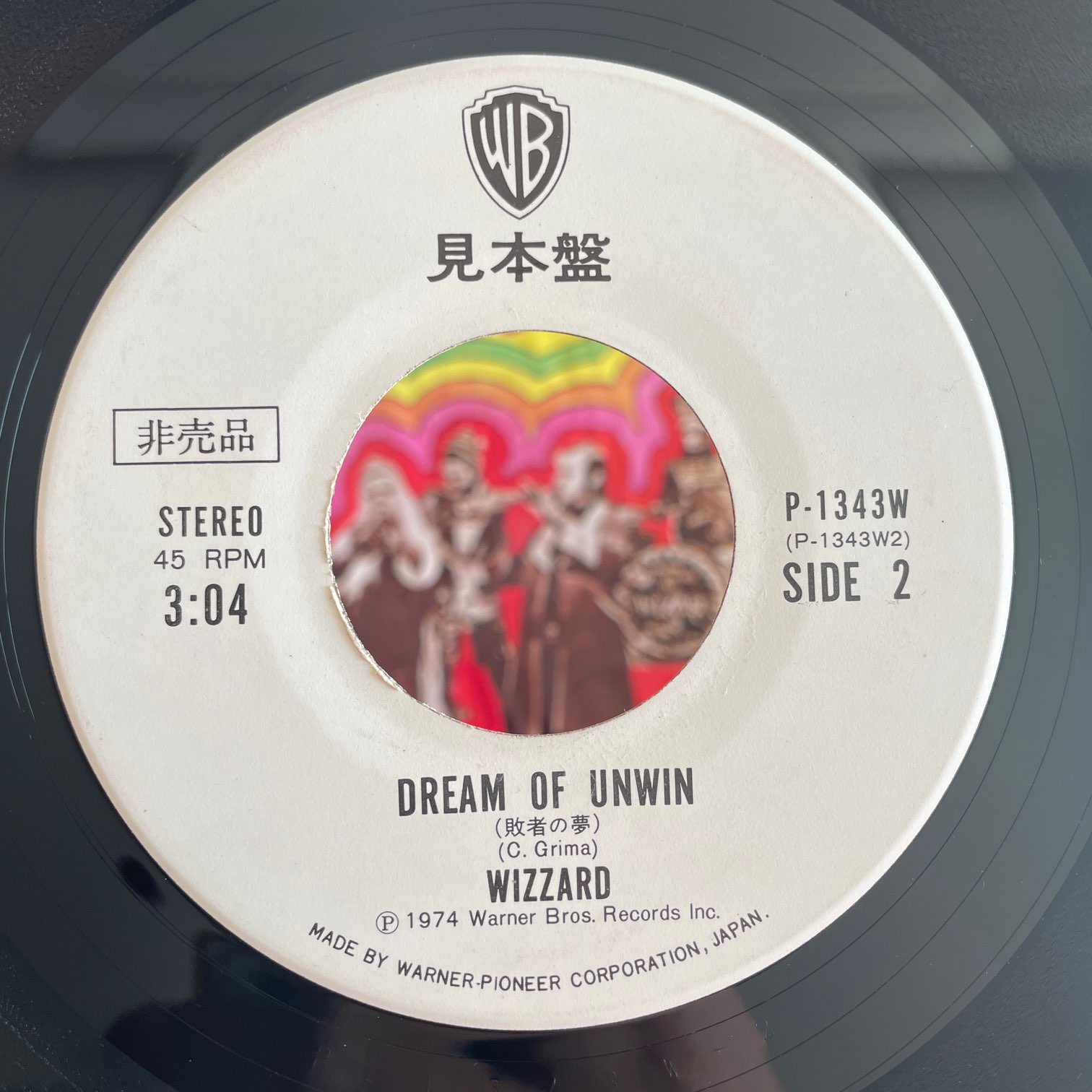 74年warner bros.からリリースされた日本・初回盤・見本・白ラベル。ロイ・ウッド率いるイギリスのロック・ばんど、ウィザードの7インチ・シングル。カップリングは「DREAM OF UNWIN」(敗者の夢)。ちなみにタイトル曲はMONOで収録、カップリングはSTEREO。