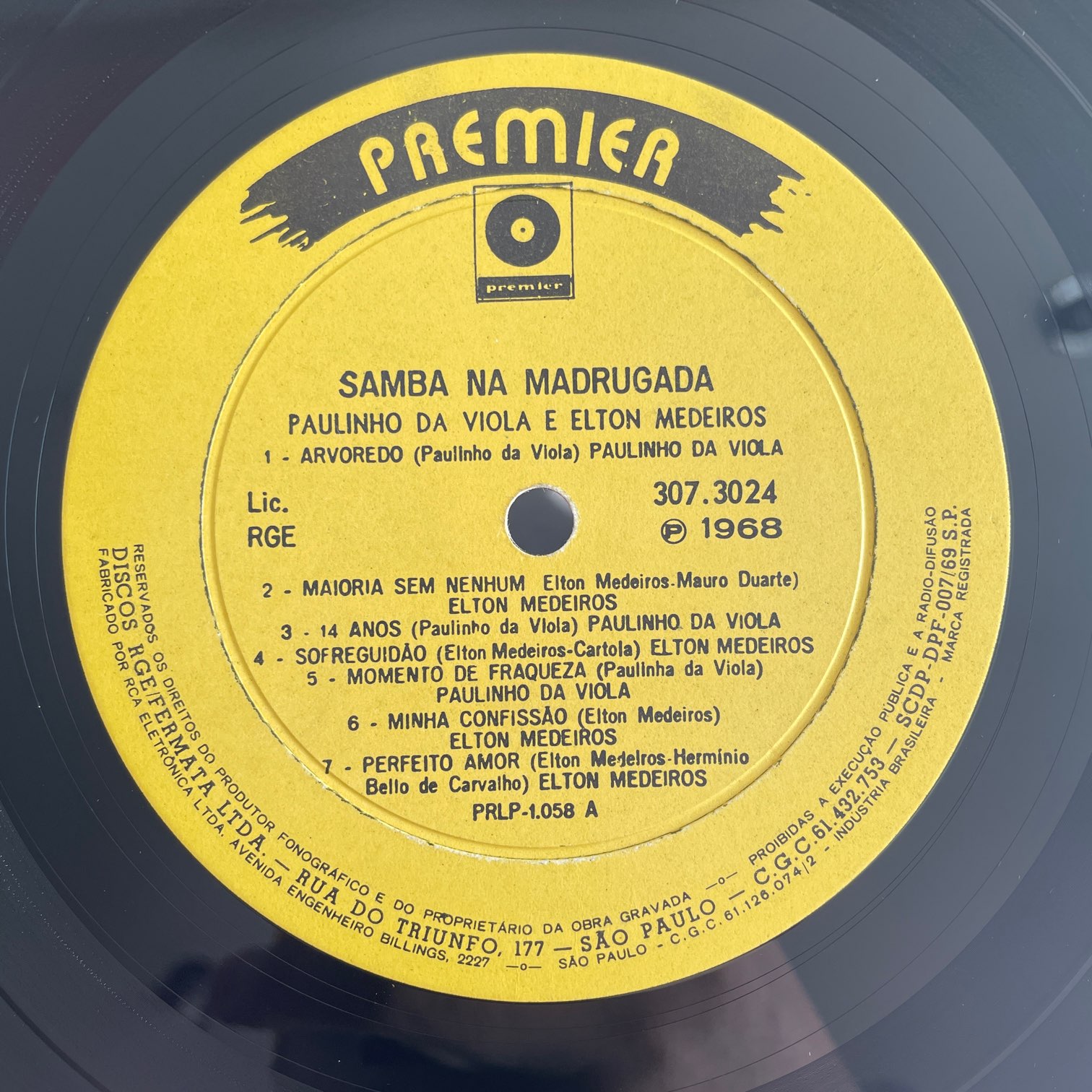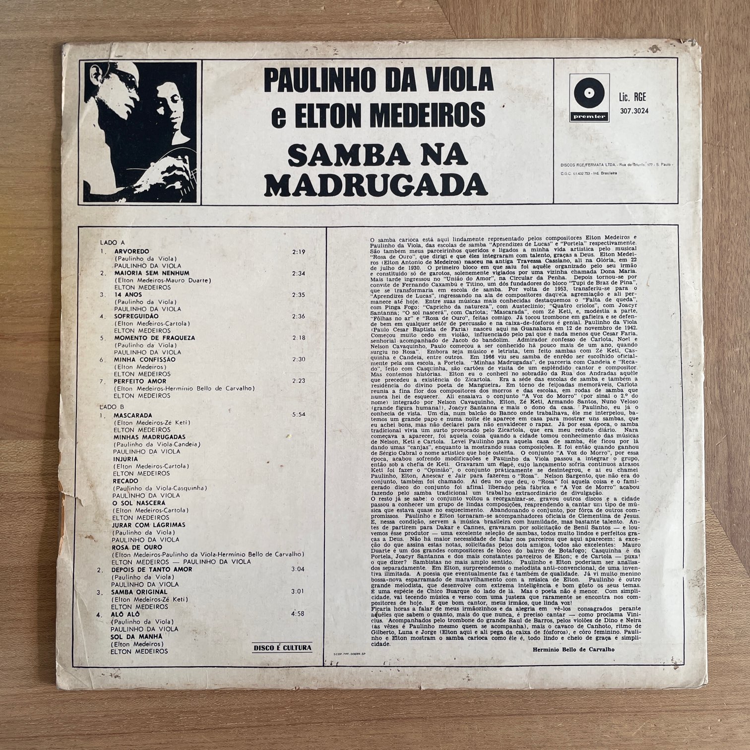 PAULINHO DA VIOLA e ELTON MEDEIROS / SAMBA NA MADRUGADA PAULINHO DA VIOLA e ELTON MEDEIROS / SAMBA NA MADRUGADA / 307.3024 BRASIL REISSUE DG. 68年premierからリリースされたブラジル・深溝・黄色ラベル。サンバ・チームのポルテーラに所属する2人がそれぞれリードボーカルをとってる、サンバ名盤。チームは違いますがCARTOLA作の「SOFREGUIDAO」もカヴァーしてます。 盤質:A- ジャケット:両面取り出し口のダメージ強め、底に一箇所凹み、両面汚れ、角潰れ。 試聴 ARVOREDO https://recordshopgg.com/wp-content/uploads/2025/12/PAULINHO-DA-VIOLA-1.m4a SAMBA ORIGINAL https://recordshopgg.com/wp-content/uploads/2025/12/PAULINHO-DA-VIOLA-2.m4a (商品コード: 5247) 在庫状態 : 在庫有り ¥4,800(税込) 数量