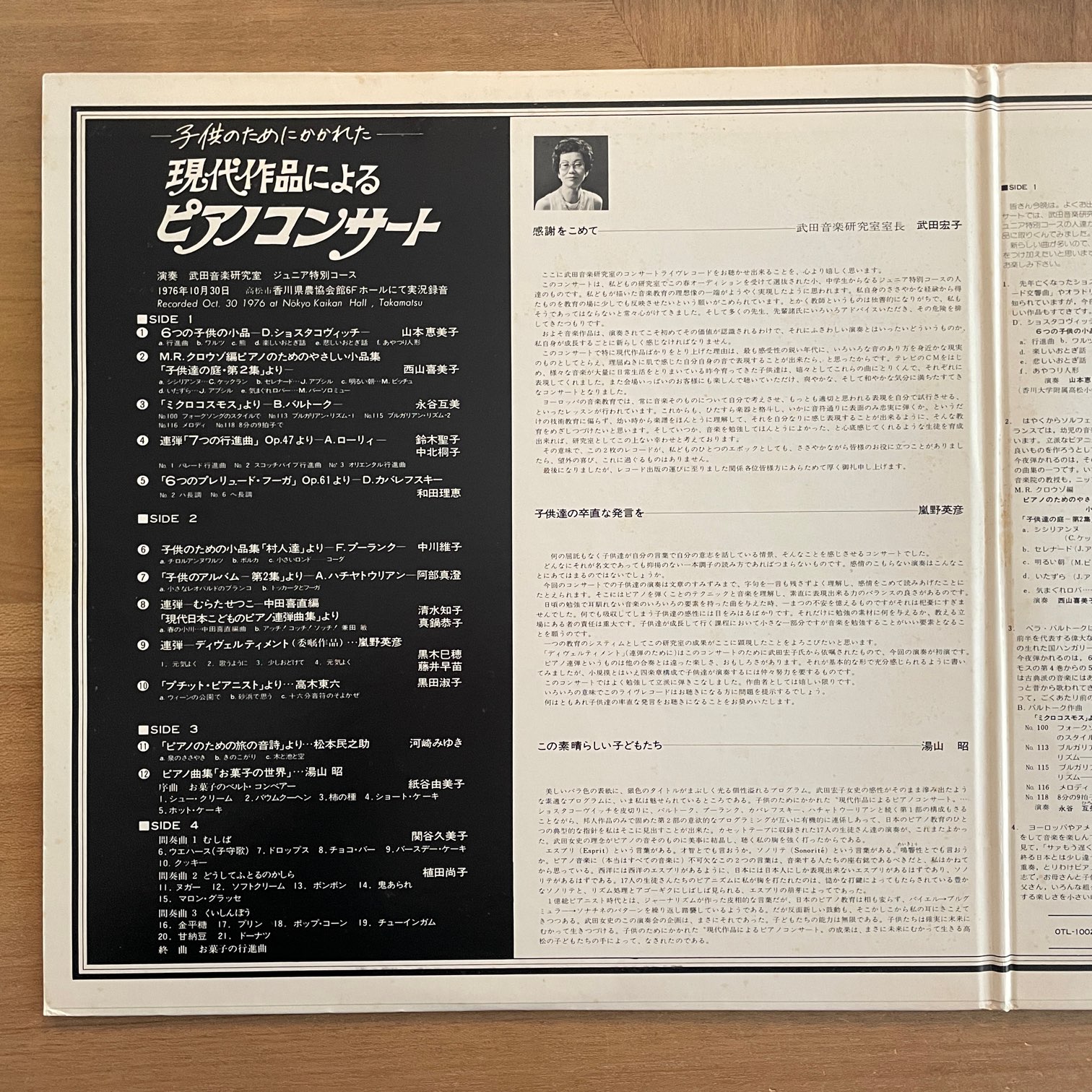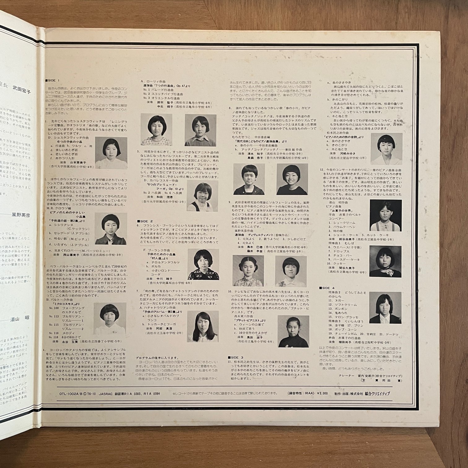 76年fanyからリリースされた日本・オリジナル・自主盤・2枚組。副題にあるように・子供のためにひらかれた・ピアノコンサート。弾いてるのはみんな子供です。香川にある武田音楽研究室に通う小学生から中学生まで。ショスタコヴィッチやバルトークなども演奏してますが、湯山昭作の「お菓子の世界」が素晴らしい!C面の半分からD面全部をかけて作られてます。タイトル曲が素晴らしくて間奏曲「むしば」の後に続いて「ウエハース」や「バースデイ・ケーキ」など。次の間奏曲のタイトルも秀逸「なぜふとるのかしら」。。。タイトルは大事ですね。