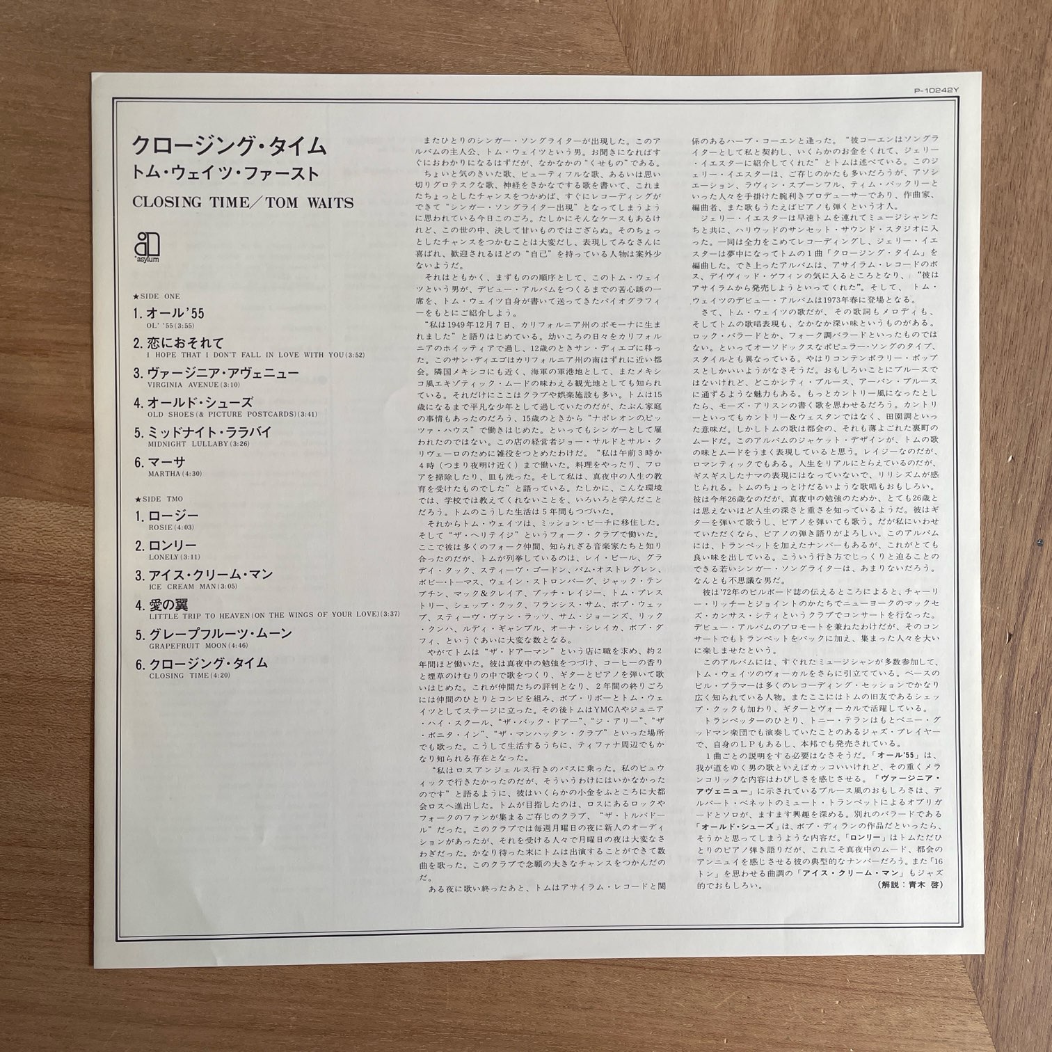 TOM WAITS / CLOSING TIME TOM WAITS / CLOSING TIME / P-10242Y JP REISSUE 再入荷 76年asylumからリリースされた日本盤。独特のボーカルで衝撃的なデビューを飾ったトム・ウェイツの73年にリリースされた「クロージング・タイム」。彼を一言で表現する時に使う「酔いどれ詩人」とは誰がつけたか知りませんがピッタリですね。この時まだ24歳。。。 盤質:A-(軽度反り) ジャケット:概ね綺麗です。帯あり、ライナー少し日焼け。 試聴 OL”55 https://recordshopgg.com/wp-content/uploads/2025/12/TOM-WAITS1.m4a ROSIE https://recordshopgg.com/wp-content/uploads/2025/12/TOM-WAITS2.m4a (商品コード: 5270) 在庫状態 : 在庫有り ¥7,800(税込) 数量