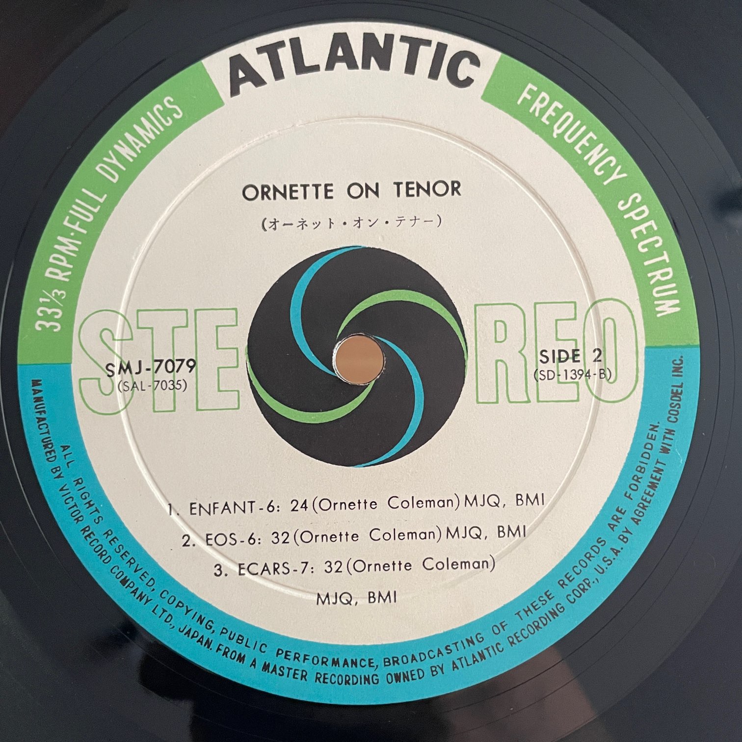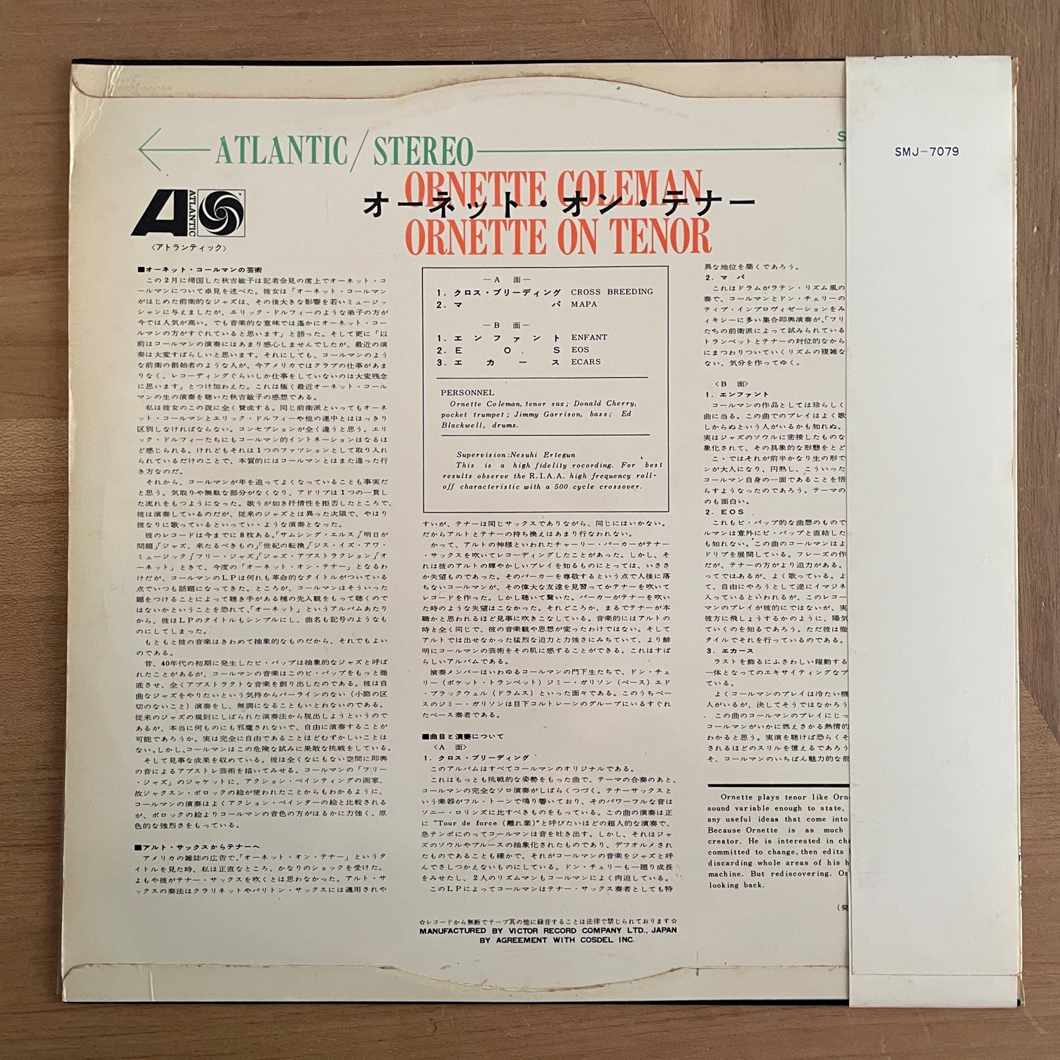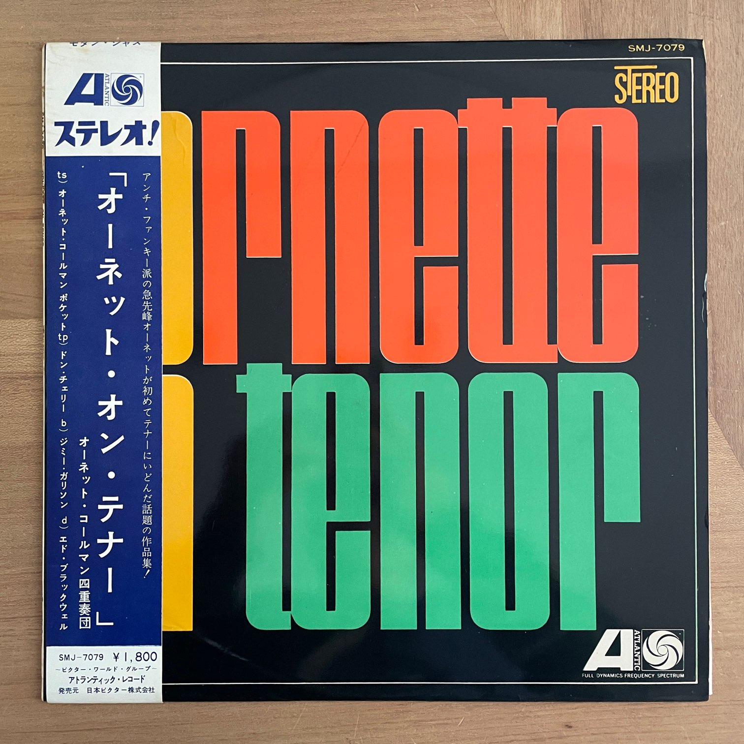 ORNETTE COLEMAN / ORNETTE ON TENOR ORNETTE COLEMAN / ORNETTE ON TENOR / SMJ-7079 JP ORIG. ペラジャケ 67年atlanticからリリースされた日本・初回盤・深溝。62年リリースのオーネット・コールマン初の全曲テナーサックスで挑んだアルバム。DON CHERRY,JIMMY GARRISON,ED BLACKWELLとのピアノレスのカルテット。 盤質:A-(A面ラベルに書き込み) ジャケット:フリップバック、リングウェア、一部角折れ、取り出し口スレ、裏黄ばみ。帯軽度しみ。 試聴 CROSS BREEDING https://recordshopgg.com/wp-content/uploads/2025/12/ORNETTE-COLEMAN-1.m4a EOS https://recordshopgg.com/wp-content/uploads/2025/12/ORNETTE-COLEMAN-2.m4a (商品コード: 5306) 在庫状態 : 在庫有り ¥7,800(税込) 数量