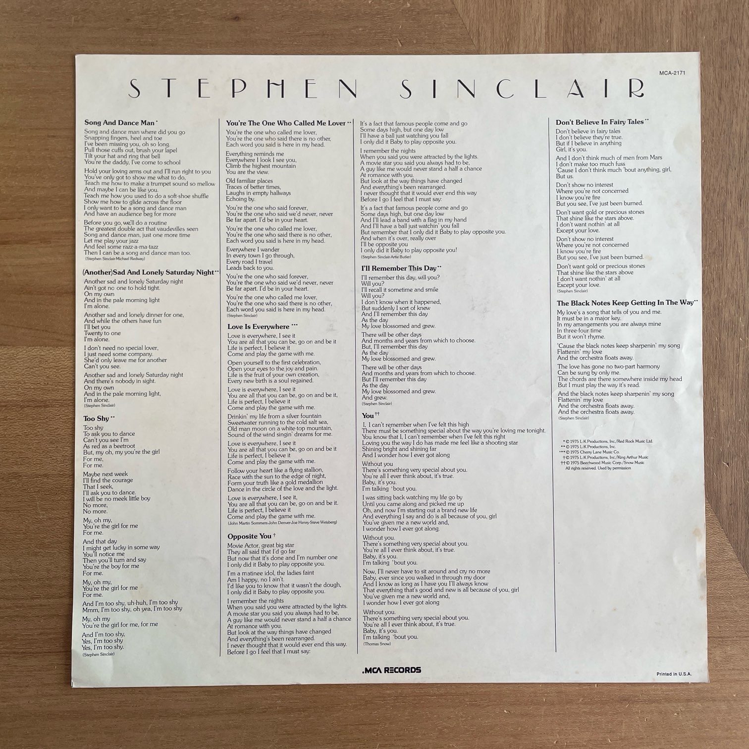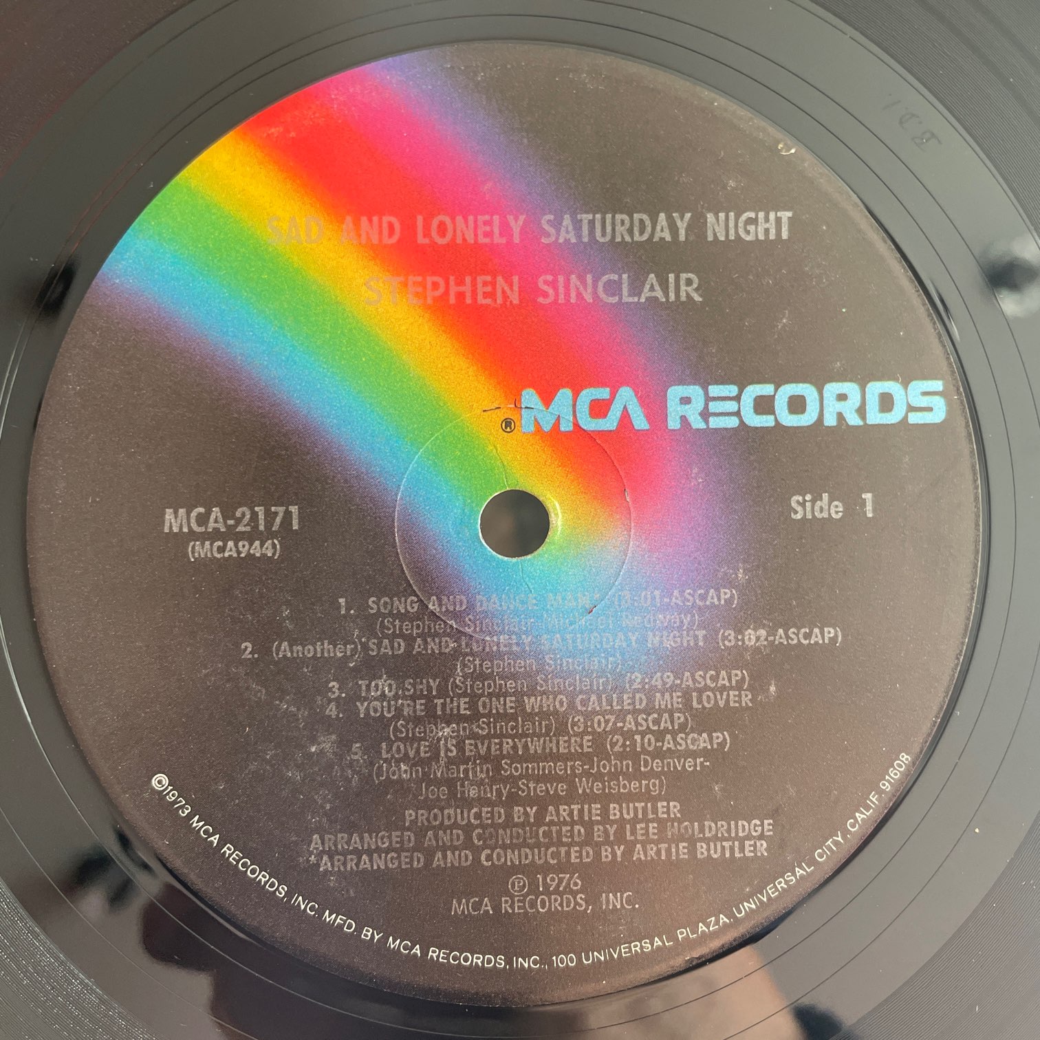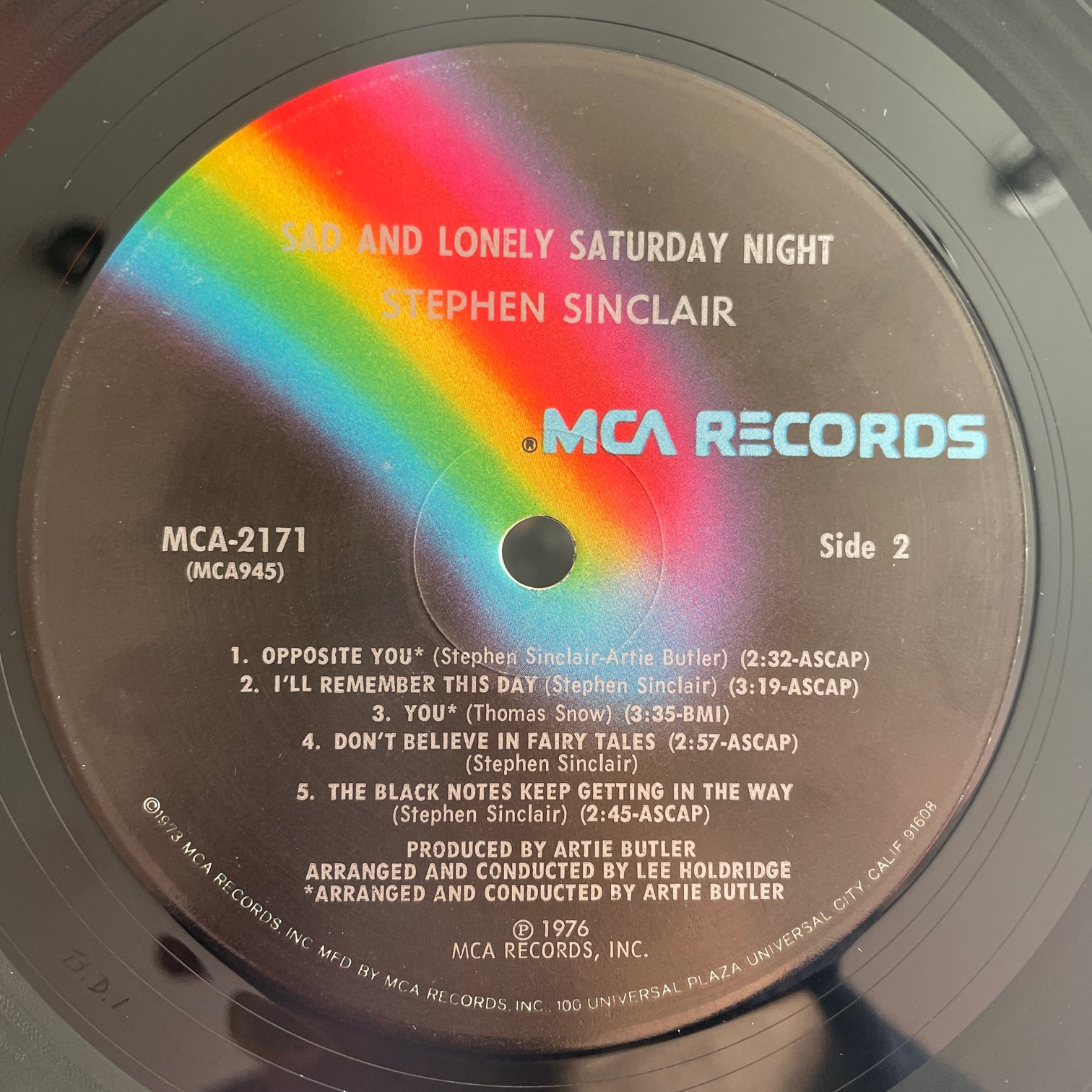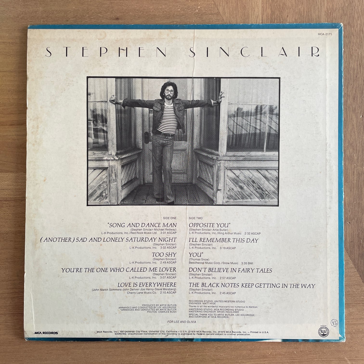 STEPHEN SINCLAIR / SAD AND LONELY SATURDAY NIGHT STEPHEN SINCLAIR / SAD AND LONELY SATURDAY NIGHT / MCA-2171 US ORIG. 76年MCAからリリースされたアメリカ・オリジナル。2枚目はAORでも人気なアメリカのSSWによる1stアルバム。デビューアルバムはメロウでロマンチックで時々オールドタイミーな一枚。 盤質:B+ ジャケット:10cm底抜け、縁・角にスレ。リングウェア、裏しみ。歌詞カードあり。 試聴 SONG AND DANCE MAN https://recordshopgg.com/wp-content/uploads/2026/01/STEPHEN-SINCLAIR1.m4a YOU https://recordshopgg.com/wp-content/uploads/2026/01/STEPHEN-SINCLAIR2.m4a (商品コード: 5319) 在庫状態 : 在庫有り ¥1,800(税込) 数量