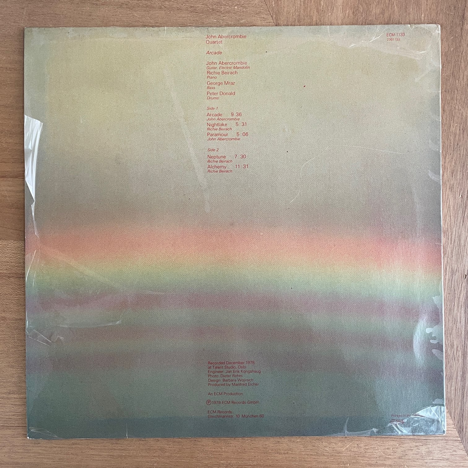 JOHN ABERCROMBIE / ARCADE JOHN ABERCROMBIE / ARCADE / ECM1133 GERMANY ORIG. 79年ECMからリリースされたドイツ・オリジナル。ECMを代表するギタリストの1人、ジョン・アバークロンビーとRICHIE BEIRACH,GEORGE MRAZ,PETER DONALDのピアノトリオとのカルテット盤。ジャケットのように空にかかる虹のような空間を広く使ったギターが気持ちいい一枚。 盤質:B+ ジャケット:コーティングが剥がれたり、剥がれかけたりしてます。縁軽度しわ。 試聴 ARCADE https://recordshopgg.com/wp-content/uploads/2026/01/JOHN-ABERCROMBIE1.m4a NEPTUNE https://recordshopgg.com/wp-content/uploads/2026/01/JOHN-ABERCROMBIE2.m4a (商品コード: 5327) 在庫状態 : 在庫有り ¥1,800(税込) 数量