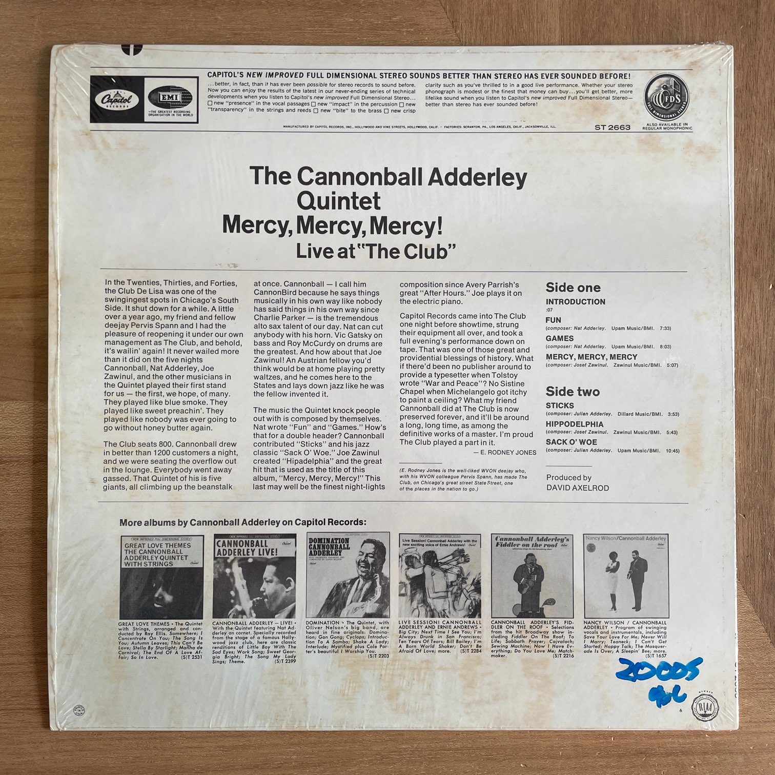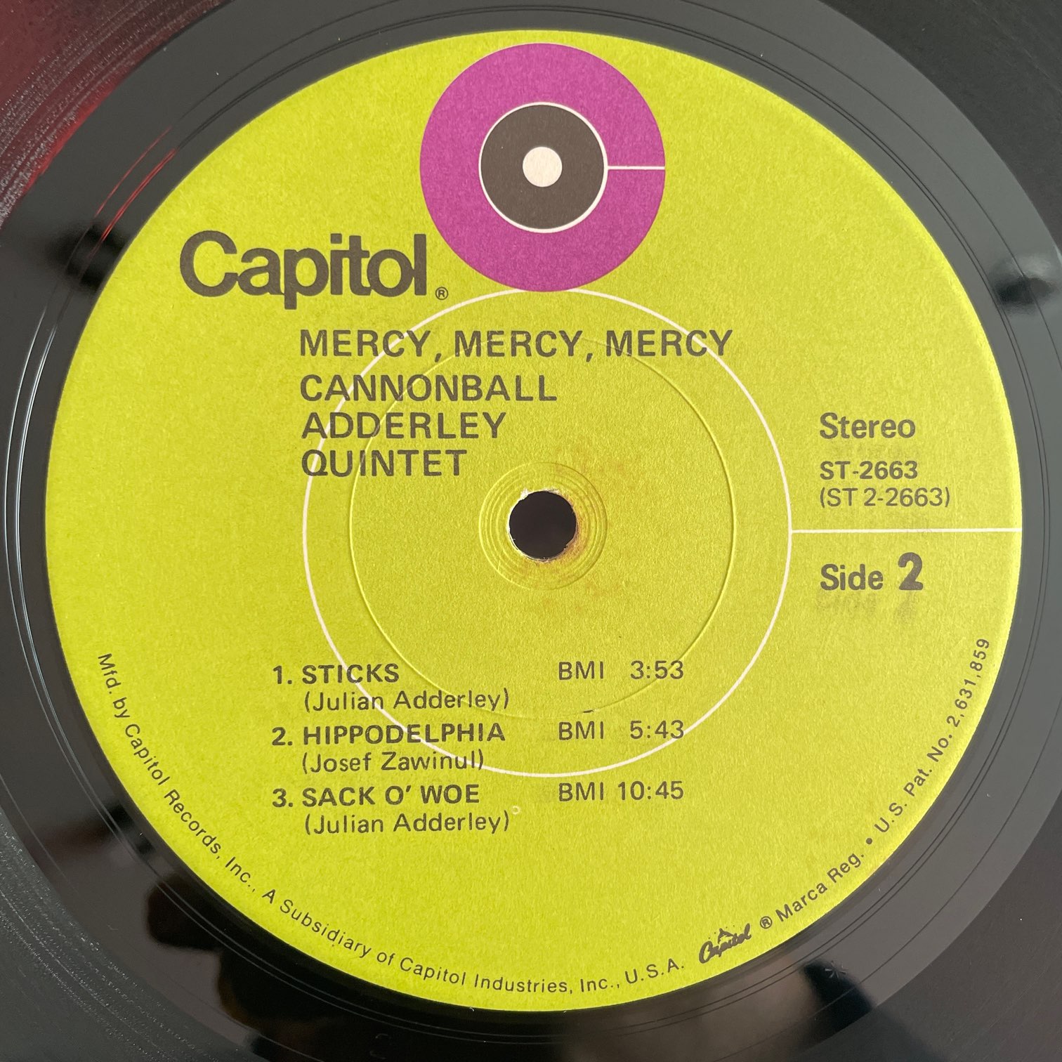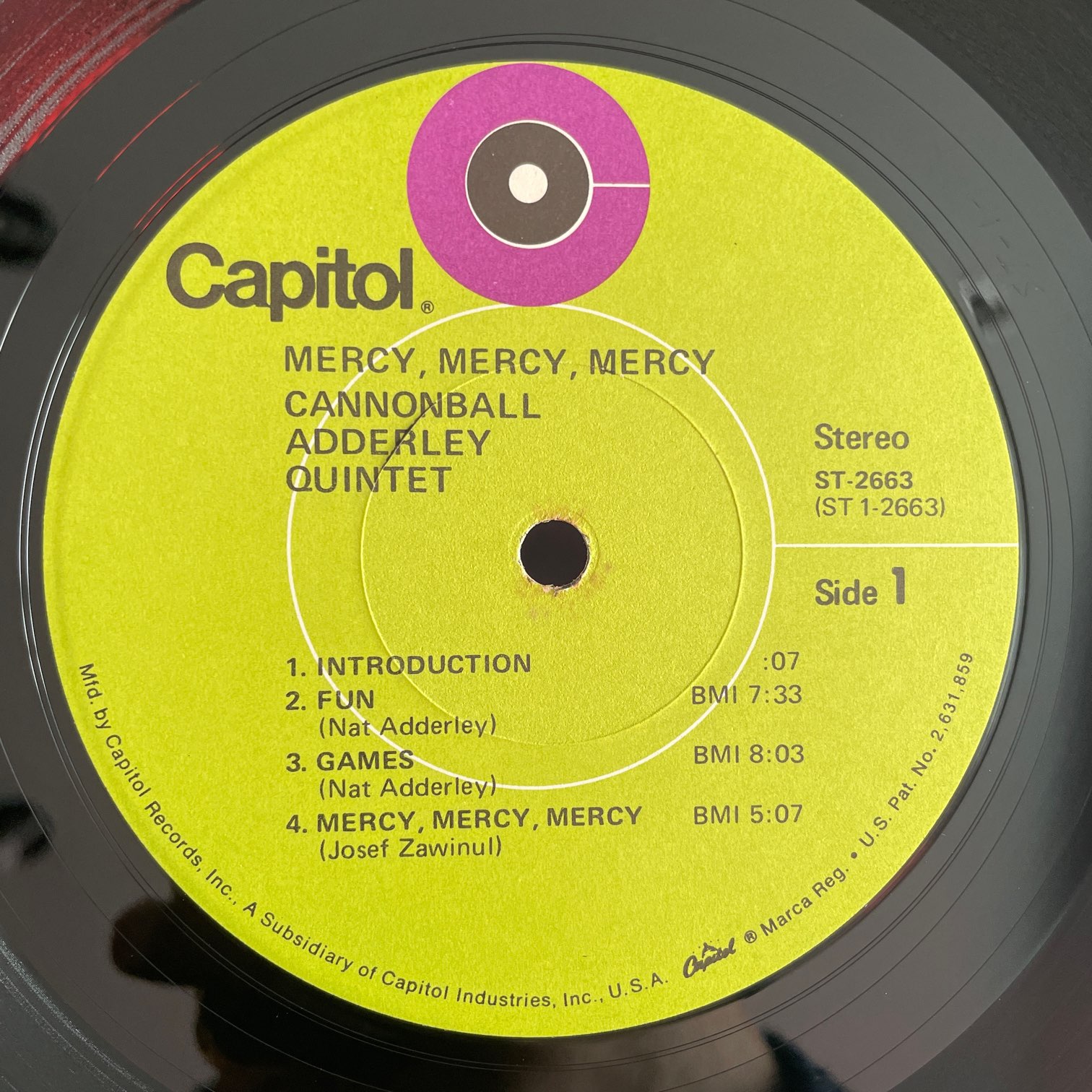 69年capitolからリリースされたアメリカ・再発・ライム色ラベル。66年スタジオにお客を入れてライブ音源にしたもの。JOE ZAWINUL,NAT ADDERLEY,VICTOR GUSKIN,ROY McCARDYによるクインテット編成。ヒットしたタイトル曲だけじゃなく、その他もダンサンブルでかっこよし。