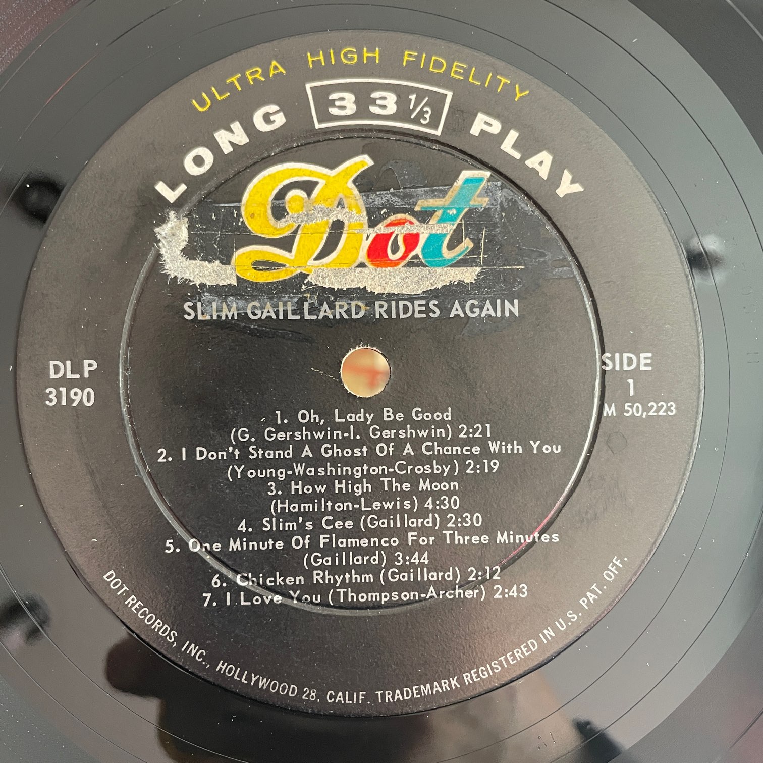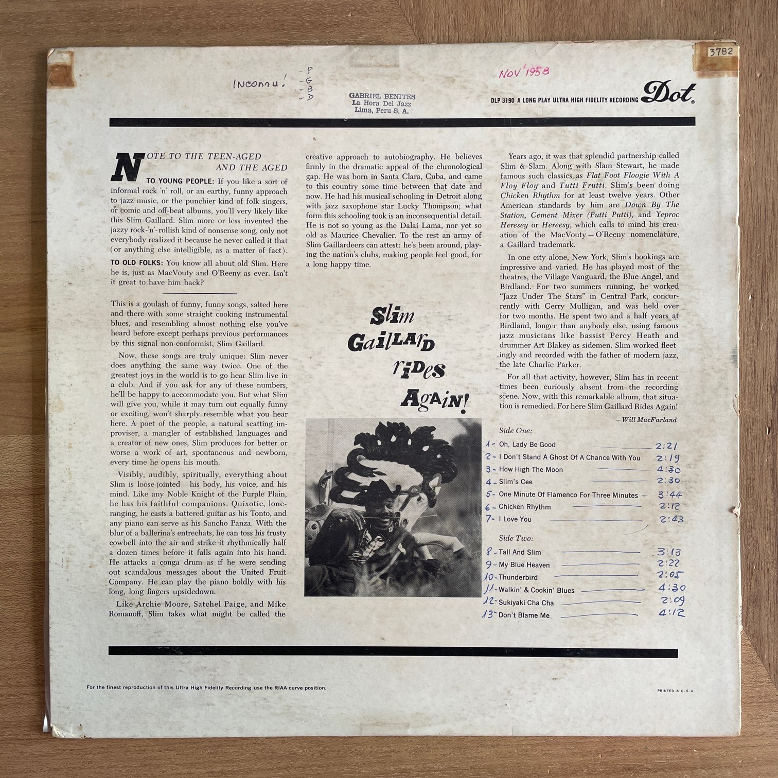 SLIM GAILLARD / RIDES AGAIN! SLIM GAILLARD / RIDES AGAIN! / DLP3190 US MONO ORIG. DG. 59年dotからリリースされたアメリカ・オリジナル・モノ盤・深溝。小粋なギターとピアノで独自のボーカルを披露するジャイブ名作。ジャズファンだけじゃなく、ロック好きにも彼のファンは多い。 盤質:B+ ジャケット:背全開、天15cm(背から)破れ、表と底縁に虫食いのような穴あき1箇所ずつあり。右上角にシール、左上角シール跡。表しわ。裏書き込み。 試聴(ステレオ針で録音) OH, LADY BE GOOD https://recordshopgg.com/wp-content/uploads/2026/01/SLIM-GAILLARD1.m4a MY BLUE HEAVEN https://recordshopgg.com/wp-content/uploads/2026/01/SLIM-GAILLARD2.m4a (商品コード: 5335) 在庫状態 : 在庫有り ¥4,200(税込) 数量