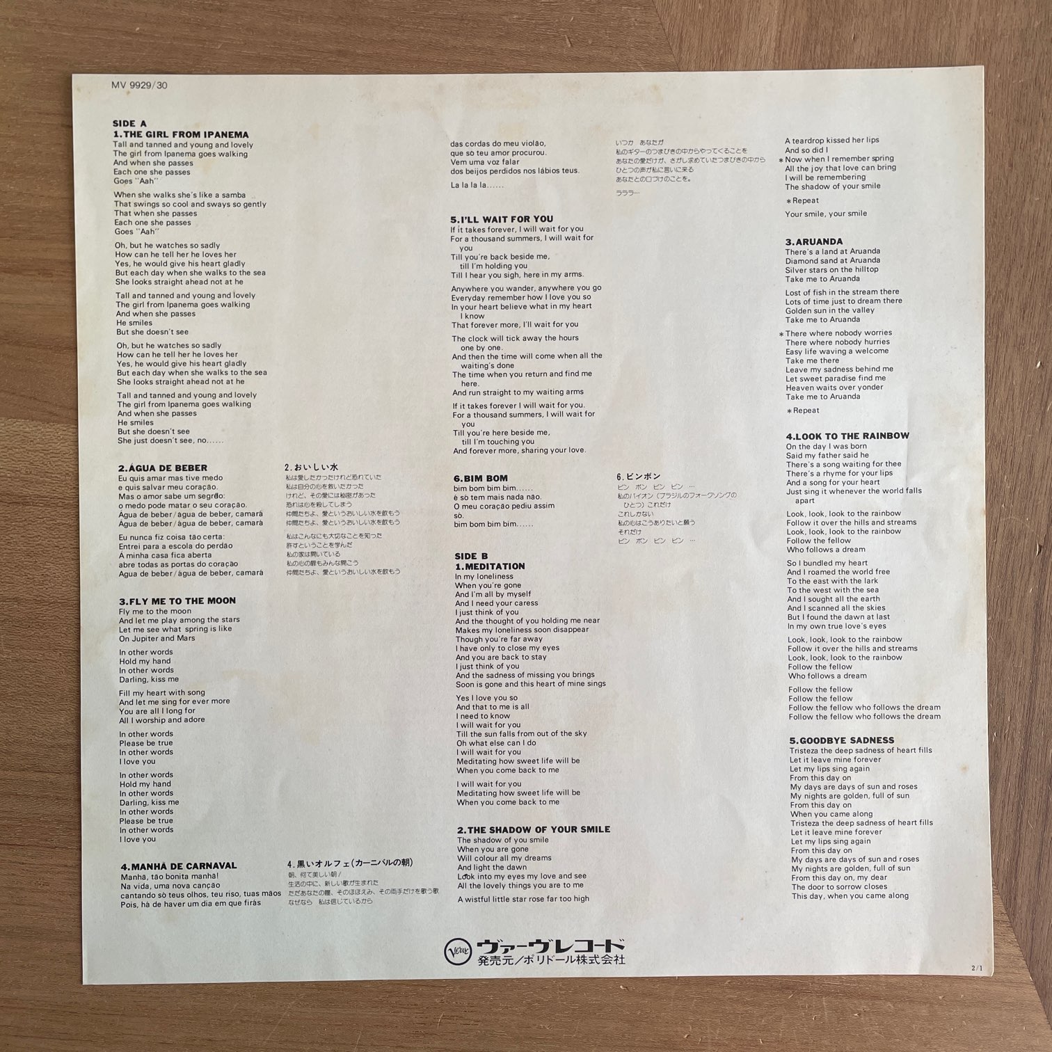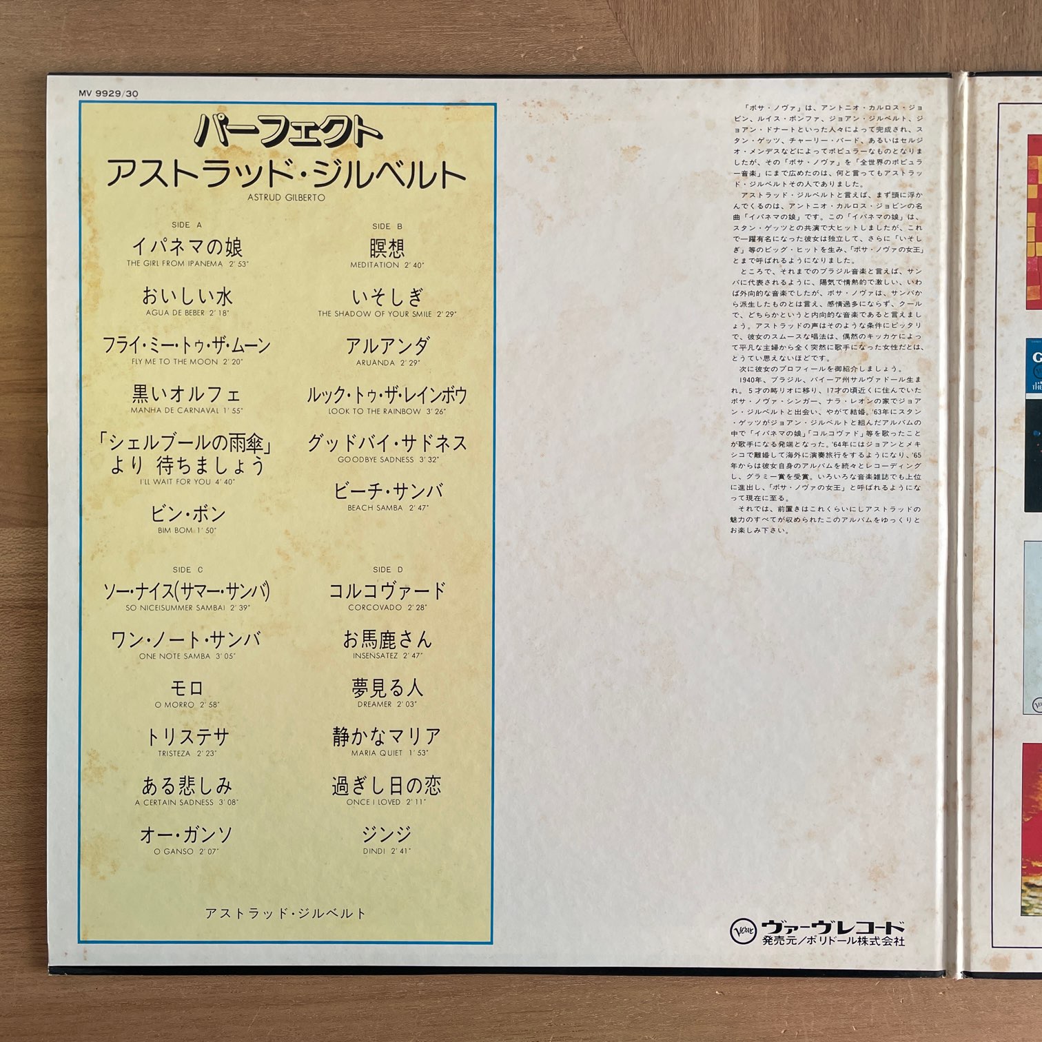 ASTRUD GILBERTO / PERFECT ASTRUD GILBERTO / PERFECT / MV9929/30 JP ORIG. JP ONLY 76年verveからリリースされた日本・オリジナル・2枚組。日本企画のベスト盤で、日本のみのリリース。24曲入りのアストラッド・ジルベルトのベストですが、タイトル通りのパーフェクト!STAN GETZとの共演がやっぱりいいですね。 盤質:A- ジャケット:軽度角スレ、内ジャケしみ、歌詞カードしみ、帯なし。 試聴 THE GIRL FROM IPANEMA https://recordshopgg.com/wp-content/uploads/2026/01/ASTRUD-GILBERTO1.m4a CORCOVADO https://recordshopgg.com/wp-content/uploads/2026/01/ASTRUD-GILBERTO2.m4a (商品コード: 5391) 在庫状態 : 在庫有り ¥2,500(税込) 数量