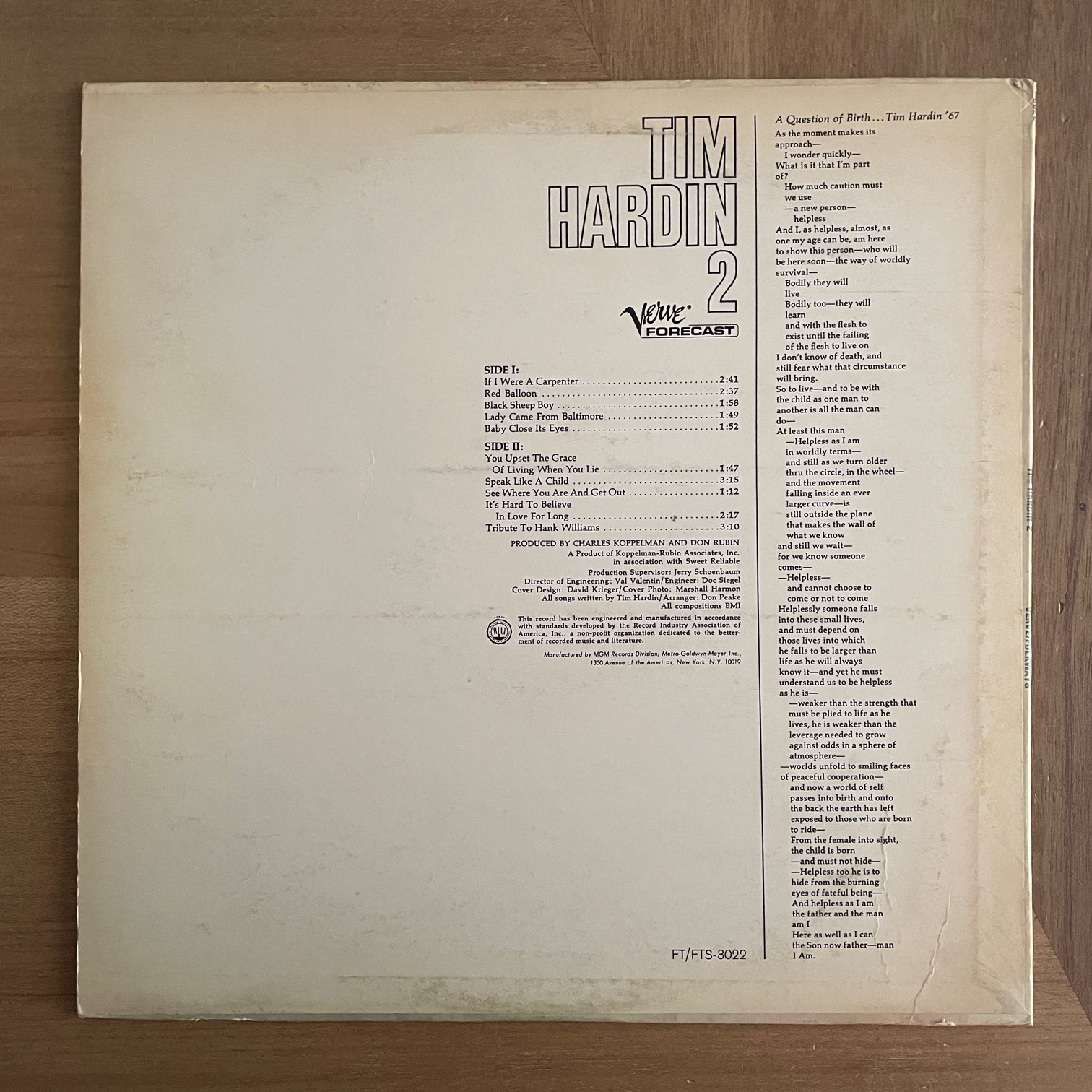 TIM HARDIN / 2 TIM HARDIN / 2 / FTS-3022 US ORIG. DG. 67年verveからリリースされたアメリカ・オリジナル・深溝。39歳で早逝したアメリカのフォーク系SSW、ティム・ハーディンの2ndアルバム。ジャズの要素も随所に聞かれるアルバムでNYという場所がそういう影響を与えたんだろうなぁと印象的な窓辺のジャケットを見ながら毎回思ってしまいます。 盤質:B+ ジャケット:表verveのシール、縁周囲黄ばみ、軽度リングウェア。縁・角に軽度スレ。 試聴 IF I WERE A CARPENTER https://recordshopgg.com/wp-content/uploads/2026/01/TIM-HARDIN.m4a RED BALLOON https://recordshopgg.com/wp-content/uploads/2026/01/TIM-HARDIN1.m4a (商品コード: 5420) 在庫状態 : 在庫有り ¥2,500(税込) 数量
