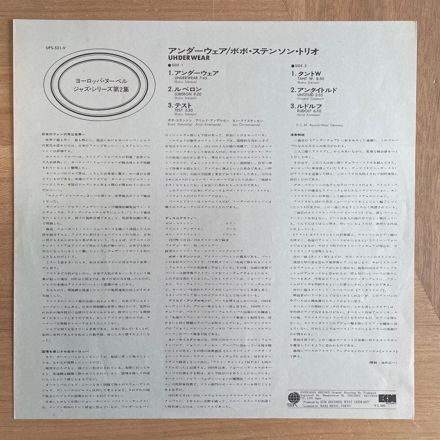 71年ecmからリリースされた日本・初回・overseas盤。ヨーロッパ・ヌーベル、ジャズ・シリーズの第2弾。スウェーデンのピアニスト、ボボ・ステンソンのデビューアルバム。6曲中4曲はオリジナルで、1曲はベーシスト、ARILD ANDERSENのオリジナル。もう1曲はORNETTE COLEMANの「UNTITLED」。ちなみにピアノトリオで、ドラムはJON CHRISTENSEN。