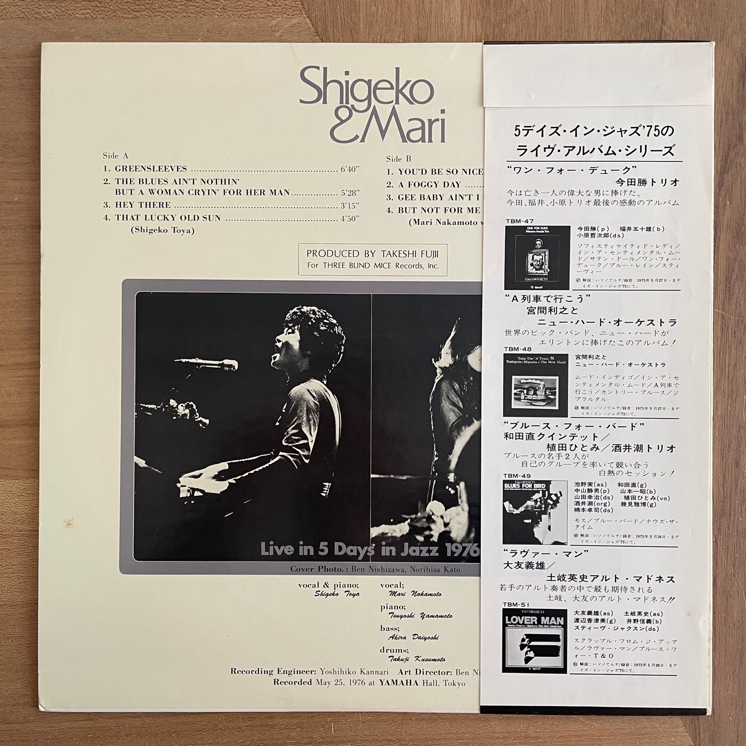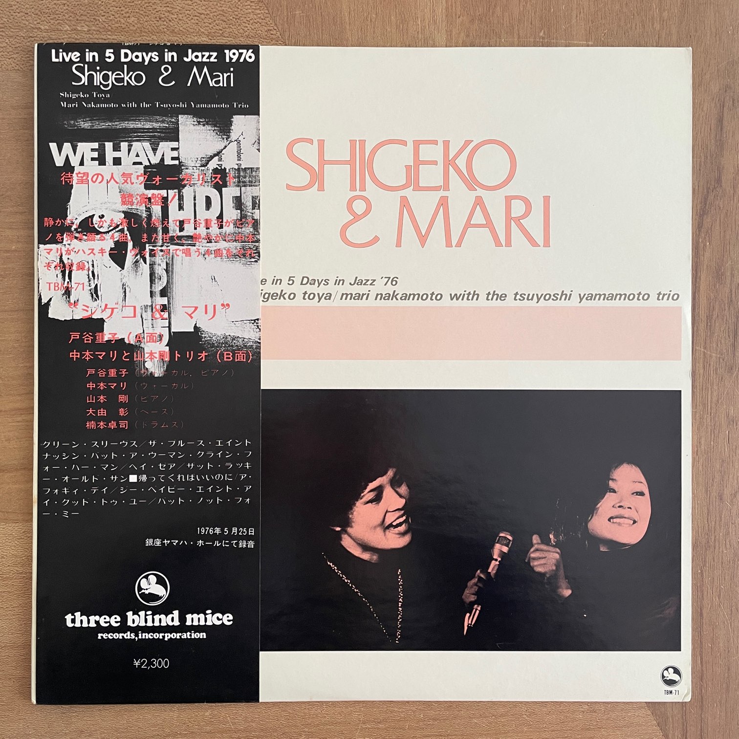 戸谷重子, 中本マリ / SHIGEKO & MARI 戸谷重子, 中本マリ / SHIGEKO & MARI / TBM-71 JP ORIG. 76年three blind miceからリリースされた日本・オリジナル。76年に5日間開催されたジャズフェスでのライブ音源。戸谷重子はピアノ弾き語りをA面に、B面には中本マリのボーカルで山本剛トリオがサポートしてる人気盤です。 盤質:A- ジャケット:角軽度スレ、ジャケ・帯裏に軽度しみ。冊子なし。 試聴 戸谷重子 / HEY THERE https://recordshopgg.com/wp-content/uploads/2026/01/戸谷重子1.m4a 中本マリ / YOU’D BE SO NICE TO COME HOME https://recordshopgg.com/wp-content/uploads/2026/01/戸谷重子2.m4a (商品コード: 5436) 在庫状態 : 在庫有り ¥12,800(税込) 数量
