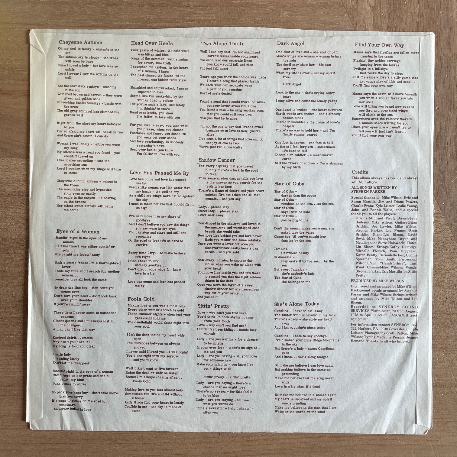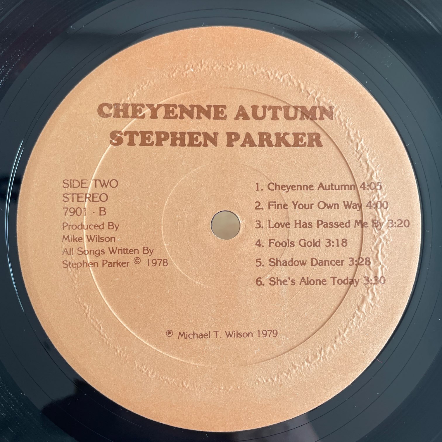 STEPHEN PARKER / CHEYENNE AUTUMN STEPHEN PARKER / CHEYENNE AUTUMN / 7901 US ORIG. PRIVATE PRESS 79年自主レーベルからリリースしたアメリカ・オリジナル・自主盤。たぶん唯一作の好内容のフォーク・ロック・アルバムで、試聴をどれにしようか悩みました。情報はほぼなくて、ペンシルベニア州周辺のミュージシャンということぐらいしかわかりませんでした。 盤質:A- ジャケット:7cm底抜け、天抜け4cm、軽度リングウェア、縁・角に軽度スレ。インナースリーブ縁抜け。 試聴 SITTIN’ PRETTY https://recordshopgg.com/wp-content/uploads/2026/02/STEPHEN-PARKER1.m4a SHE’S ALONE TODAY https://recordshopgg.com/wp-content/uploads/2026/02/STEPHEN-PARKER2.m4a (商品コード: 5460) 在庫状態 : 在庫有り ¥5,800(税込) 数量