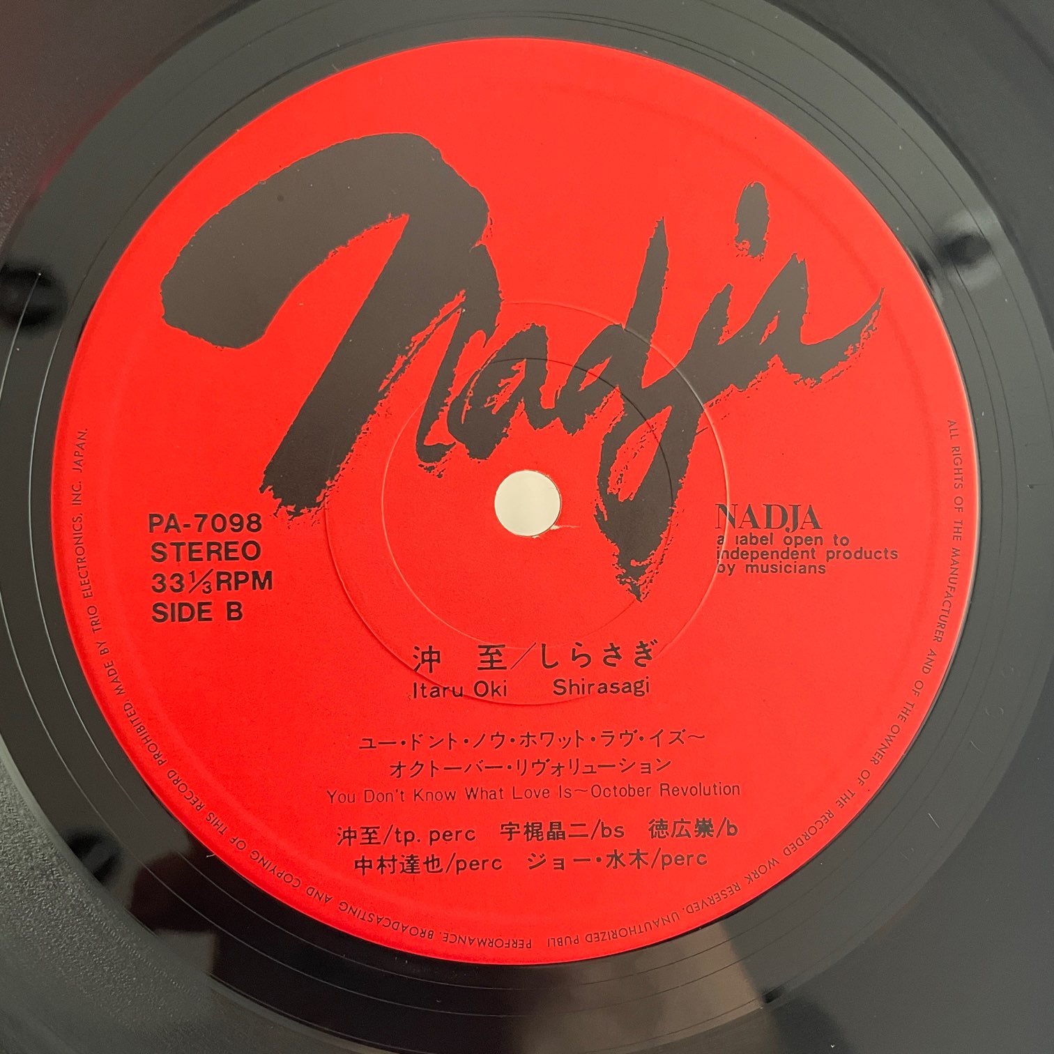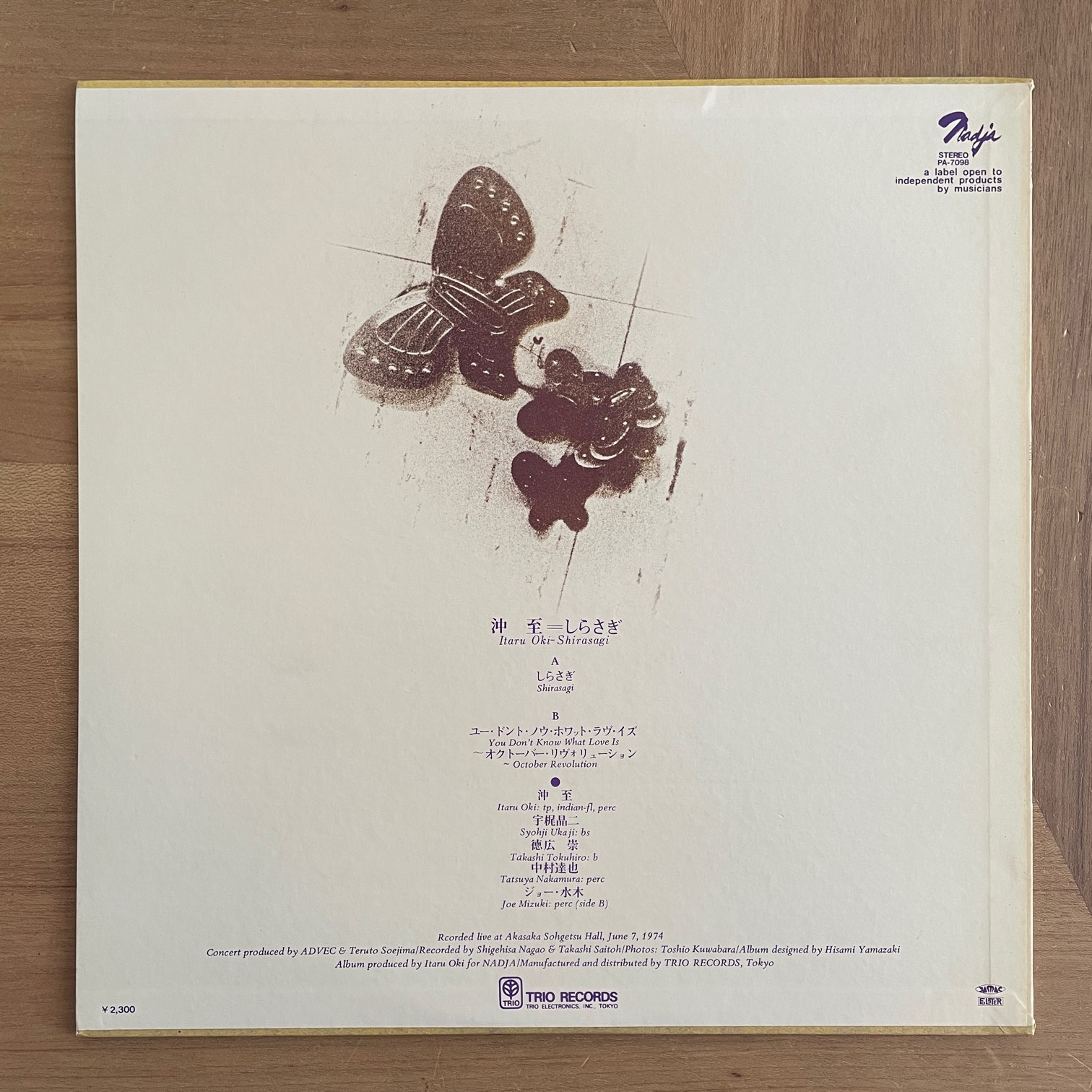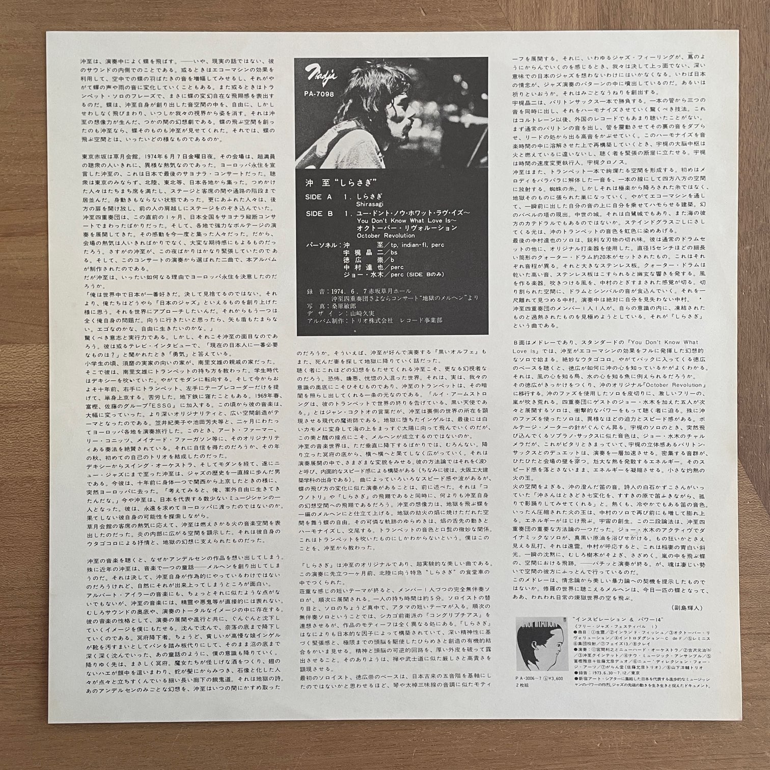 沖至 / しらさぎ 沖至 / しらさぎ / PA-7098 JP ORIG. 74年trioからリリースされた日本・オリジナル。74年6月に東京で行われたライブ。このライブは沖至がヨーロッパに移住する前のお別れライブということで超満員の会場で録音された、緊張感あふれるフリージャズ。宇梶昌二、徳広崇、中村達也、ジョー・水木が参加。 盤質: ジャケット:背に少ししみありますが概ね綺麗です。帯なし、ライナーあり。 試聴 しらさぎ https://recordshopgg.com/wp-content/uploads/2026/02/沖至1.m4a YOU DON’T KNOW WHAT LOVE IS https://recordshopgg.com/wp-content/uploads/2026/02/沖至2.m4a (商品コード: 5477) 在庫状態 : 在庫有り ¥6,800(税込) 数量