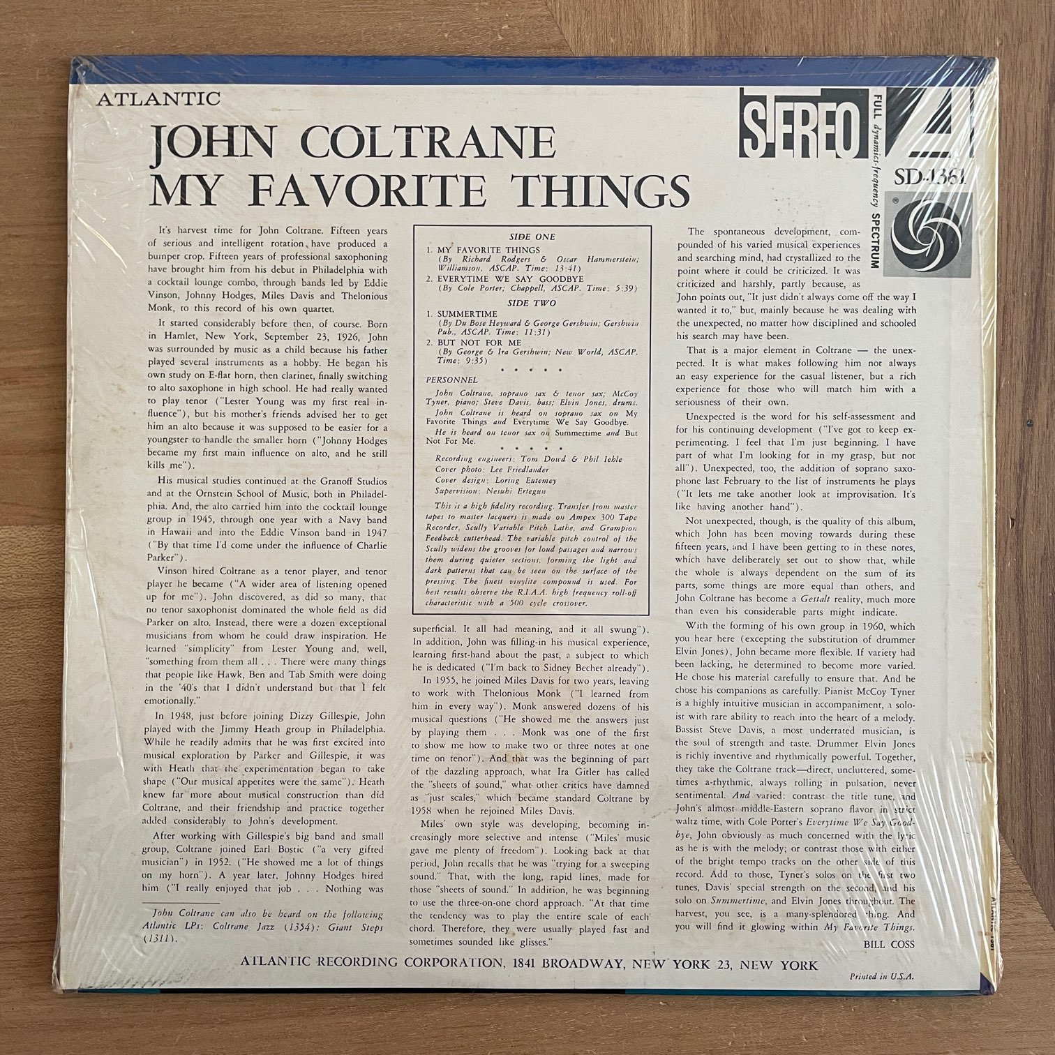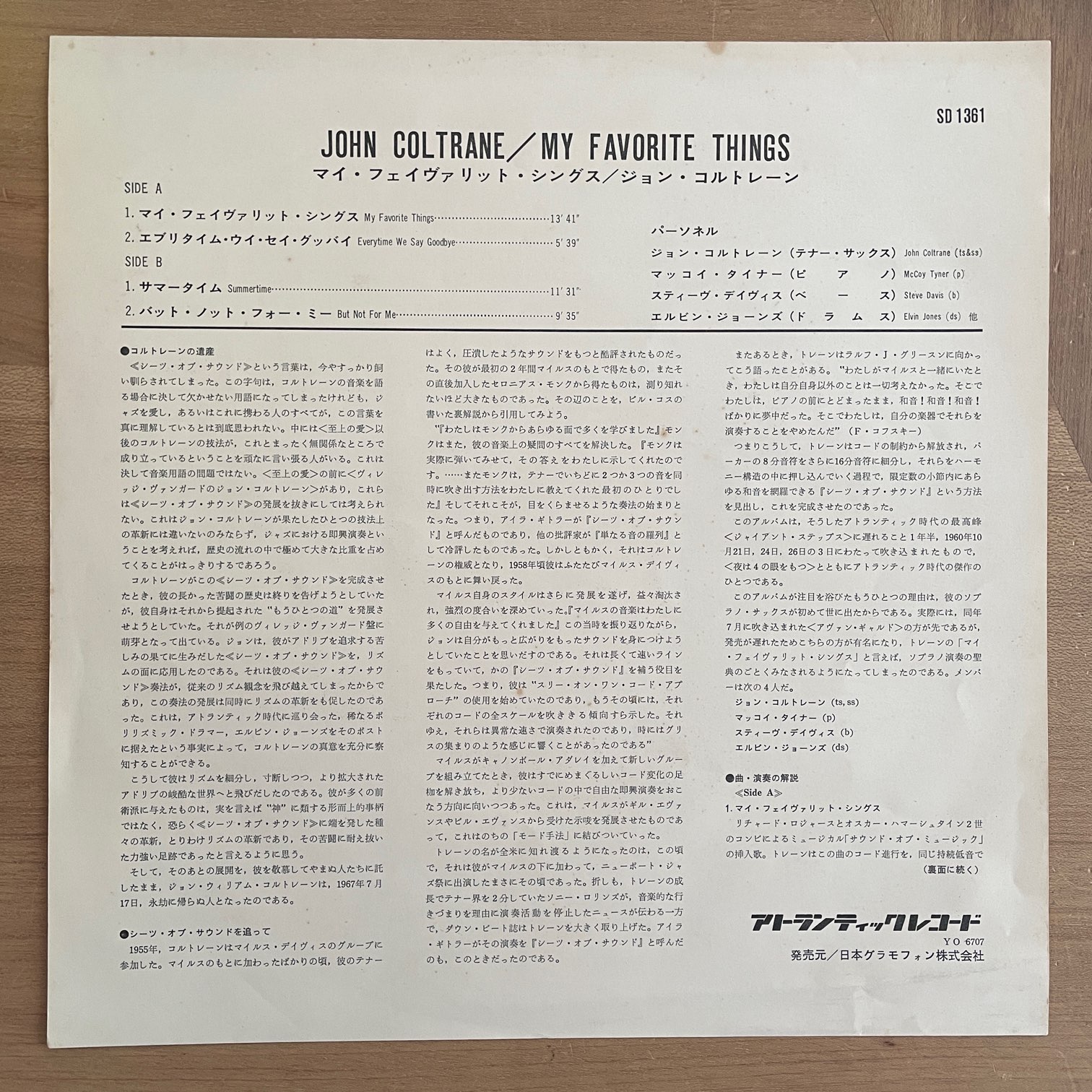 JOHN COLTRANE / MY FAVORITE THINGS JOHN COLTRANE / MY FAVORITE THINGS / SD1361 US REISSUE 69年?atlanticからリリースされたアメリカ・赤緑ラベル・直輸入盤。ソプラノ・サックスを大々的に使った初めてのアルバムでもあり、アルバムのタイトル曲はミュージカル『サウンド・オブ・ミュージック』の劇中曲ですが、14分にも及ぶモダン・ジャズの代名詞的演奏。 盤質:B+(B-2にノイズ出る箇所あり) ジャケット:シュリンクあり、裏しみ。 試聴 MY FAVORITE THINGS https://recordshopgg.com/wp-content/uploads/2026/02/MY-FAVORITE1.m4a BUT NOT FOR ME (B-2ノイズ箇所) https://recordshopgg.com/wp-content/uploads/2026/02/MY-FAVORITE2.m4a (商品コード: 5479) 在庫状態 : 在庫有り ¥2,500(税込) 数量