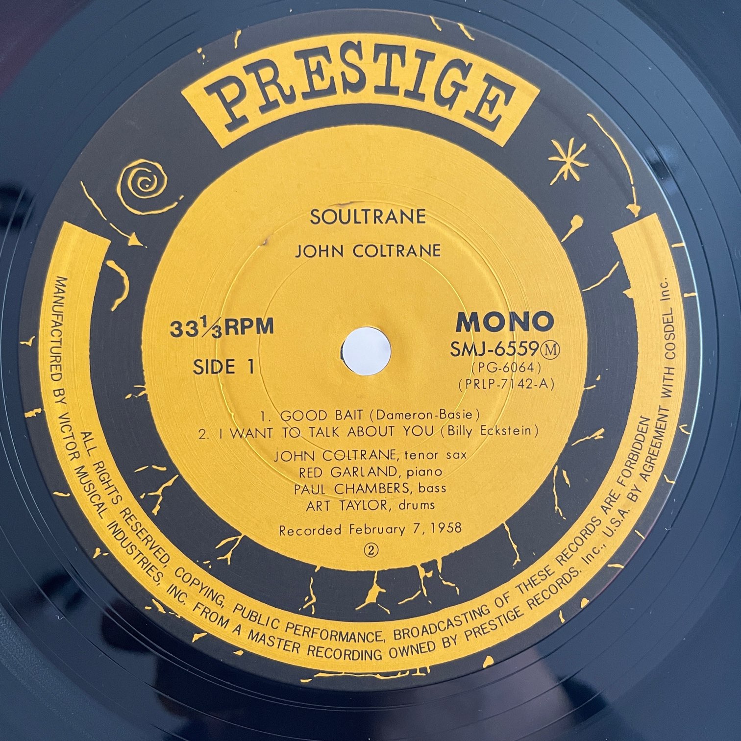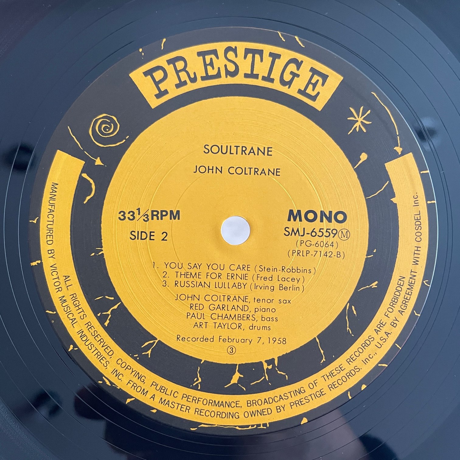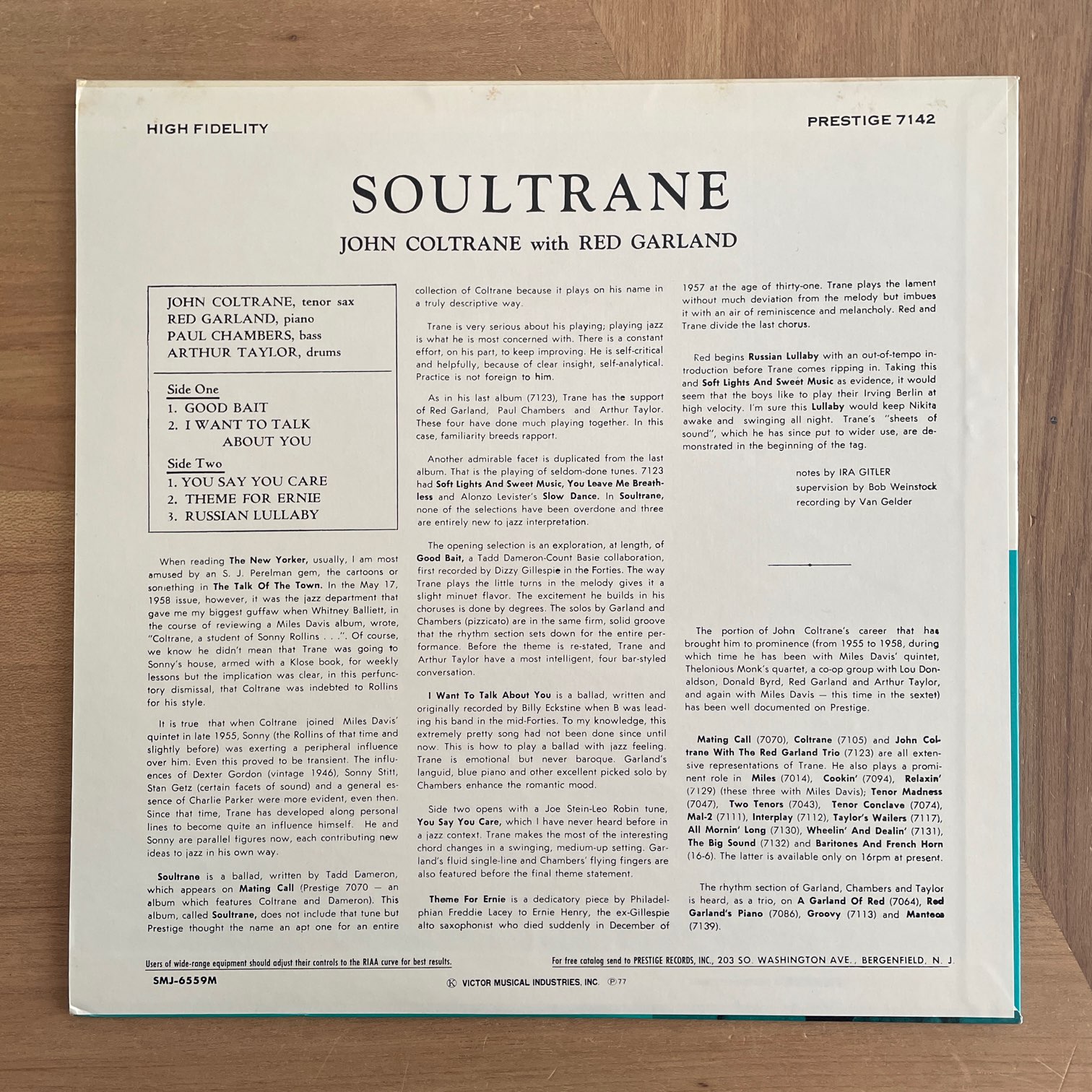 JOHN COLTRANE / SOULTRANE JOHN COLTRANE / SOULTRANE / SMJ-6559M JP REISSUE 再入荷 77年prestigeからリリースされた日本・再発盤。58年2月の録音で、この後マイルスがフランスから帰ってきて活動を再開するのでコルトレーンも参加してる、そんな時期です。RED GARLNAD,PAUL CHAMBERS,ARTHUR TAYLORとの素晴らしいカルテット。 盤質:A- ジャケット:両面軽度しみ、帯なし、ライナーあり。 試聴 I WANT TO TALK ABOUT YOU https://recordshopgg.com/wp-content/uploads/2026/02/SOULTRANE1.m4a YOU SAY YOU CARE https://recordshopgg.com/wp-content/uploads/2026/02/SOULTRANE2.m4a (商品コード: 5481) 在庫状態 : 在庫有り ¥2,300(税込) 数量