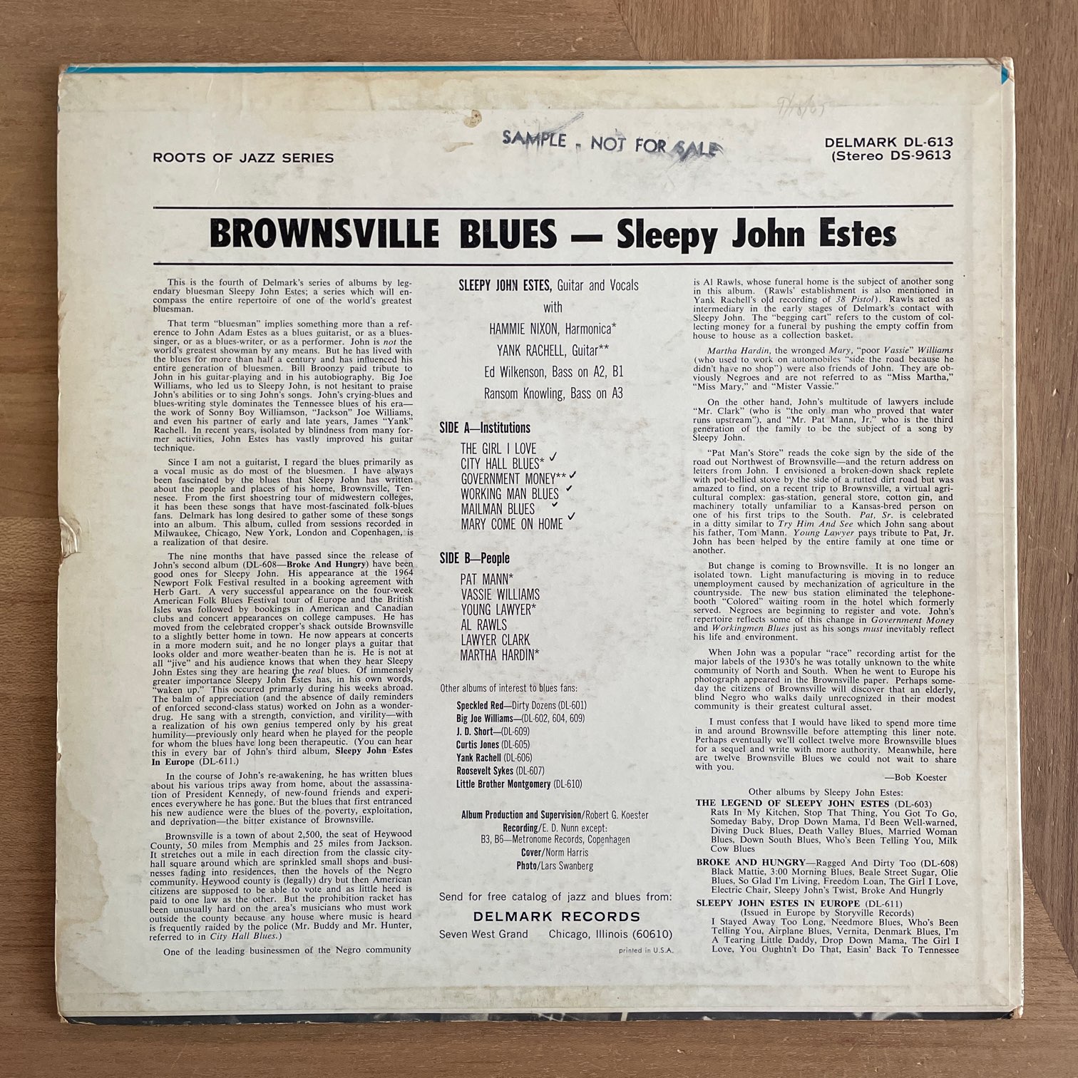 65年delmarkからリリースされたアメリカ・オリジナル・モノ盤。ラベルにプロモ・スタンプあり。テネシー州出身のブルースシンガーで41年には表舞台から姿を消したが、60年代のカントリー・ブルースが人気になり復活を遂げてリリースされたアルバムの一枚がこちら。この頃には全盲になっていたようでそれもあるのか?HAMMIE NIXON,YANK RACHELLとの共演が多く、これにも参加してます。