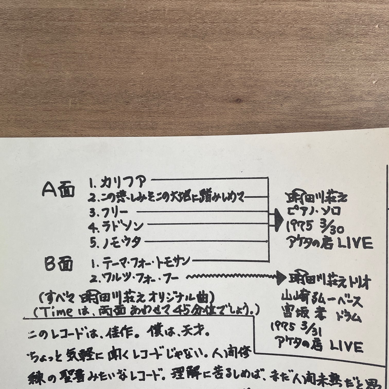 75年aketa’s diskからリリースされた日本・オリジナル・自主盤。西荻窪にあるアケタの店のオーナー兼ピアニスト・オカリナ奏者の明田川さんの1枚目で、レーベル第一弾アルバム。「ワルツ・フォー・フー」だけピアノトリオで山崎弘一、宮坂孝によるトリオ。ライナーを自分で書いてあって面白いですが辛口すぎて見せれません。笑