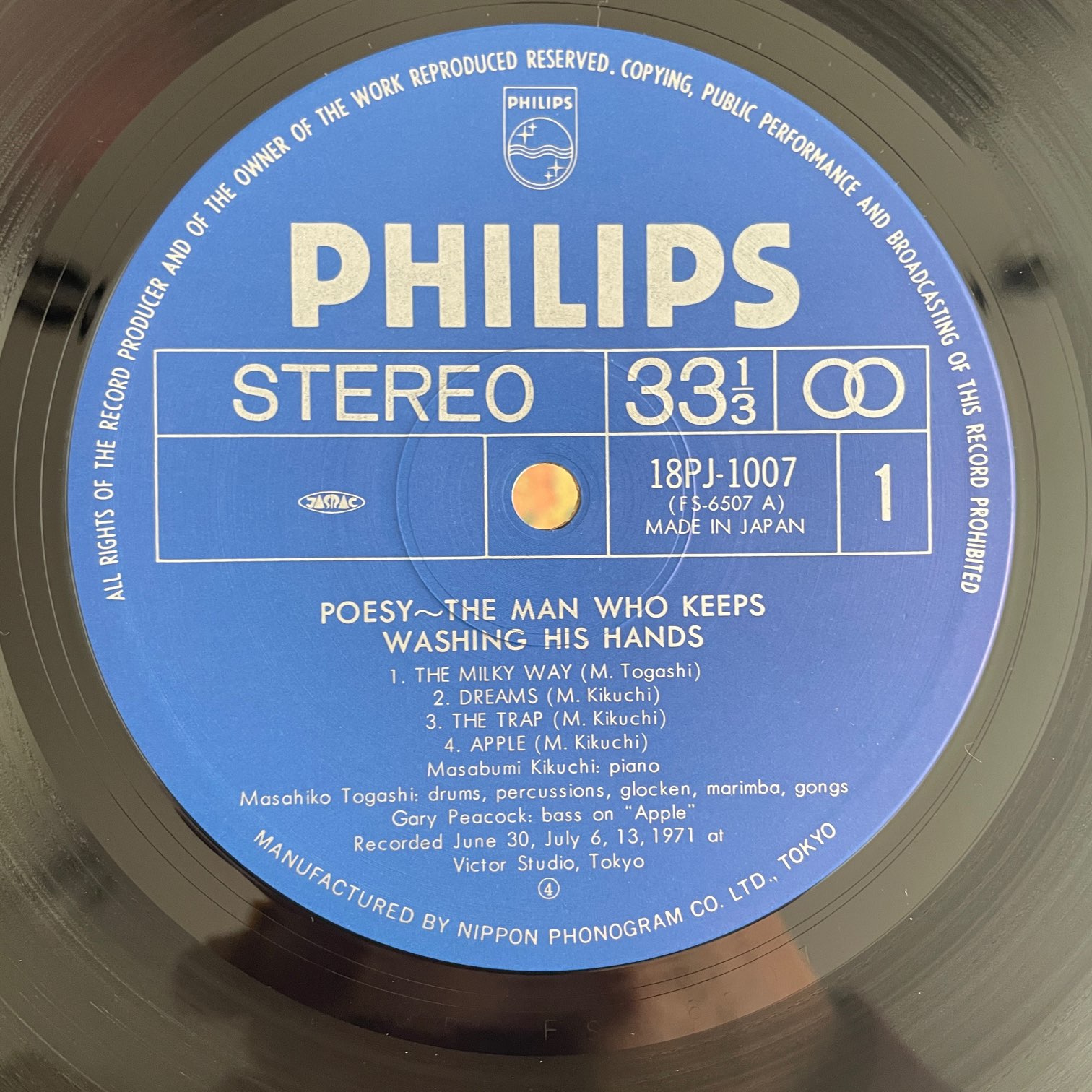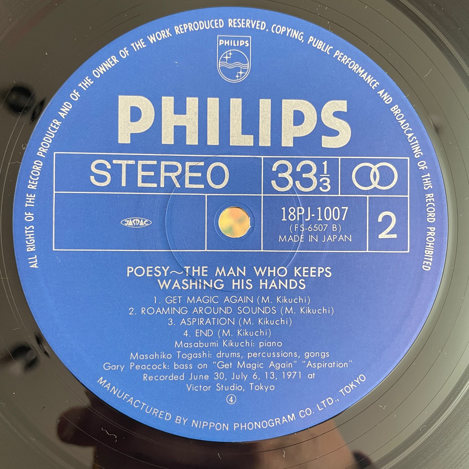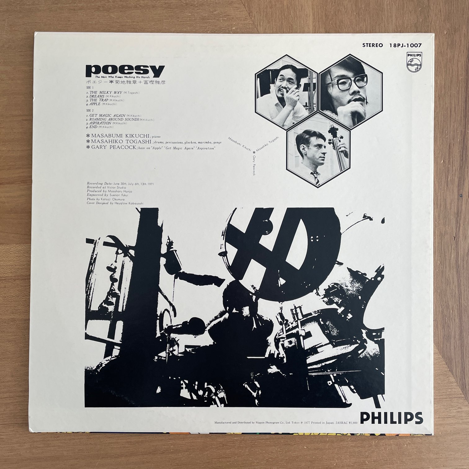 菊地雅章 + 富樫雅彦 / POESY 菊地雅章 + 富樫雅彦 / POESY / 18PJ-1007 JP REISSUE 77年philipsからリリースされた日本・再発盤。日本を代表するピアニストとパーカッショニストのデュオ。3曲でGARY PEACOCKが参加してます。フリージャズというより、アヴァンギャルドな作品でコンテンポラリージャズという枠だと思います。しかし、3人の対話のような音を聞き入ってしまう。 盤質:A- ジャケット:概ね綺麗です。帯・ライナーなし。 試聴 THE MILKY WAY https://recordshopgg.com/wp-content/uploads/2026/03/POESY1.m4a APPLE https://recordshopgg.com/wp-content/uploads/2026/03/POESY2.m4a (商品コード: 5577) 在庫状態 : 在庫有り ¥2,300(税込) 数量