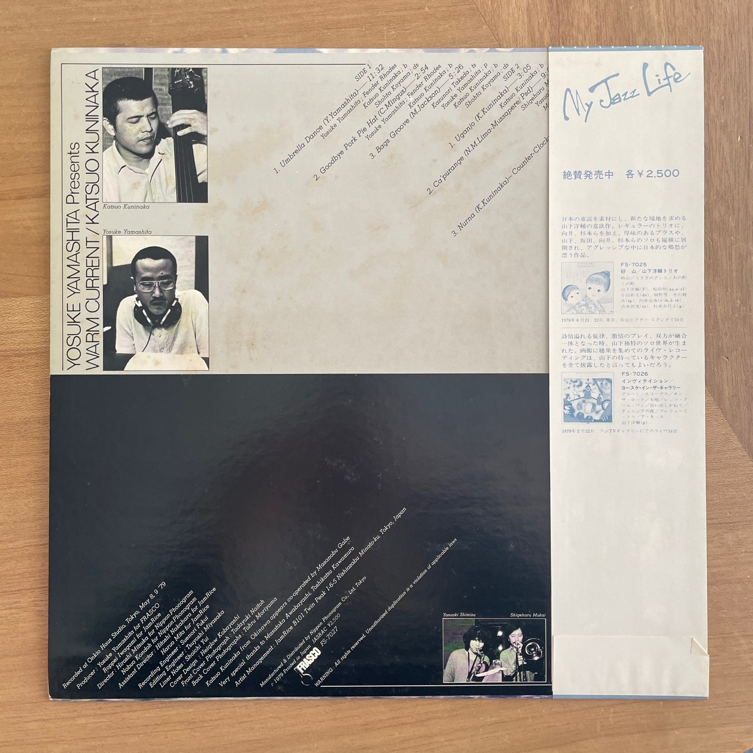 国仲勝男 / 暖流 国仲勝男 / 暖流 / FS-7027 JP ORIG. 79年frascoからリリースされた日本・オリジナル。山下洋輔が沖縄から招いたベーシスト・国仲勝男のデビュー作。そういうわけで、山下洋輔プレゼンツということになってます。A面は山下洋輔とのデュオ、トリオ、武田和命参加のカルテット。B面は山下不参加で佐山雅弘、古沢良治郎、清水靖晃などが参加。 盤質:A- ジャケット:両面しみ、軽度角潰れ。帯少ししみ、ライナーしみ。 試聴 BAGS GROOVE https://recordshopgg.com/wp-content/uploads/2026/03/国仲勝男1.m4a CA’PURANGE https://recordshopgg.com/wp-content/uploads/2026/03/国仲勝男2.m4a (商品コード: 5611) 在庫状態 : 在庫有り ¥3,500(税込) 数量