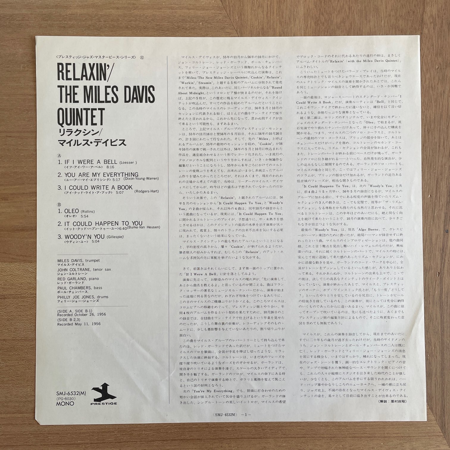 76年prestigeからリリースされた日本・再発盤・MONO。56年5月11日、10月26日の2日間にスタジオで録音をした伝説の”マラソン・セッション”。その録音から4枚がアルバムとしてリリースされましたが、その中の1枚。JOHN COLTRANE,RED GARLAND,PAUL CHAMBERS,PHILLY JOE JONESの最強メンバー。「YOU ARE MY EVERYTHING」のイントロ、緊張感あってカッコ良すぎる。
