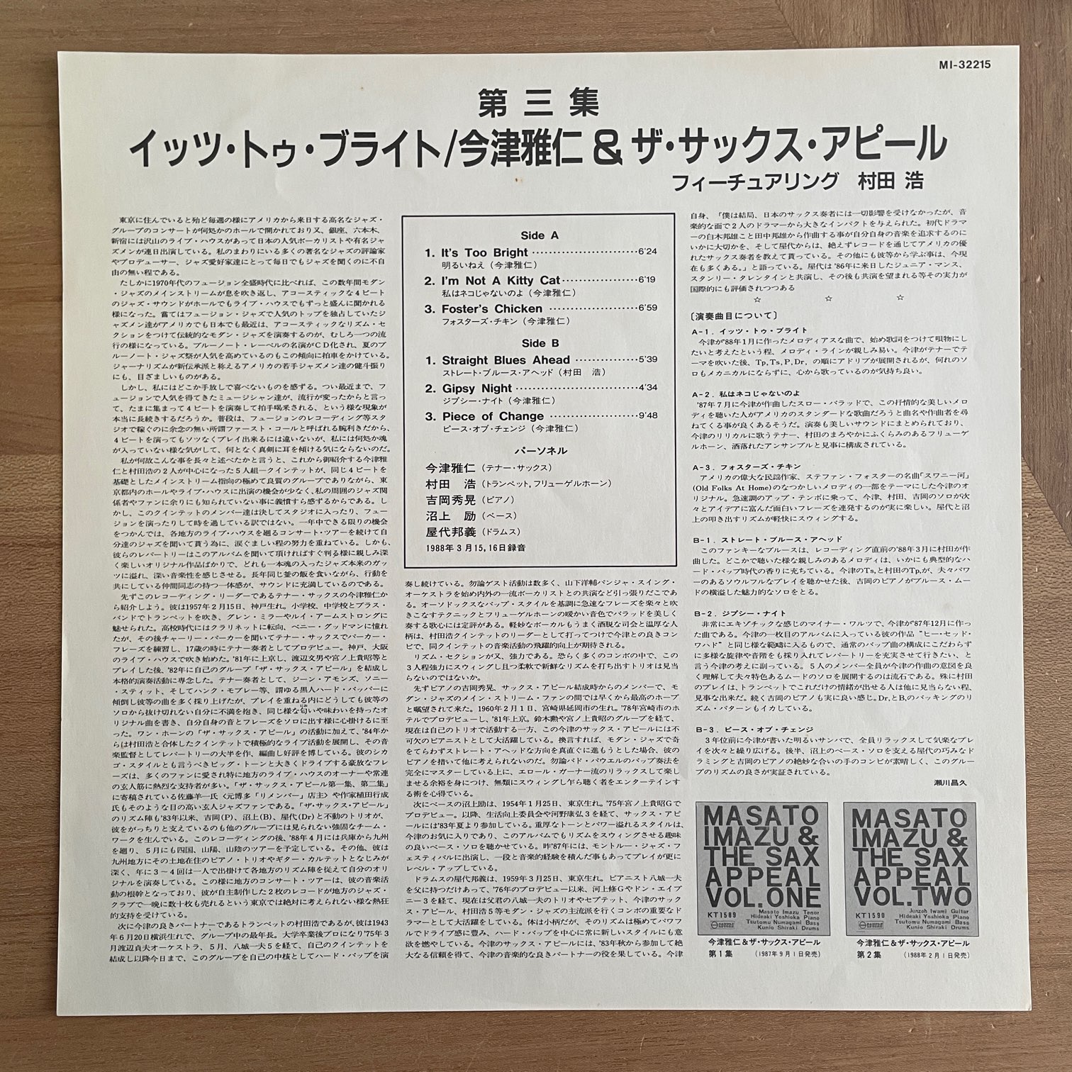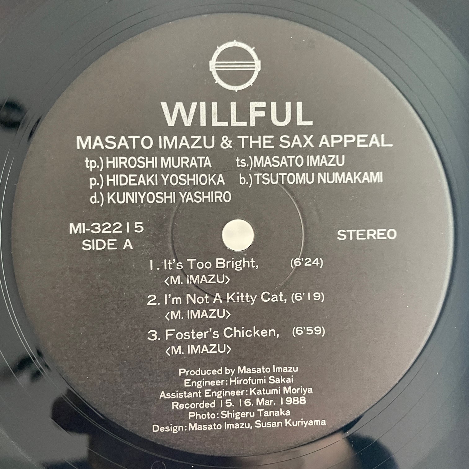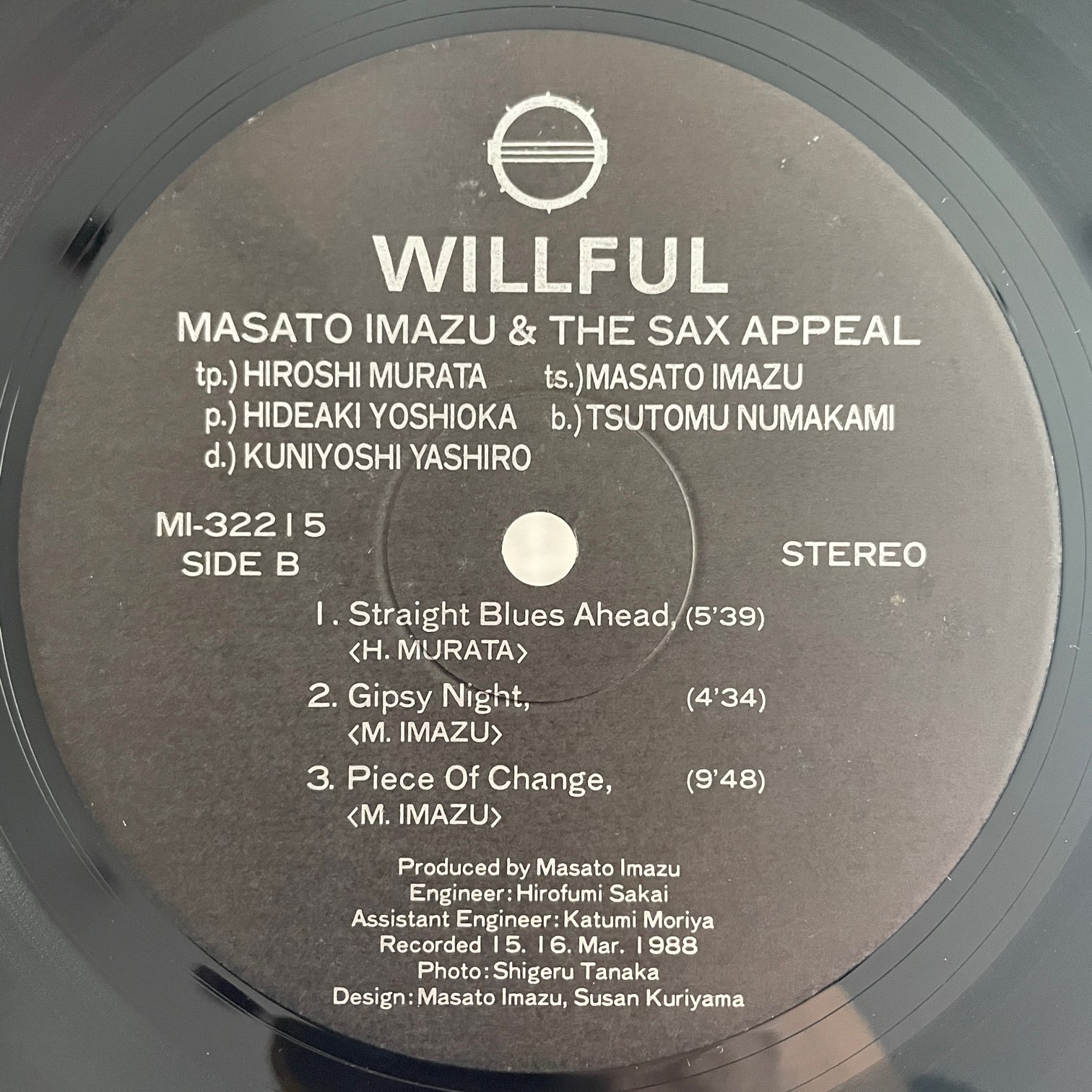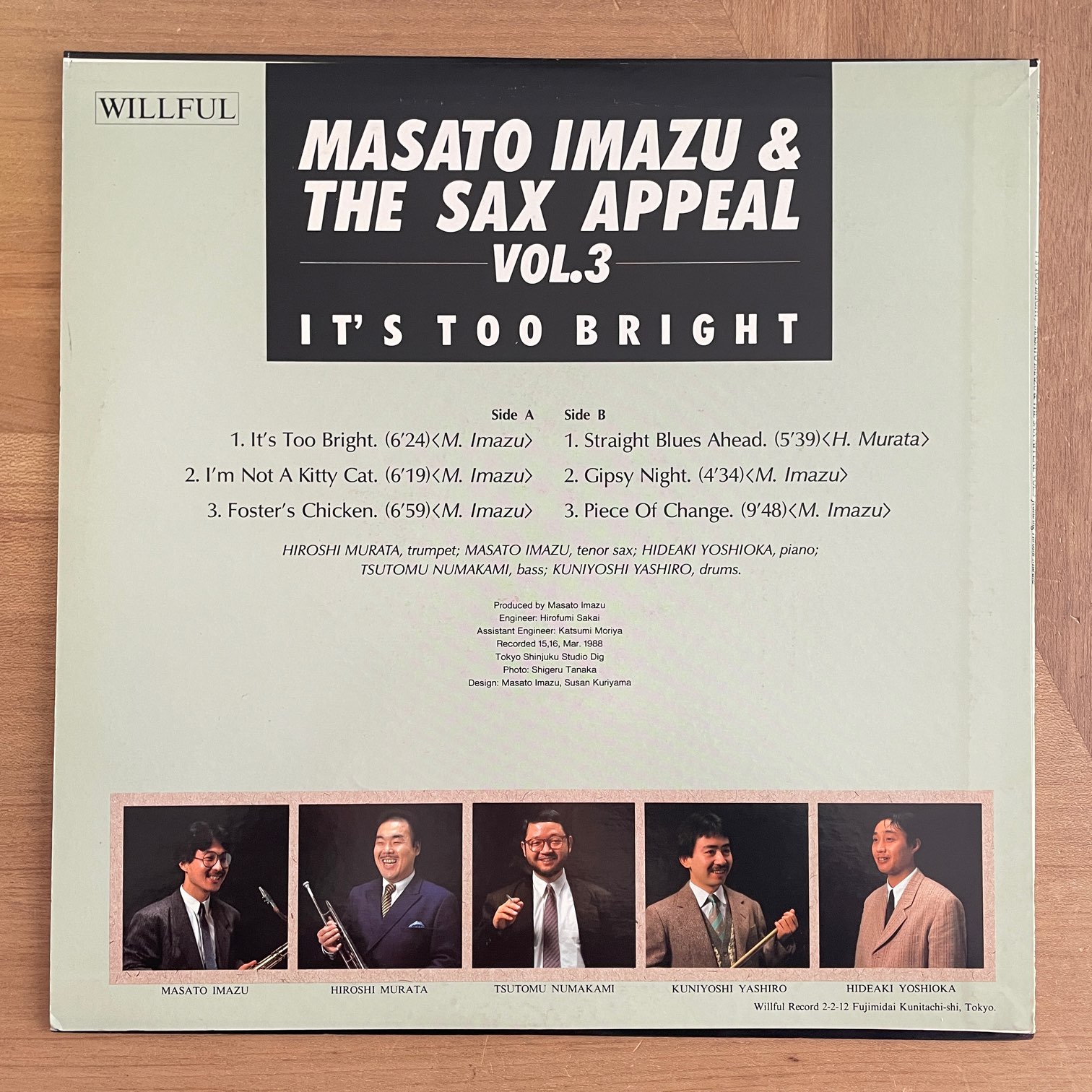 88年willfulからリリースされた日本・オリジナル・自主盤。MASATO IMAZU & THE SAX APPEAL VOL.3ということでこのシリーズの最後の一枚はジャケットが前の2枚とは違い写真になりました。裏も顔写真付きで、3回目の録音でリラックスしたのびのびとした普段通りの演奏が聞こえてるような感じがします。全曲今津さんのオリジナルで、トランペッターの村田浩さんがフューチャーされてるハードバップ。