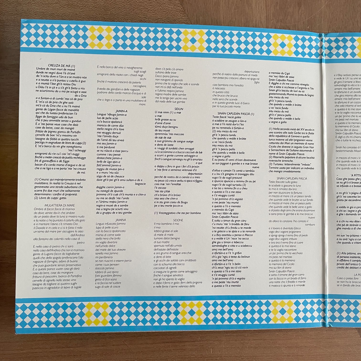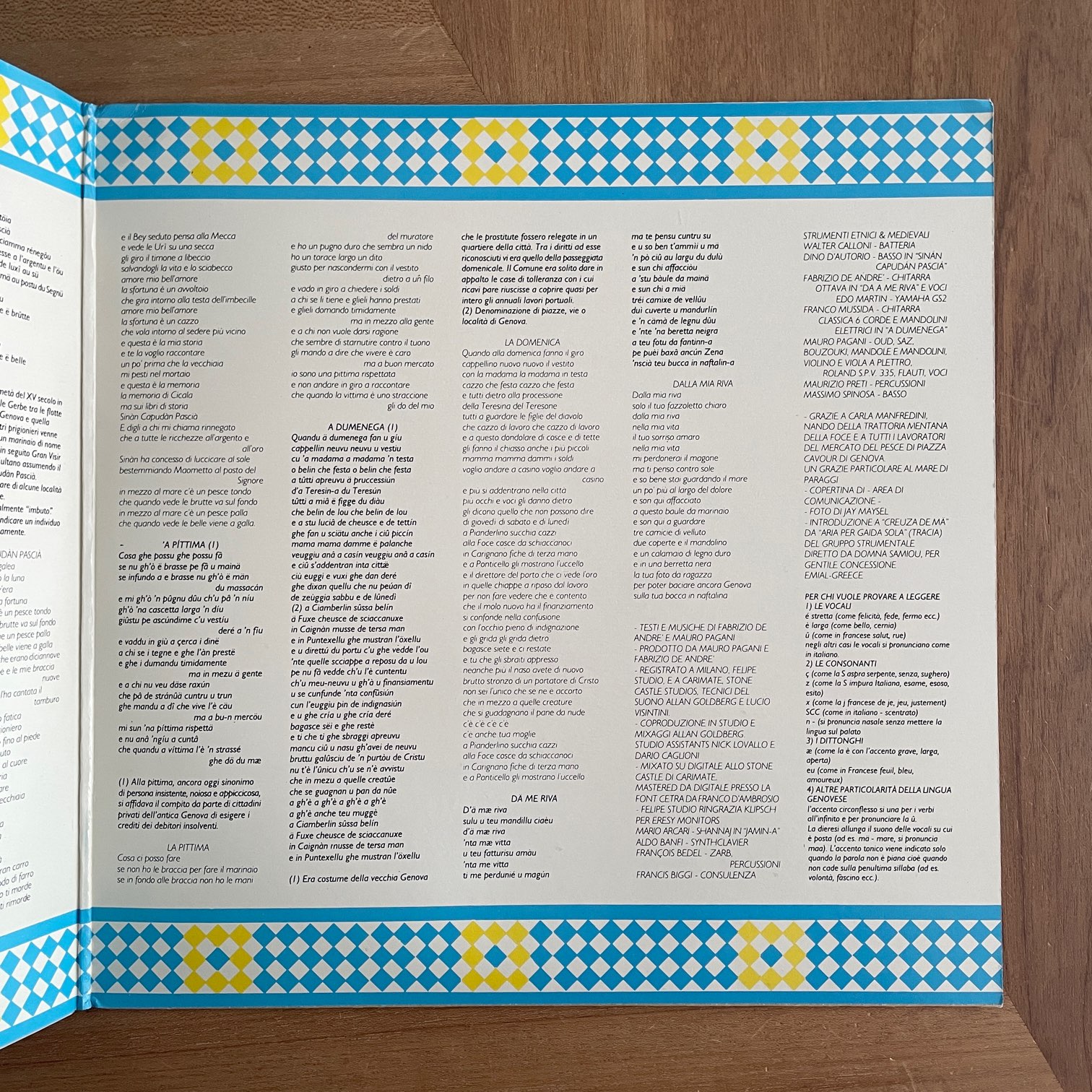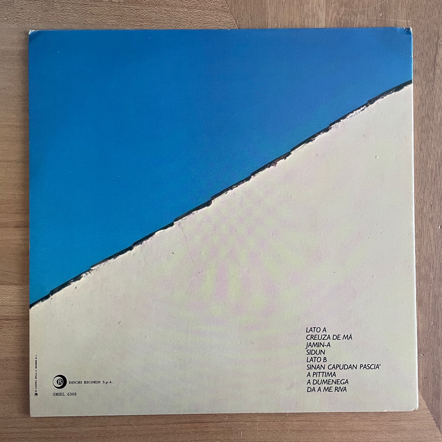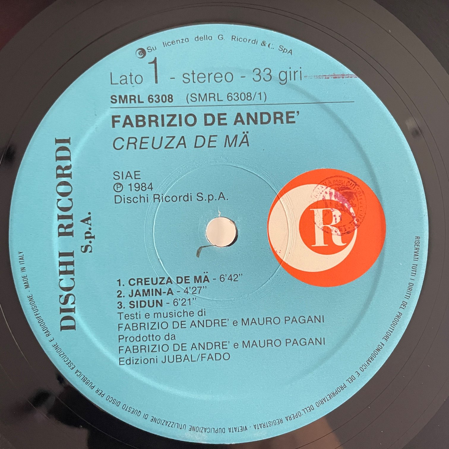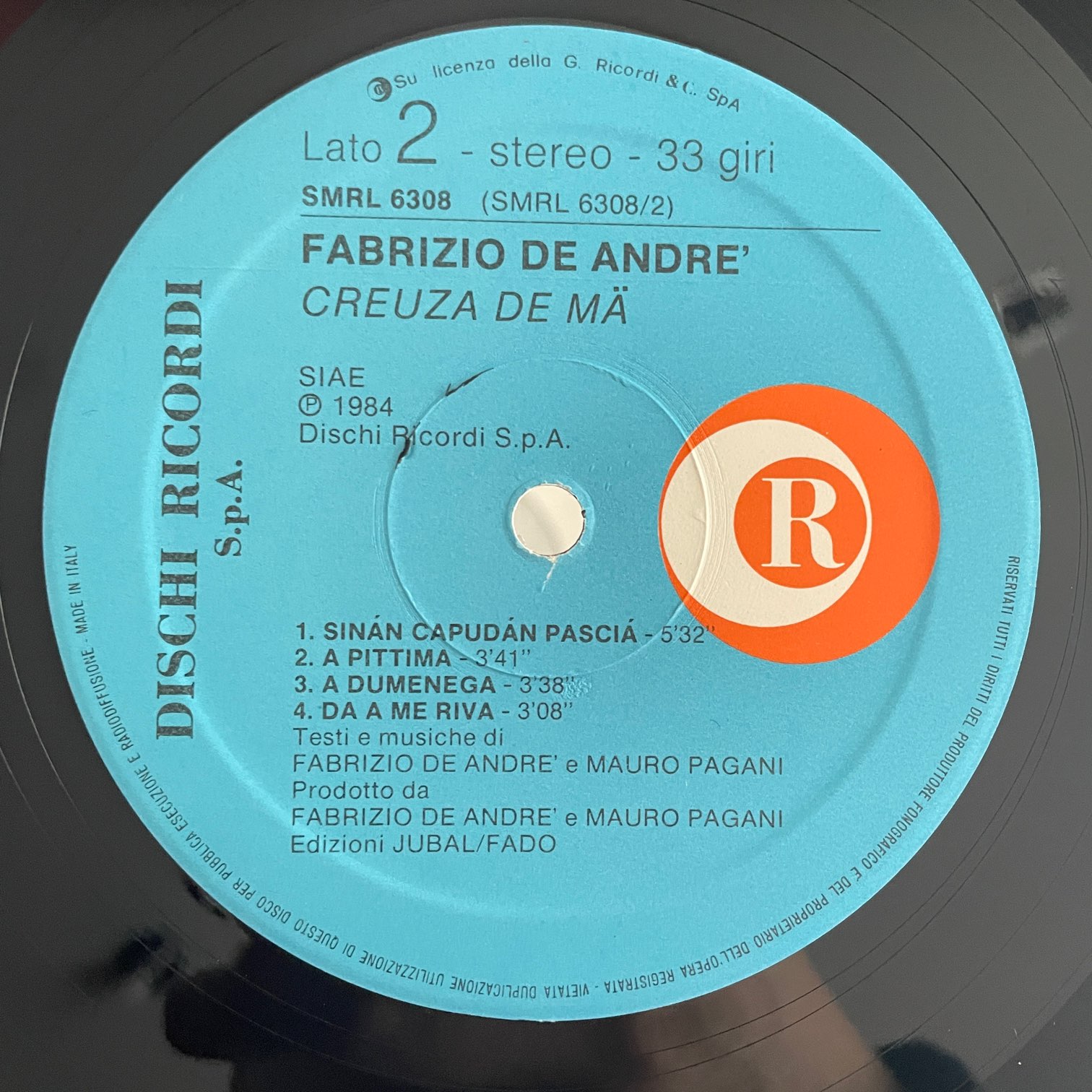 FABRIZIO DE ANDRE / CREUZA DE MA FABRIZIO DE ANDRE / CREUZA DE MA / SMRL6308 ITALY ORIG. 84年dischi ricordiからリリースされたイタリア・オリジナル。地中海音楽とイタリアのSSWの見事な融合で、昔から人気のある一枚で彼の代表作でもあります。元PFMのヴァイオリニストだったマウロ・パガーニなども参加してます。 盤質:A- ジャケット:2箇所角潰れあり、縁軽度スレ。 試聴 CREUZA DE MA https://recordshopgg.com/wp-content/uploads/2026/03/FABRIZIO-DE-ANDRE1.m4a DA A ME RIVA https://recordshopgg.com/wp-content/uploads/2026/03/FABRIZIO-DE-ANDRE2.m4a (商品コード: 5653) 在庫状態 : 在庫有り ¥8,800(税込) 数量