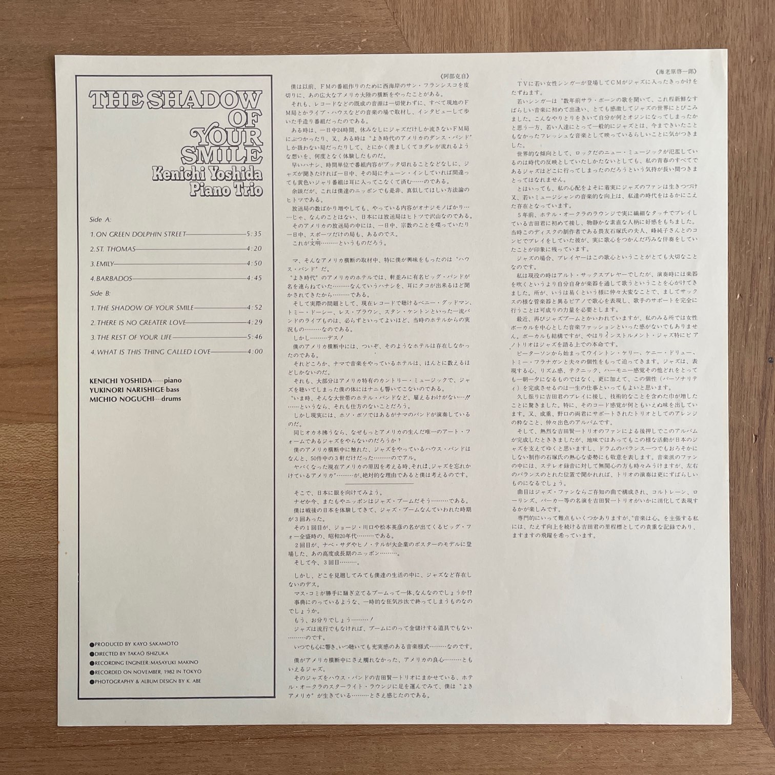 82年a&a recordsなる自主レーベルからリリースされた日本・オリジナル・自主盤。ホテルのラウンジのピアニストとして活動していた吉田賢一のピアノトリオアルバム。CD時代はわかりませんが、LPはこの一枚だけだと思います。ラウンジでの演奏よりも気合が入ってると思いますよ。バラードなんかはさすがです。