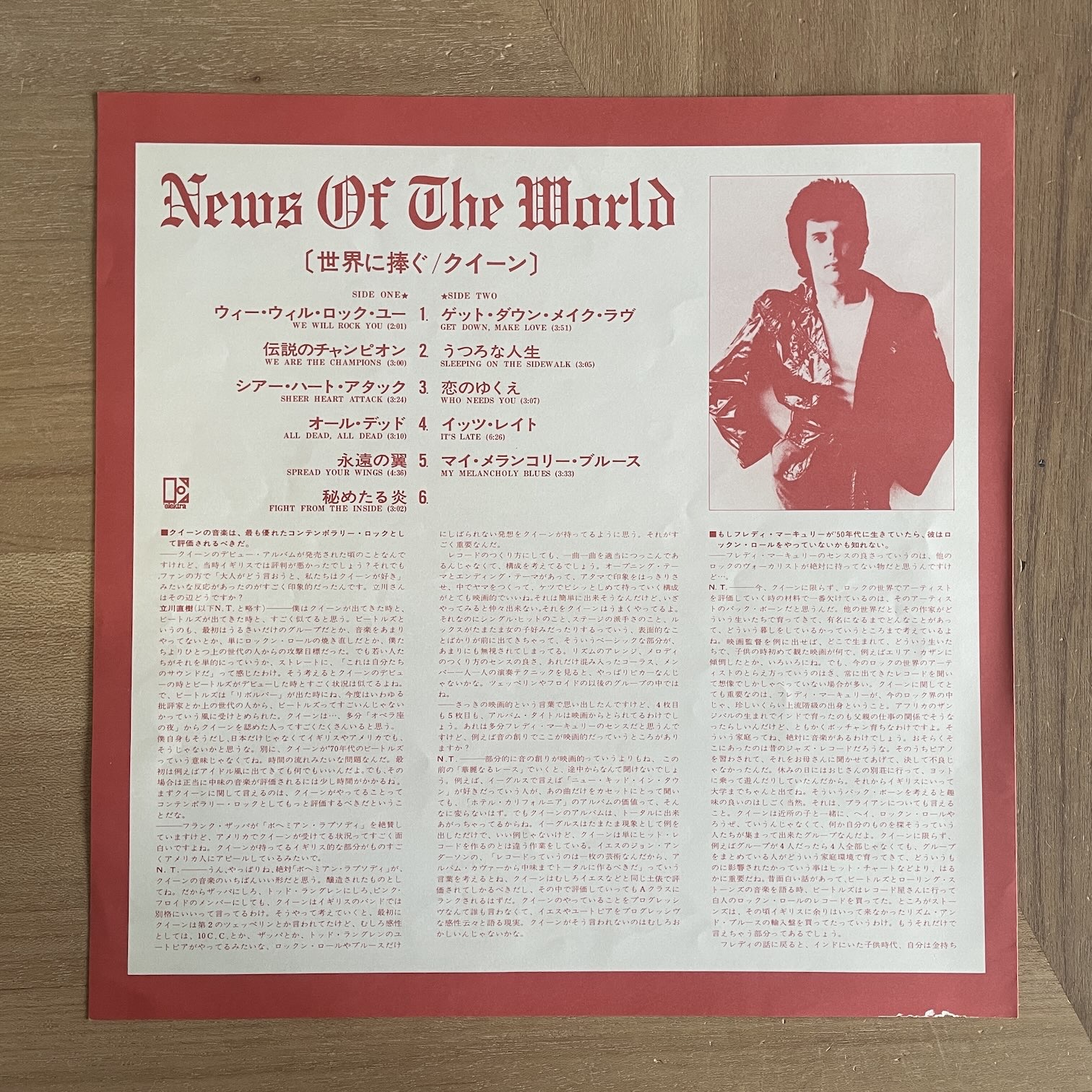 QUEEN / NEWS OF THE WORLD QUEEN / NEWS OF THE WORLD / P-6555E JP REISSUE 81年elektraからリリースされた日本・再発盤。イギリスのロックバンドの6枚目のアルバム。名曲「WE WILL ROCK YOU」「WE ARE THE CHAMPIONS」が収録されてる人気のアルバム。 盤質:A- ジャケット:背色褪せ、縁・角にすれ。帯なし、ライナーあり。 試聴 WE WILL ROCK YOU https://recordshopgg.com/wp-content/uploads/2026/04/NEWS-OF-THE-WORLD-1.m4a WE ARE THE CHAMPIONS https://recordshopgg.com/wp-content/uploads/2026/04/NEWS-OF-THE-WORLD-2.m4a (商品コード: 5949) 在庫状態 : 在庫有り ¥1,800(税込) 数量