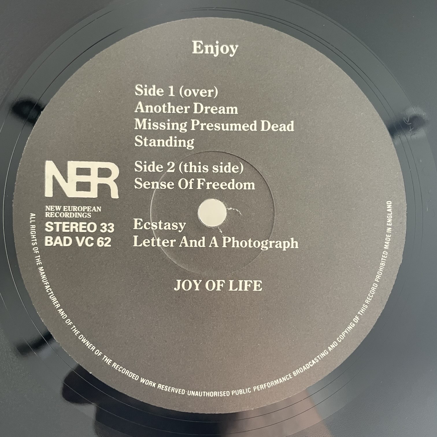 JOY OF LIFE / ENJOY JOY OF LIFE / ENJOY / BADVC62 UK ORIG. 85年NERからリリースされたイギリス・オリジナル。イギリスのNEW WAVE~POST PUNKバンドの1stミニ・アルバム。ノイジーなダークウェーブで、少しゴスがかってて、時代を感じられるしこういうの自分も含めて日本でも好きな人多そうだなぁと思う名作。 盤質:A-(軽度反り) ジャケット:両面軽度しみ、背周囲日焼け、表1箇所汚れ。 試聴 ANOTHER DREAM https://recordshopgg.com/wp-content/uploads/2026/04/JOY-OF-LIFE1.m4a SENSE OF FREEDOM https://recordshopgg.com/wp-content/uploads/2026/04/JOY-OF-LIFE2.m4a (商品コード: 5954) 在庫状態 : 在庫有り ¥5,800(税込) 数量