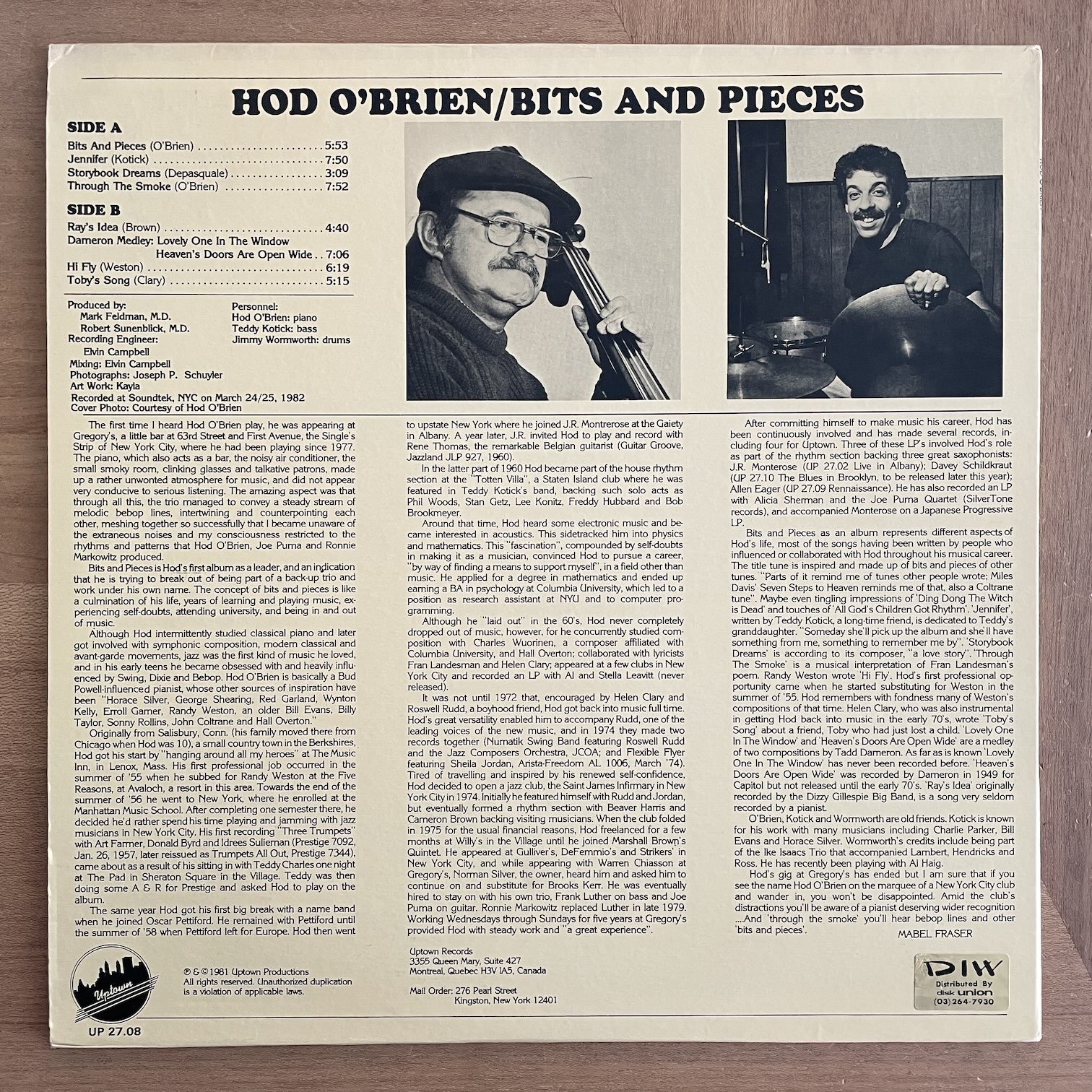 HOD O’BRIEN / BITS AND PIECES HOD O'BRIEN / BITS AND PIECES / UP27.08 US ORIG. 再入荷 81年uptown productionsからリリースされたアメリカ・オリジナル。ピアノトリオ好きな人たちからは人気のピアニストで、あまり知られてませんがサイド、リーダー作ともに多めです。歌心があってスウィングして、派手さはないですが好まれるのがわかるピアニストだと思います。 盤質:A- ジャケット:裏にDIWシール、表1箇所しみ、角わずかに潰れ。 試聴 BITS AND PIECES https://recordshopgg.com/wp-content/uploads/2026/04/HOD-OBRIEN1.m4a TOBY’S SONG https://recordshopgg.com/wp-content/uploads/2026/04/HOD-OBRIEN2.m4a (商品コード: 5987) 在庫状態 : 在庫有り ¥2,800(税込) 数量