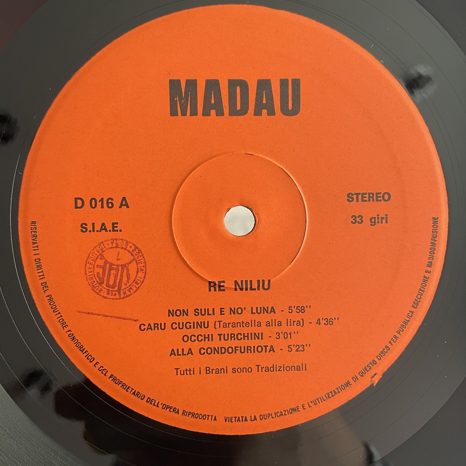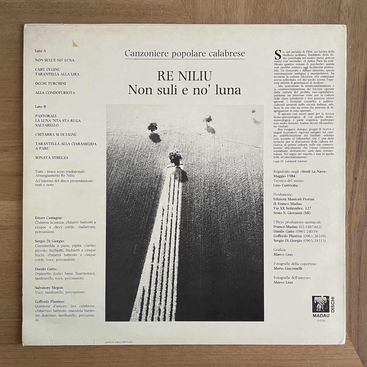 RE NILIU / NON SULI E NO’ LUNA RE NILIU / NON SULI E NO' LUNA / D016 ITALY ORIG. 84年madauからリリースされたイタリア・オリジナル・オレンジラベル。イタリアのフォーク・グループの1stアルバム。フォークロア色が強めのトラディショナル・フォーク。まだ見ぬ地中海沿岸の潮の香りや、ジャケットの両面に使われてるイタリアの写真家MARIO GIACOMELLIの写真のような土や草の香りも漂っている好内容。 盤質:A- ジャケット:両面しみ・汚れ、インナースリーブあり。 試聴 NON SULI E NO’ LUNA https://recordshopgg.com/wp-content/uploads/2026/04/RE-NILIU-1.m4a PASTORALE https://recordshopgg.com/wp-content/uploads/2026/04/RE-NILIU-2.m4a (商品コード: 5991) 在庫状態 : 売り切れ 只今お取扱い出来ません